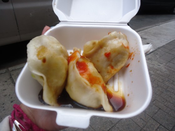 Next stop, dumplings. I was apprehensive about this stop because dumplings are generally made with green onions, and I knew that I would not want to have any. But I was part of a group, so I would have to either sit this one out or try something else on the menu. So off we went to get our 4 for $1 famous dumplings.