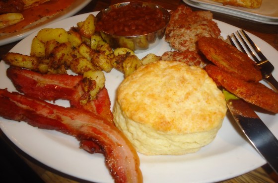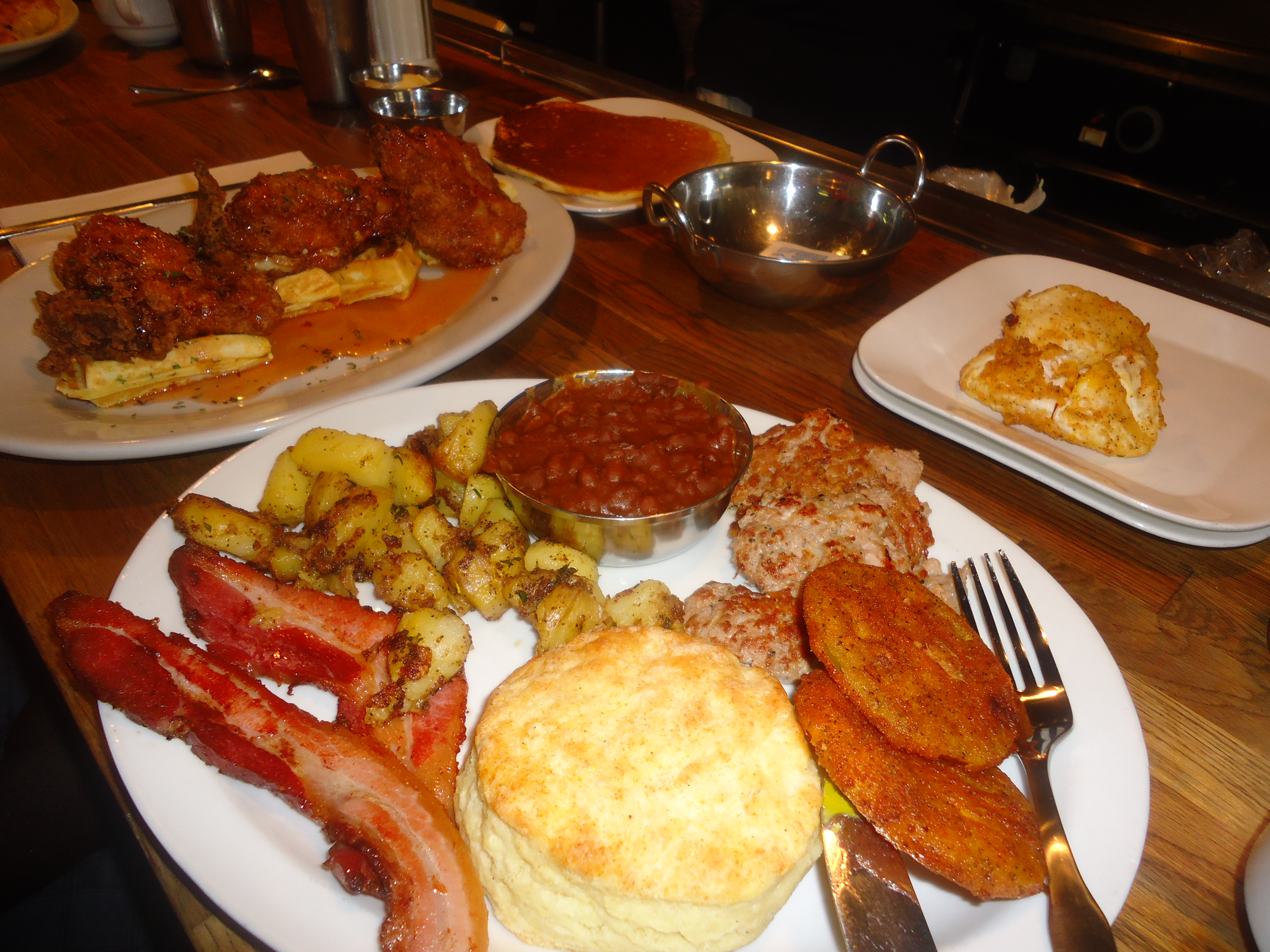 Several minutes later we got the whole 9 yards. Literally. And wow, we got our food within 5 minutes. Crazy quick! It consisted of fried green tomatoes, bacon, hash browns, sausage patties, refried beans, 2 deep fried poached eggs and a massive buttery biscuit. My friend and I stared at the food in awe. That is a lot of food! Where do we begin? So we strategized (i.e., he started with the chicken and waffles and I started with the whole 9 yards). But that is not all folks. As I maneuvered around the food feeling absolutely giddy, the chef put a pancake in front of me and said, “this is for you.” Awwww really? For me? But in all honesty, I was not sure if what I was feeling was appreciation or plain old panic. How am I going to eat ALL this?! Ha! But I am brilliant! Whatever we do not finish, I get to take home. Duh! So I got back to business and attacked the feast.