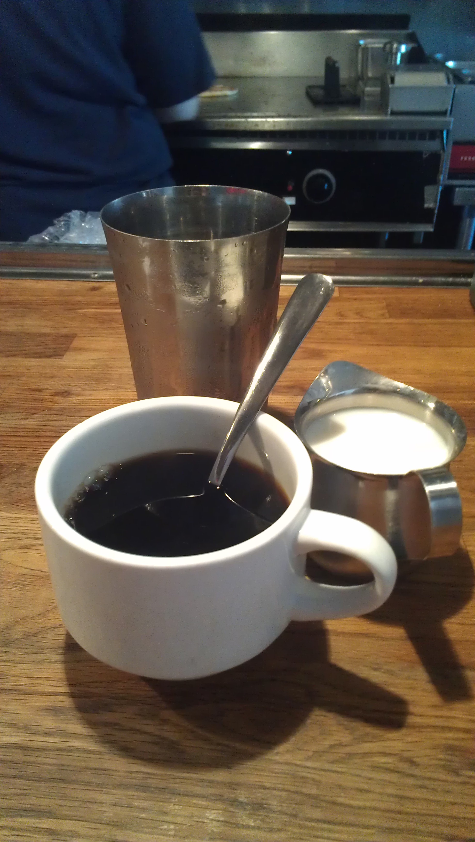 Started off by ordering a glass of water and a coffee with milk. While we were reviewing the menu, the guy sitting next to my friend received his order and wow, it looked delicious. And it was huge! So we began to scan the menu to see what it was and my friend pointed out that it looked like “the whole 9 yards.” So it was settled, we were going to get the chicken and waffles and the whole 9 yards.