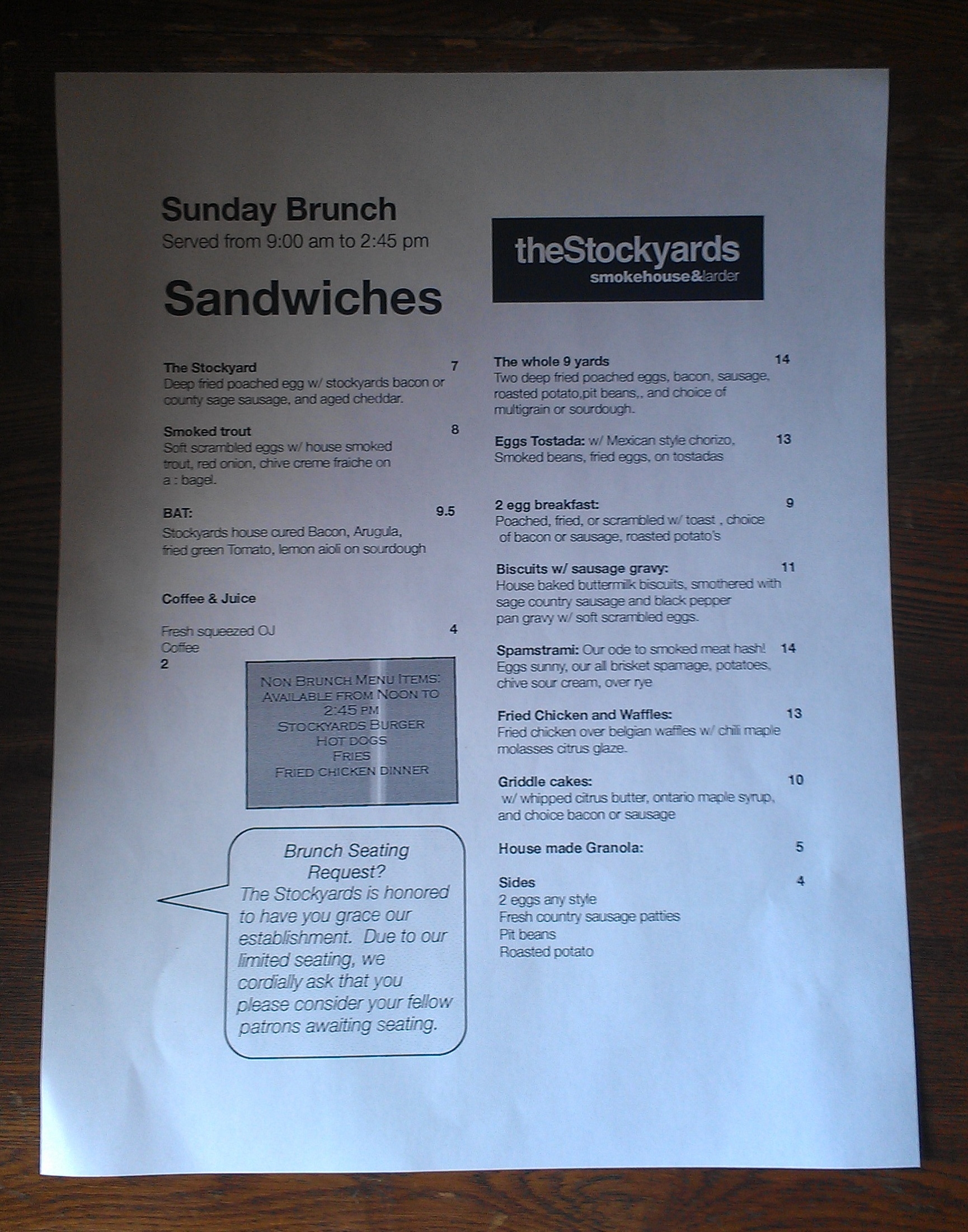 When I went to NYC this summer I had the opportunity to try chicken and waffles in Harlem for the first time. So what can I say? I fell in love. So when I returned to Toronto I was on a mission to find the best chicken and waffles in the city. I was surprised by the limited amount of establishments that offer chicken and waffles in downtown Toronto. There was however one establishment that has consistently received good reviews, so one Sunday morning I managed to talk a friend into joining me on a Southern brunch journey at The Stockyards on St. Claire West.
