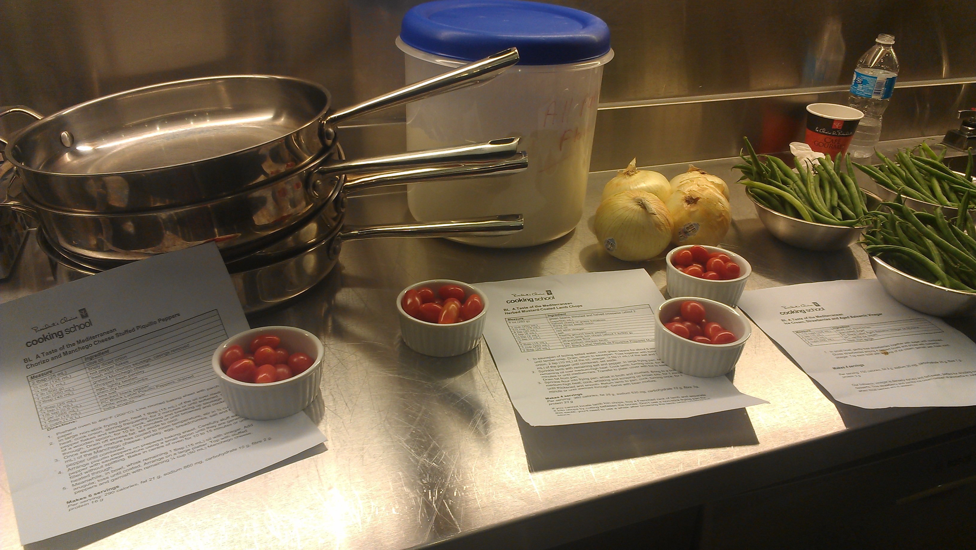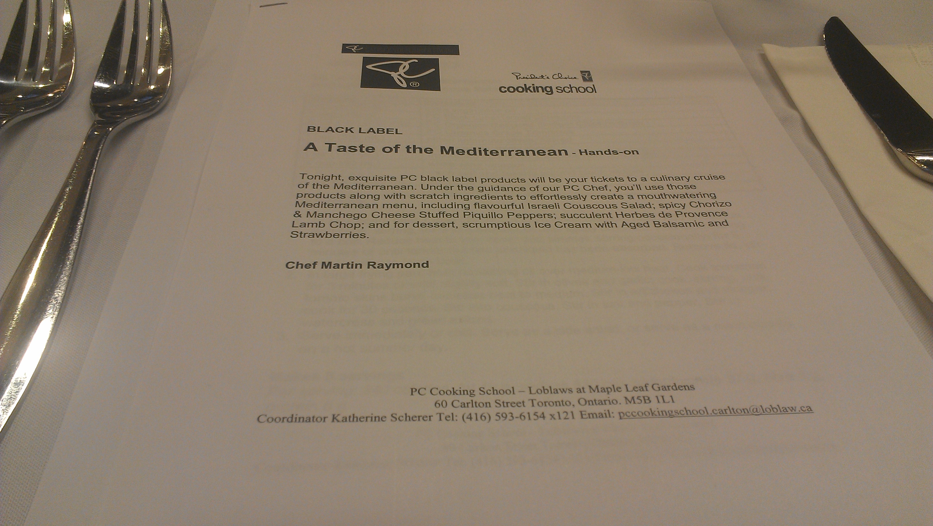I spent one Sunday evening browsing through the cooking classes they have available on their site (http://www.pccookingschool.ca/LCLOnline/) and chose to sign up for the “A Taste of the Mediterranean” class.  Unfortunately, I was unable to sign up for the class and I kept receiving an “error” message when I tried to process my request. I e-mailed the cooking school coordinator Sunday evening and summarized the problem I was experiencing. Monday morning I received an e-mail and telephone call from Katherine, the cooking school coordinator at the Carlton location, and immediately she rectified the problem. I was incredibly impressed by the customer service I had received and this only made me more excited to see what this class was going to be like. But I have to be honest, I was not expecting much more than a demo since the class, with taxes included, came to a total of $22.60. Too good to be true?