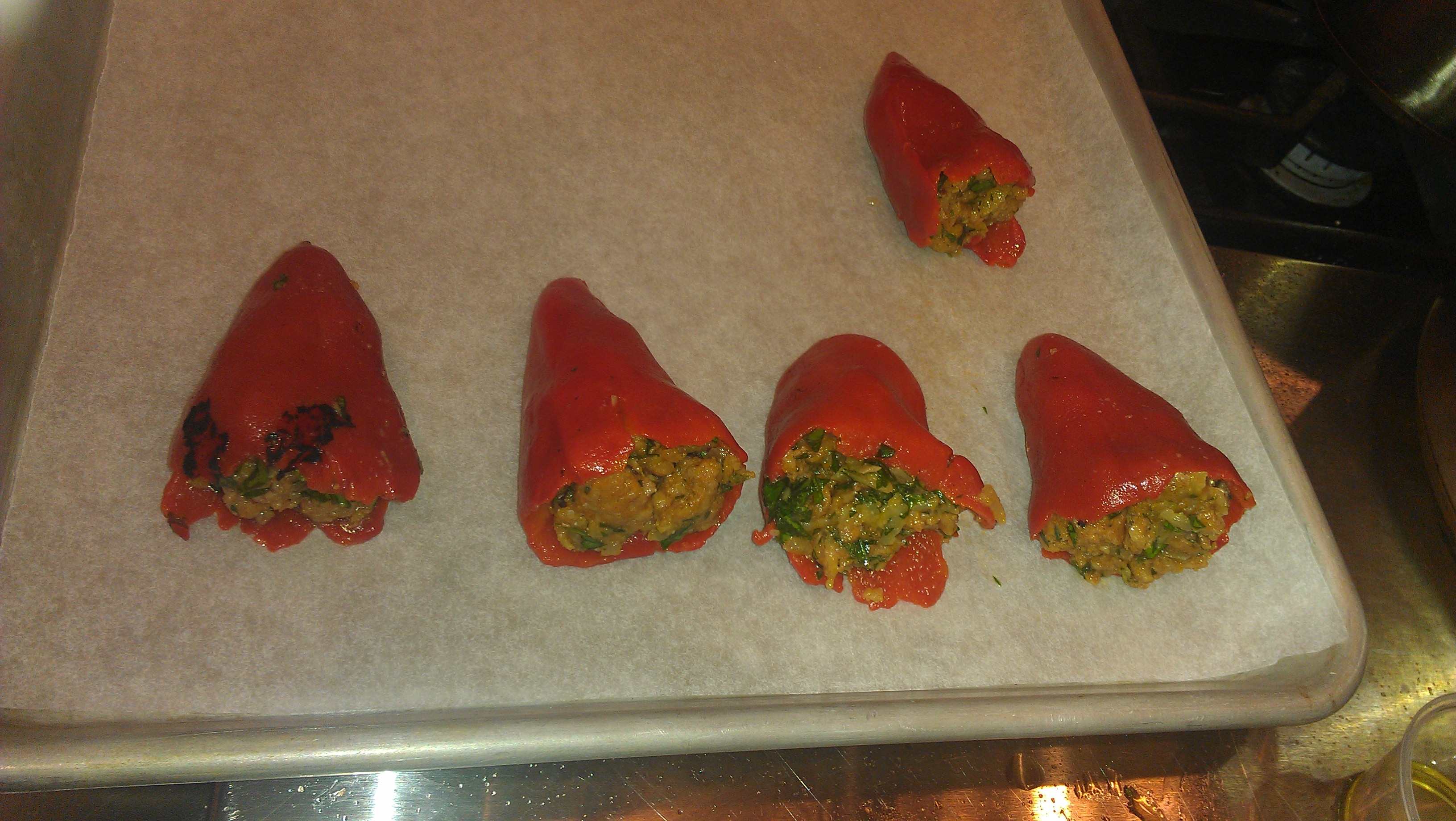 Stuffing the peppers. We all took turns stuffing our peppers. We could have labelled our peppers, but our group all bonded through the cooking process, so we had a “communal” tray.