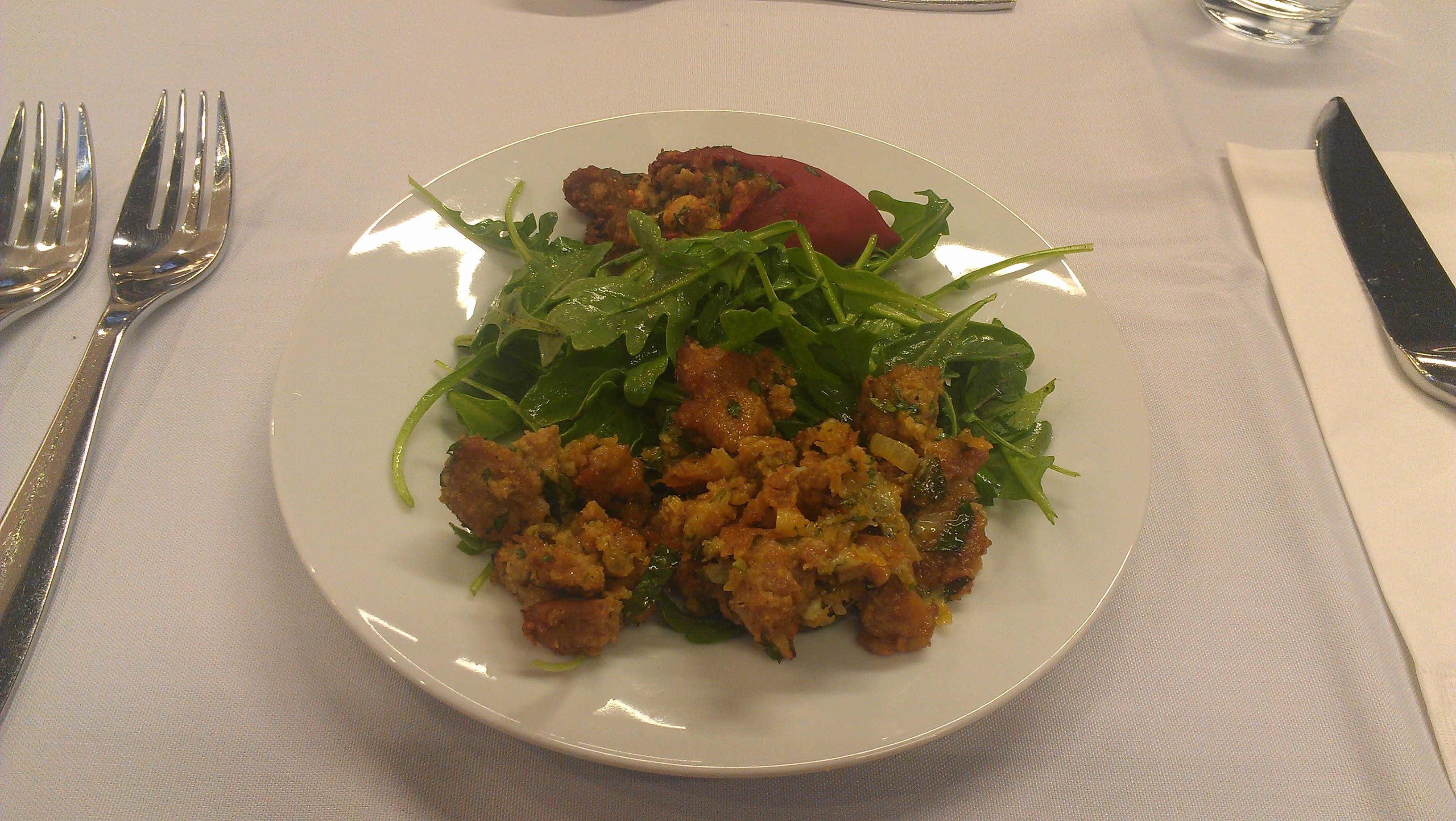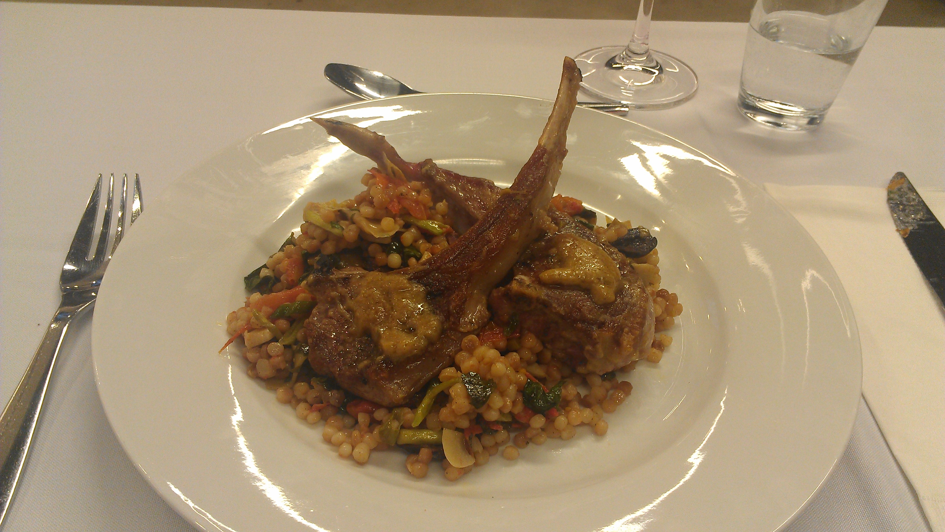 Delicious Israeli couscous salad. We actually cooked this early on, but we ate it with the 2nd course. I had never had Israeli couscous before. Since taking this class, I have had it 3 times. It is that delicious.