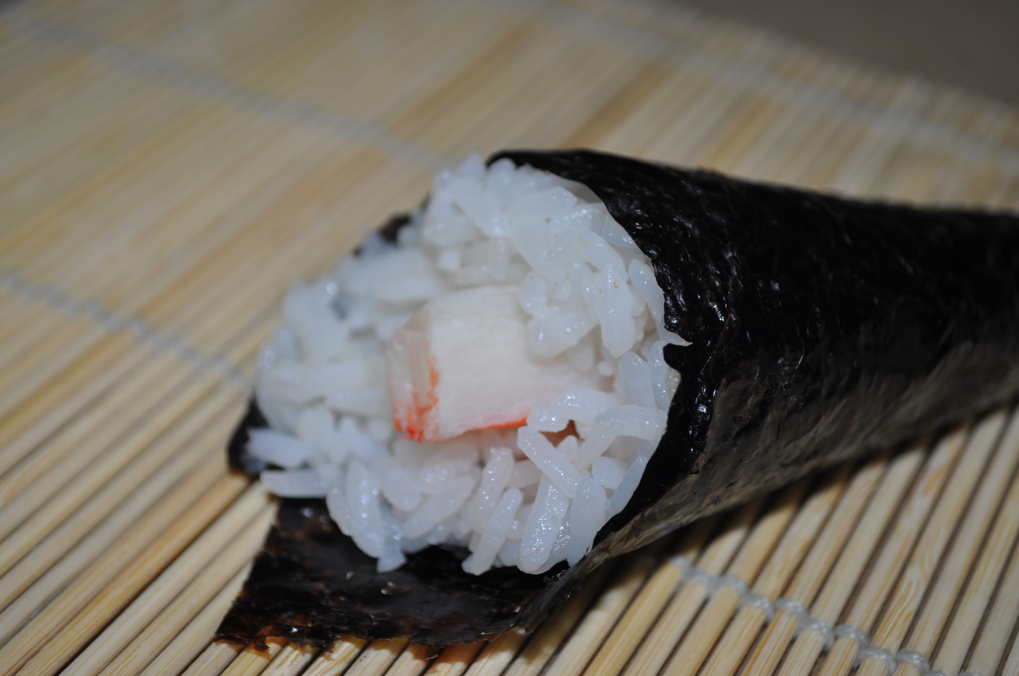 The “hand roll” is a large cone-shaped piece of nori on the outside and the ingredients spilling out the wide end. I made a simple one here with a crab stick.