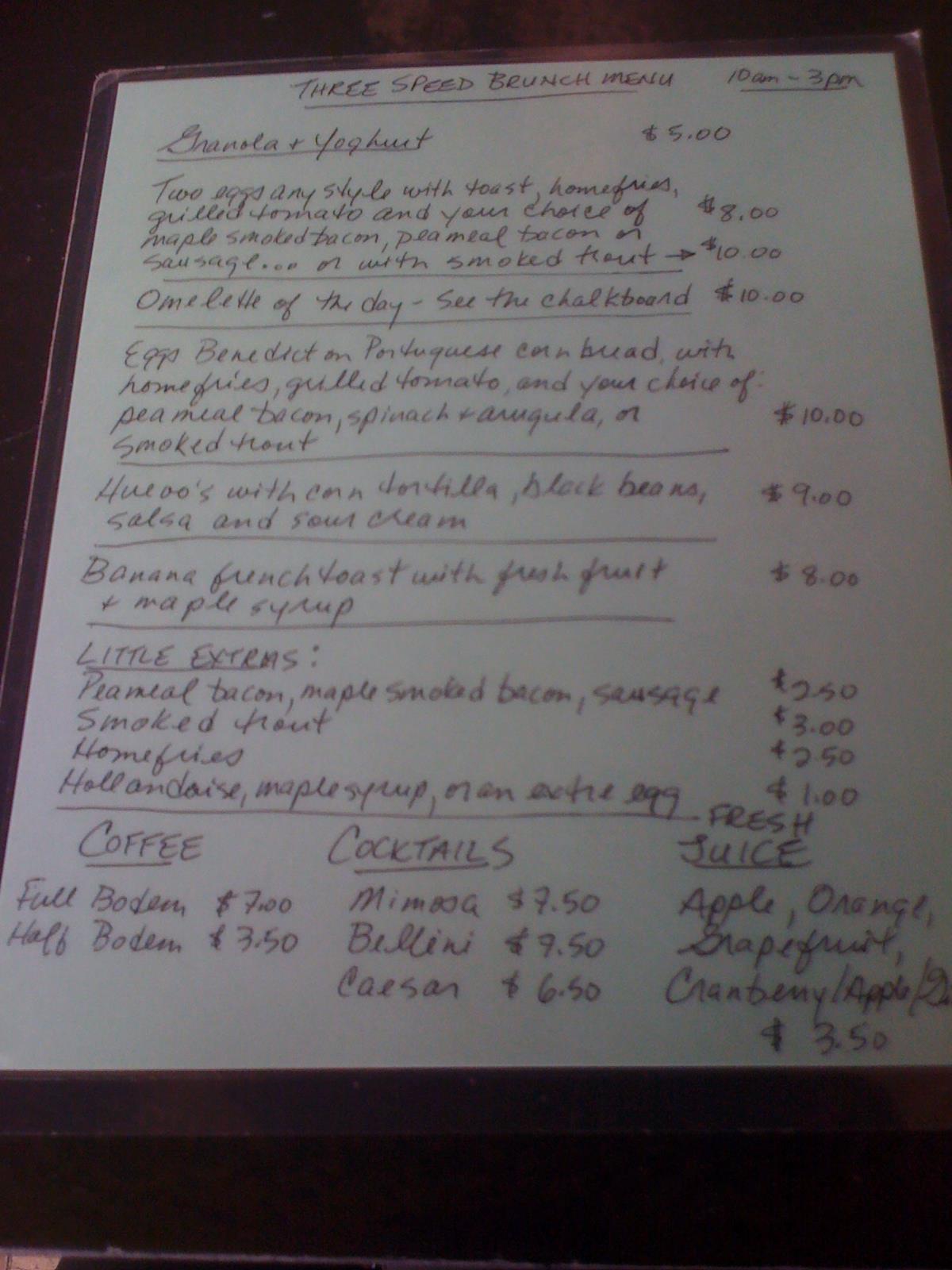 I have been to 3 Speed on several occasions for dinner, and soon after I learned that they were also offering brunch, I had to check it out. The first time I visited them for brunch was around February of 2012. Regina and I arrived at around noon and were seated within 10 minutes. While we waited however, we checked out their specials. On their specials for the day they had “fresh” sugar donuts. I was ecstatic. I love hot and gooey donuts! I was already imagining myself biting into this delicious goodness when a waitress went up to the board where the specials were written and she put a line through the ‘donuts’ and wrote “sold out” beside it. NO! How can this be? Brunch does not end until 3pm! When we were seated I scanned the room and noticed that some tables had plates with donuts piled on top of them. Those greedy bas%*ds! Arghh! Already I was starting brunch on the wrong foot. Regina tried to calm me down, but to no avail. Once I am pissed, I am pissed. Yeah, I am working on my anger issues.