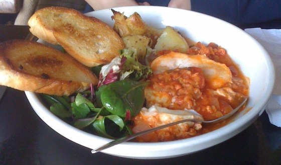 Regina on the other hand chose to get one of their specials from the board. In all honesty, I can’t remember what it was called. I refused to look at the board after my donuts were sold out. But it basically looked like egg rancheros to me. It consisted of 2 poached eggs in a tomato salsa, home fries, a salad and toasted bread. Regina seemed very happy with her meal. There was a slight disappointment when one of the eggs at the point of cutting it open did not ooze out as we expected it to, but we figured it was because it got cooked while it sat in the salsa.