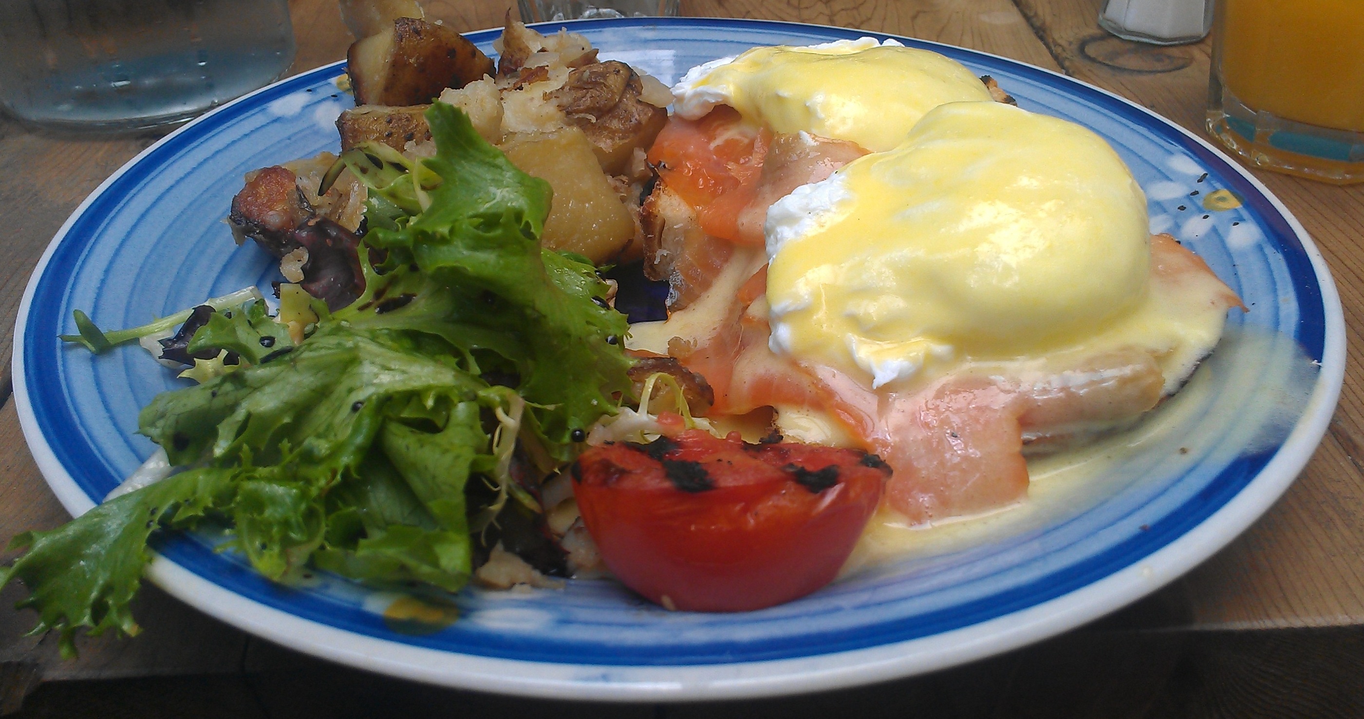 I looked through their regular menu and decided to go for my usual favorite, the Eggs Benedict. Specifically, it was an Eggs Benedict on Portuguese corn bread, with home fries, grilled tomato, and from their choices of peameal bacon, spinach and arugula, or smoked trout, I chose the smoked trout.