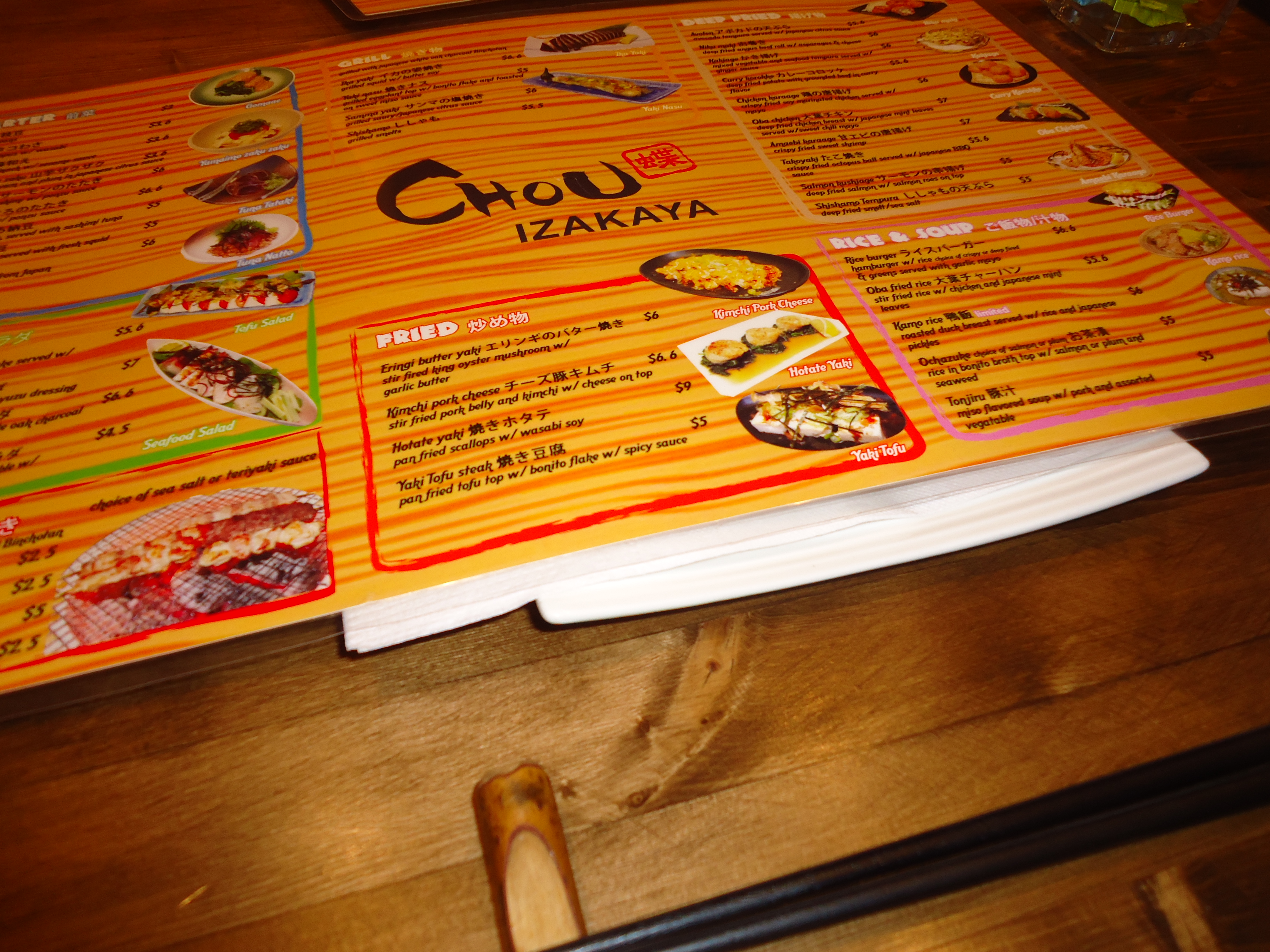 I am a huge fan of Guu Izakaya on Church and Gerrard in Toronto. One day while walking home I noticed a sign for Chou Izakaya and as I took a closer look, I could not help but notice how similar their menu was to Guu’s. Mmm I pondered, could this place be any good? It did seem to have popped up overnight. Several days later my friend and I were checking out “Foodspotting” to see what in the area was rated good and popular. And there it was, the first restaurant that popped up in our search was Chou Izakaya. It was decided, I was going to have to check it out.