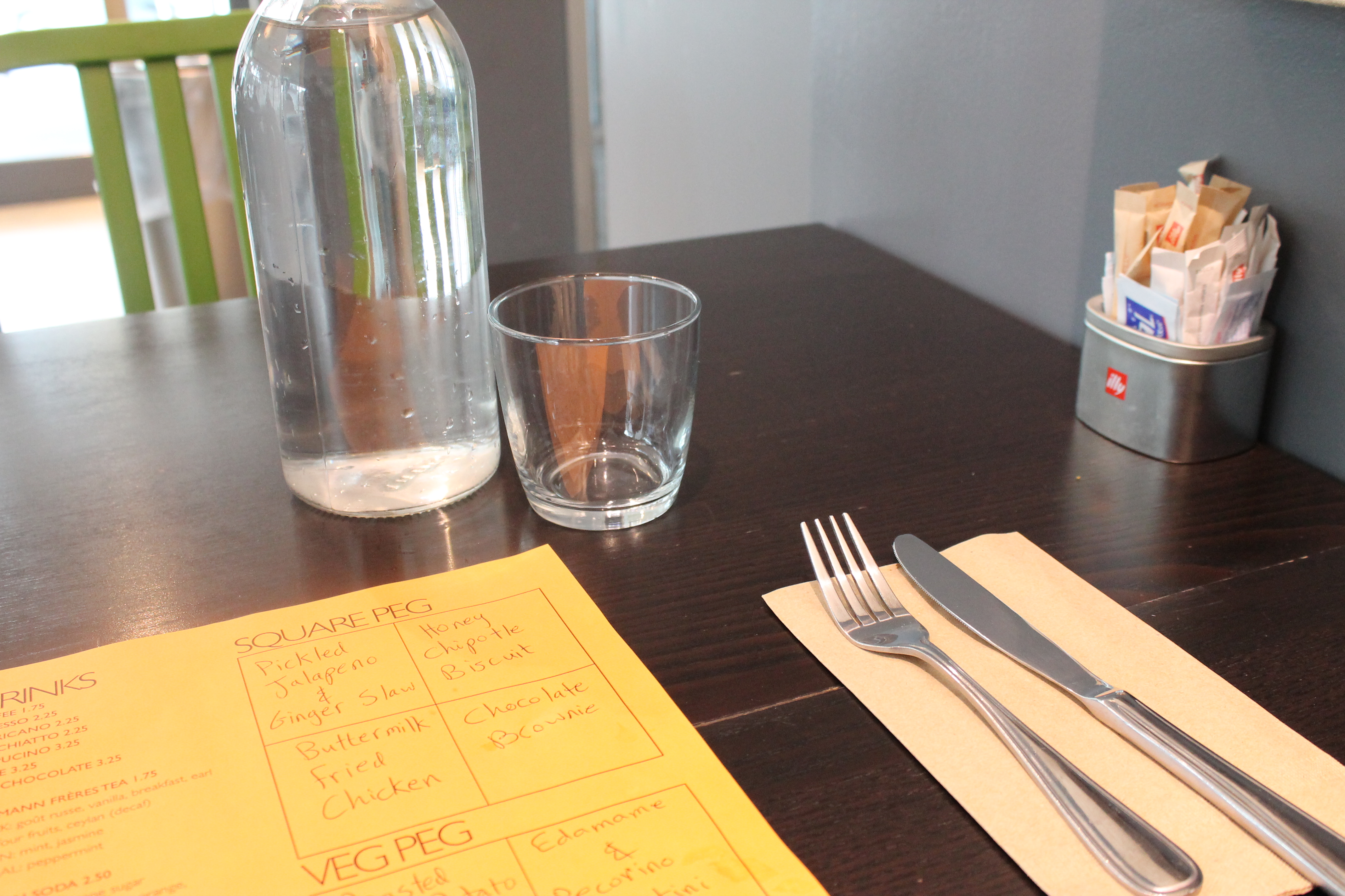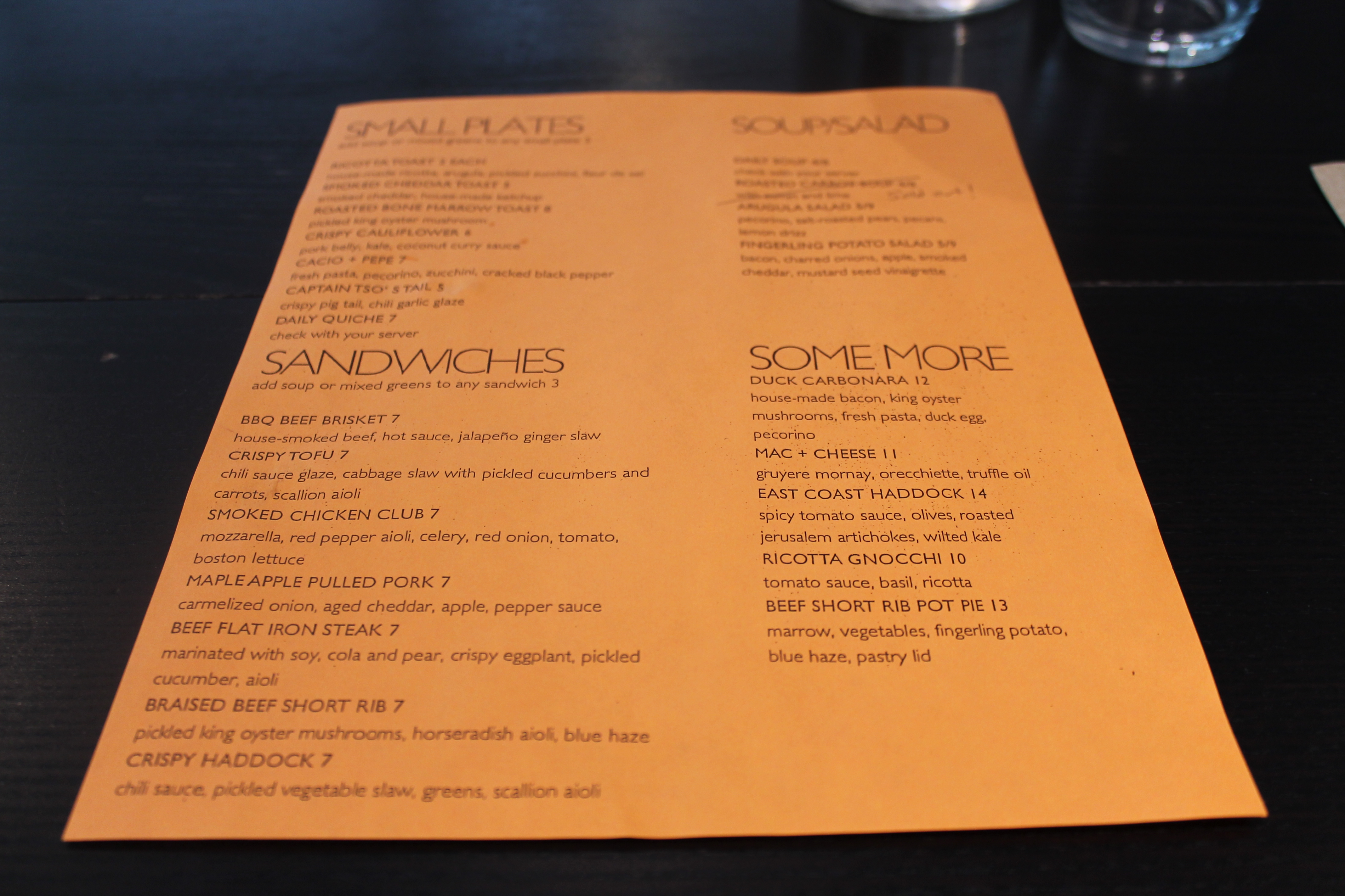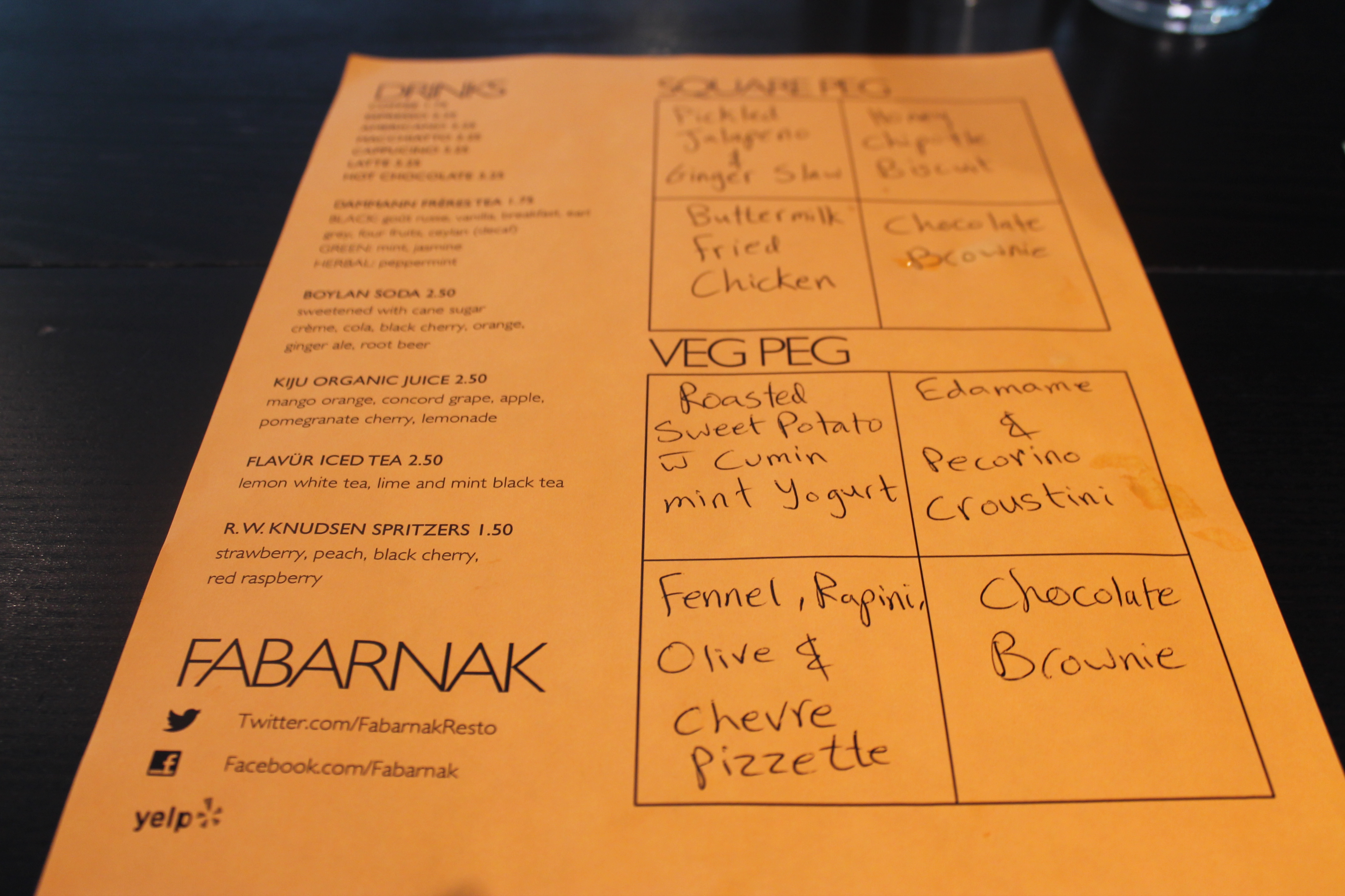 The menu was printed on orange paper. Nothing special. But the options were quite interesting. For starters their lunch and dinner menus are the same, though dinner is only offered one night a week (Friday). The menu is split between “small plates”, “sandwiches”, “specials (where you find the square peg/bento box–choice between a square peg or a veg peg)”, “soups”, “salads”, “something more” and “drinks.” You can follow Fabarnak on twitter (@FABARNAKresto) to find out what’s featured in their daily square pegs. The prices range from $2-$14.