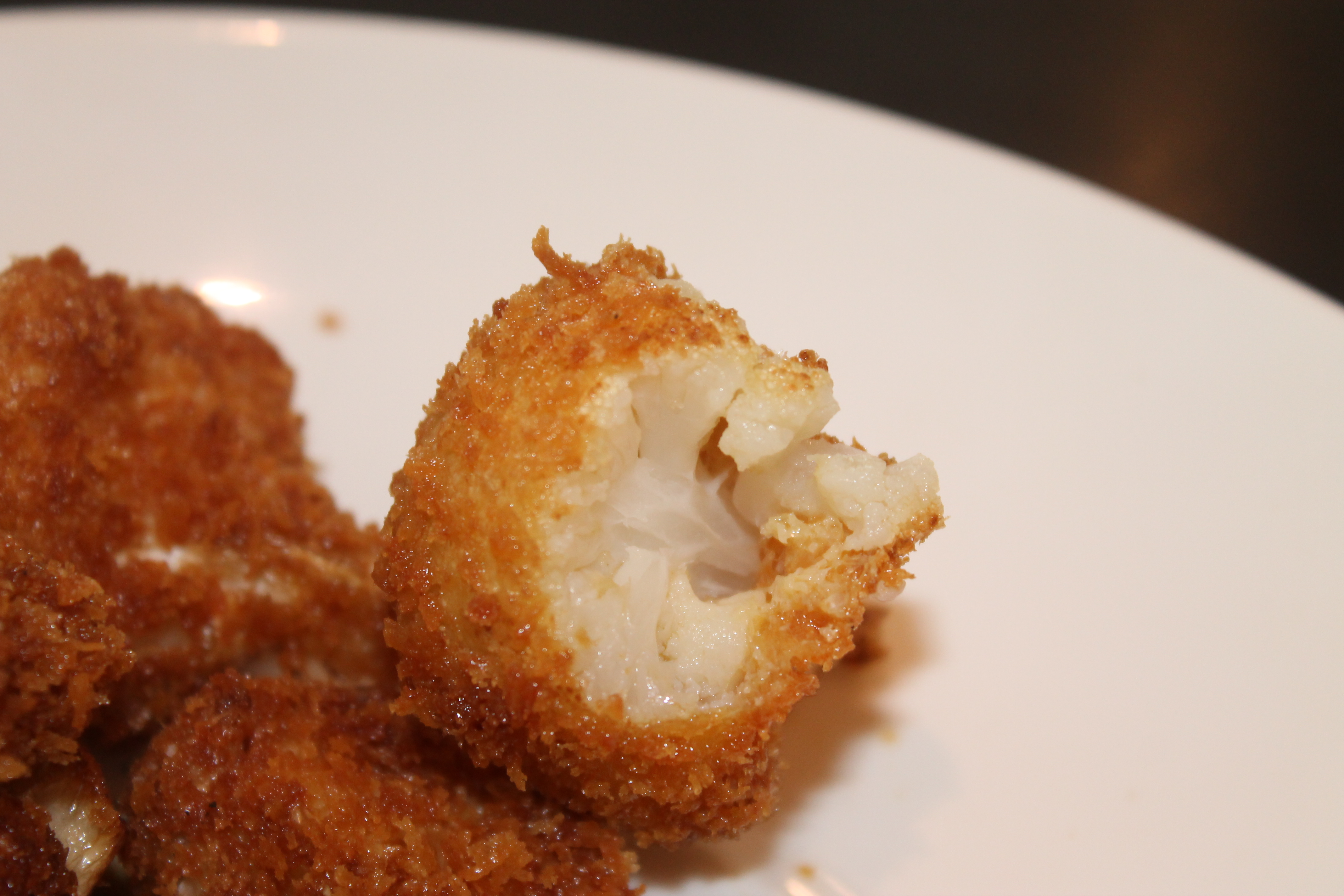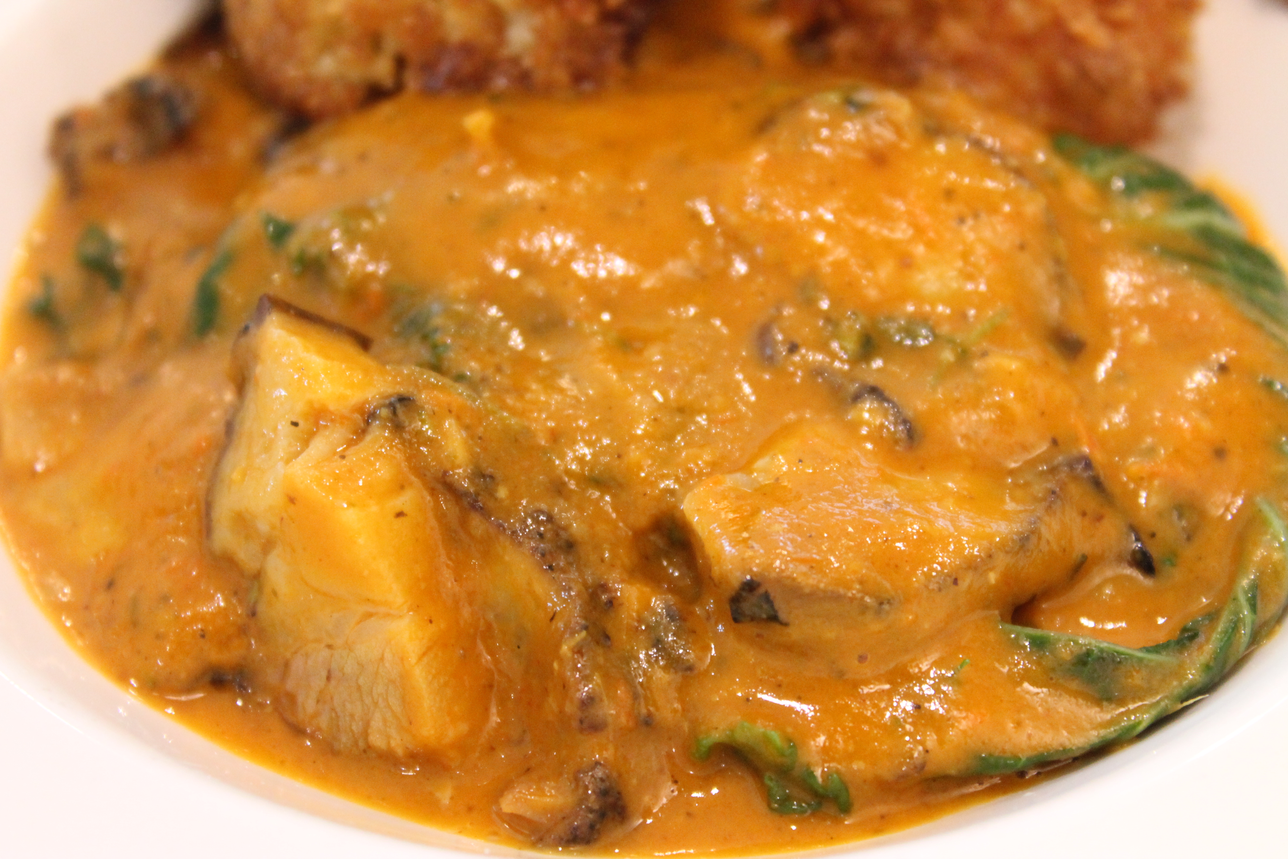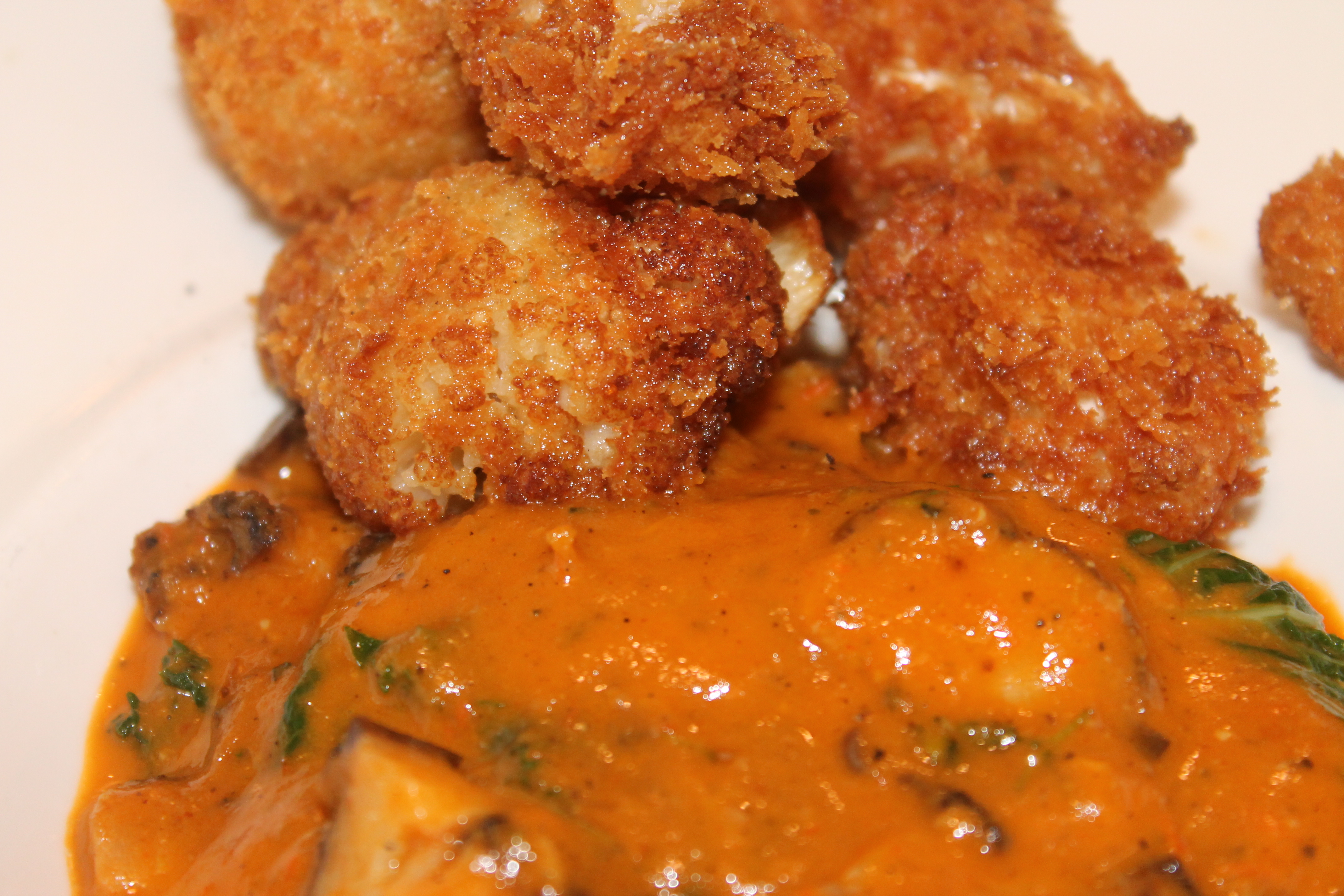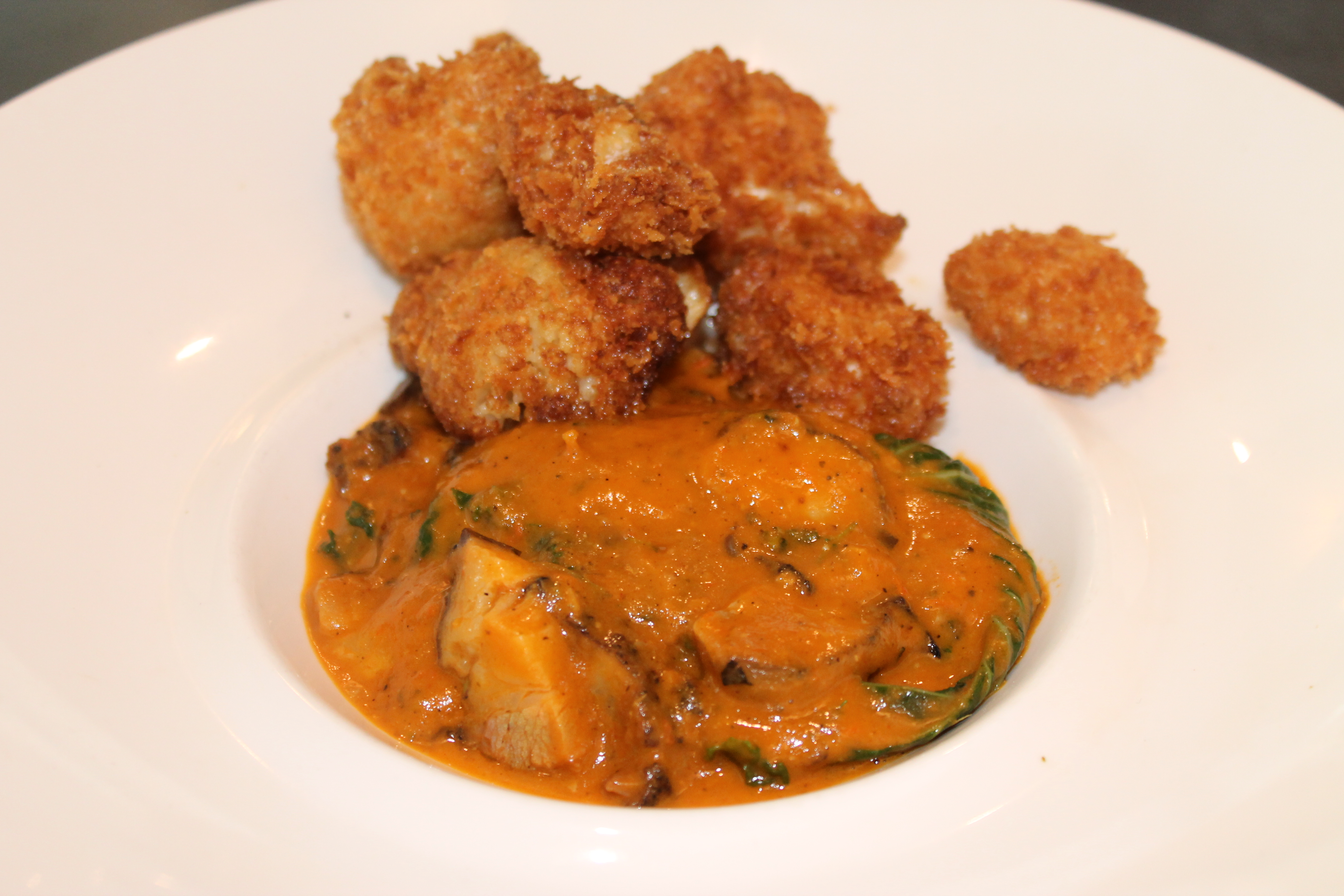 2) Crispy cauliflower, pork belly and kale with a coconut curry sauce. $6.00