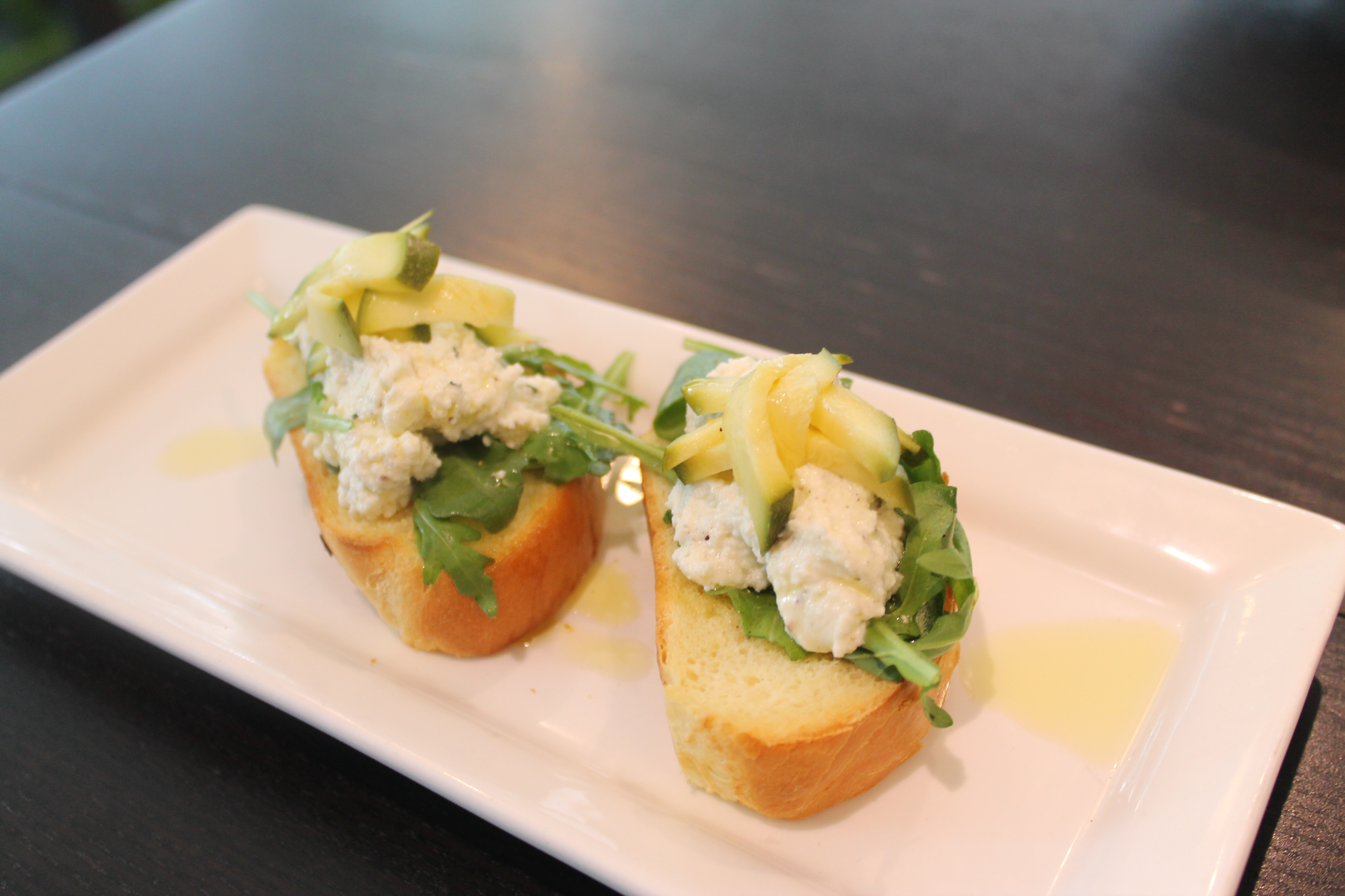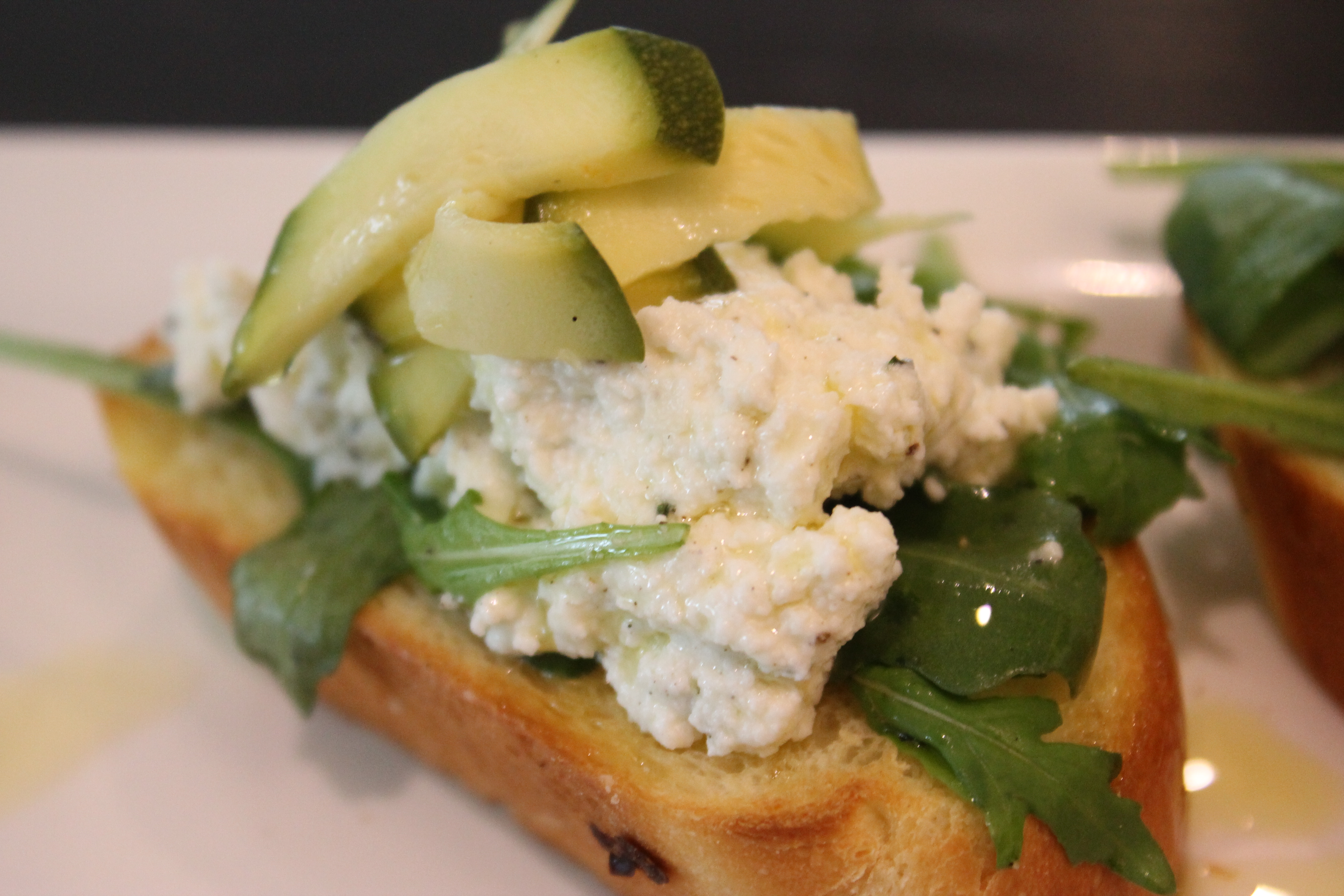 1) House-made ricotta served on toast with arugula, pickled zucchini and fleur de sel. $2.00