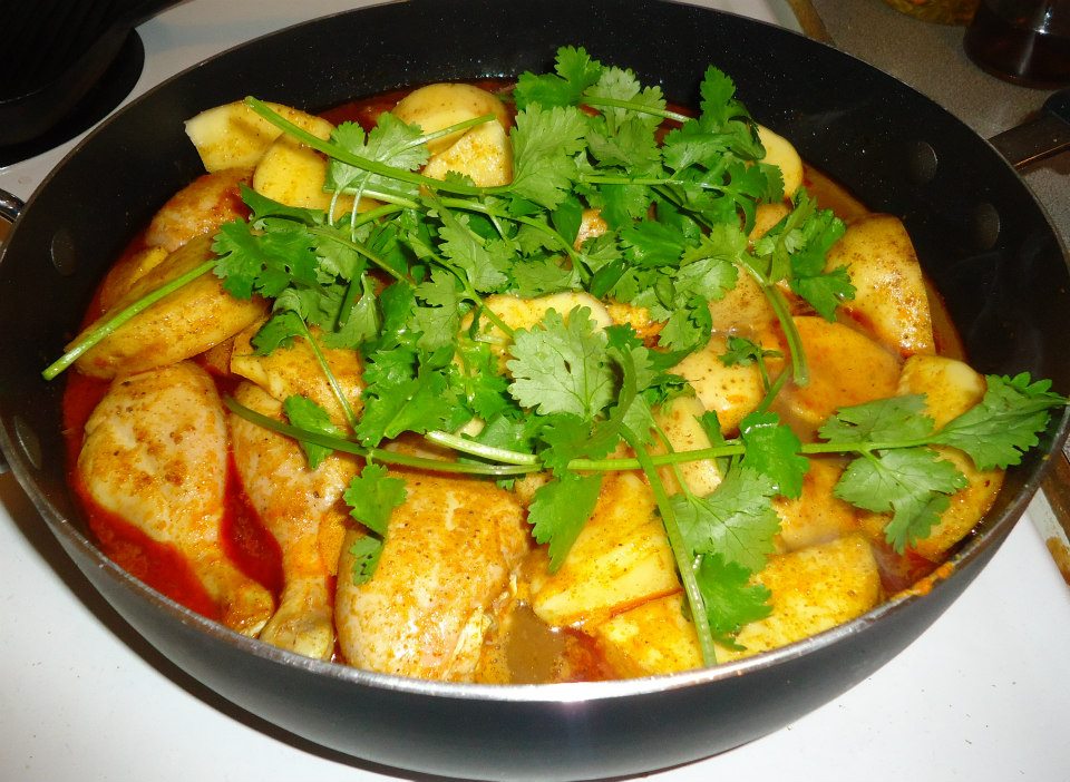 1) Cut all your ingredients and put them aside. 2) Heat a large pan and then add oil. The heat should be medium-high. 3) Add the garlic, and ginger to the oil (for those of you who like onion, you can add finely chopped onion at this stage) and cook and stir for about 4 minutes (make sure it does not burn or the garlic and ginger will taste bitter. 4) Stir the curry powder, cumin, turmeric, coriander, cayenne, and 1 tablespoon of water into the mixture in the pan. 5) Stir everything together for about 1 minutes. 6) Mix the tomatoes, chopped cilantro, and 1 teaspoon salt into the mixture. 7) Add the chicken to the mixture and pour 1/2 cup water into the mixture and bring to a boil, turning the chicken to coat with the sauce. 8) Sprinkle the garam masala over the chicken and let it cook for about 5 minutes. 9) Add the potatoes and whatever else takes the longest to cook. Add large pieces of cilantro (adds great flavor to the curry). You can garnish with smaller pieces at the end.