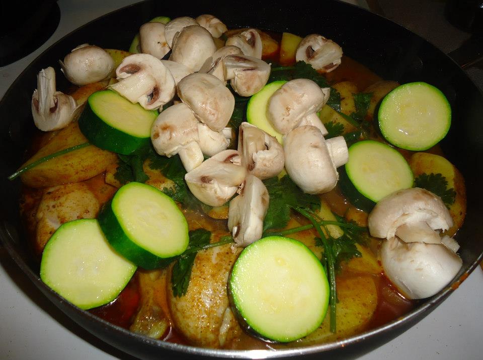 After adding the mushrooms and zucchini let everything simmer together for 15-20 minutes before turning off the stove. Let it sit with no heat for about 10 minutes more. This allows the juices to penetrate the vegetables and it helps the chicken soften. The meat on the chicken will literally fall off the bone.