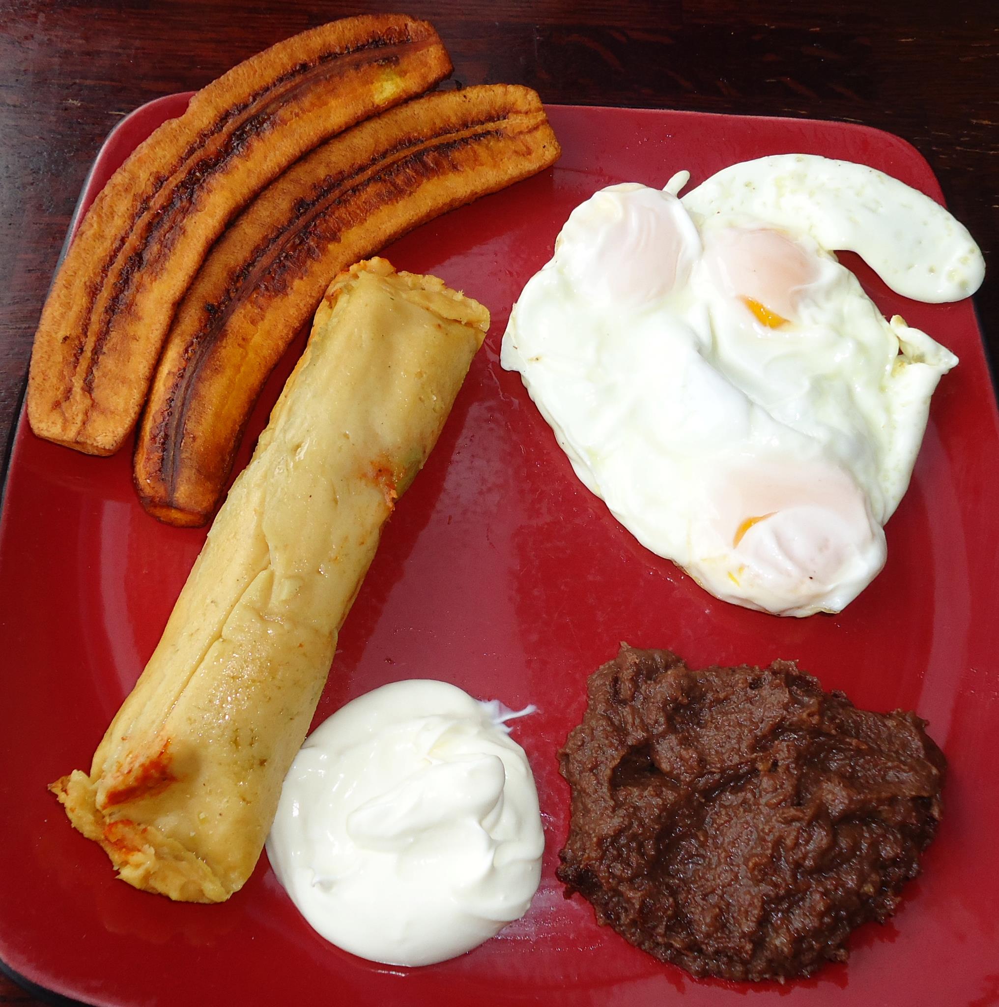 In Spanish, I ordered plátanos maduro frito, crema, frijoles, 3 huevos al espejo, tamal de pollo y una tortilla.