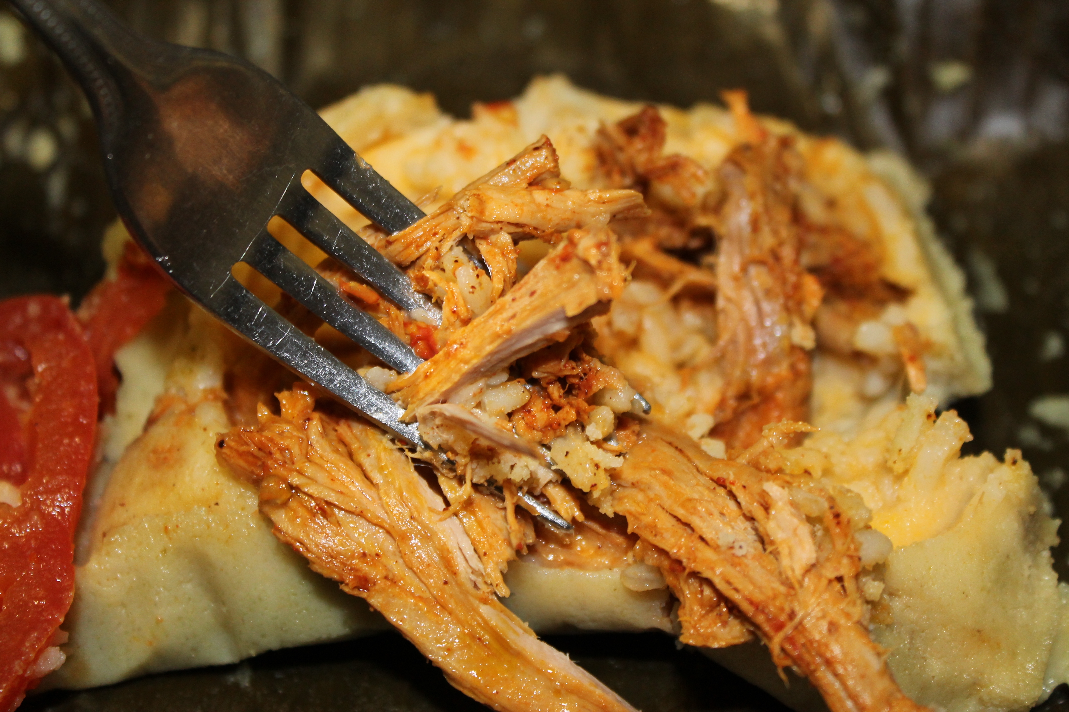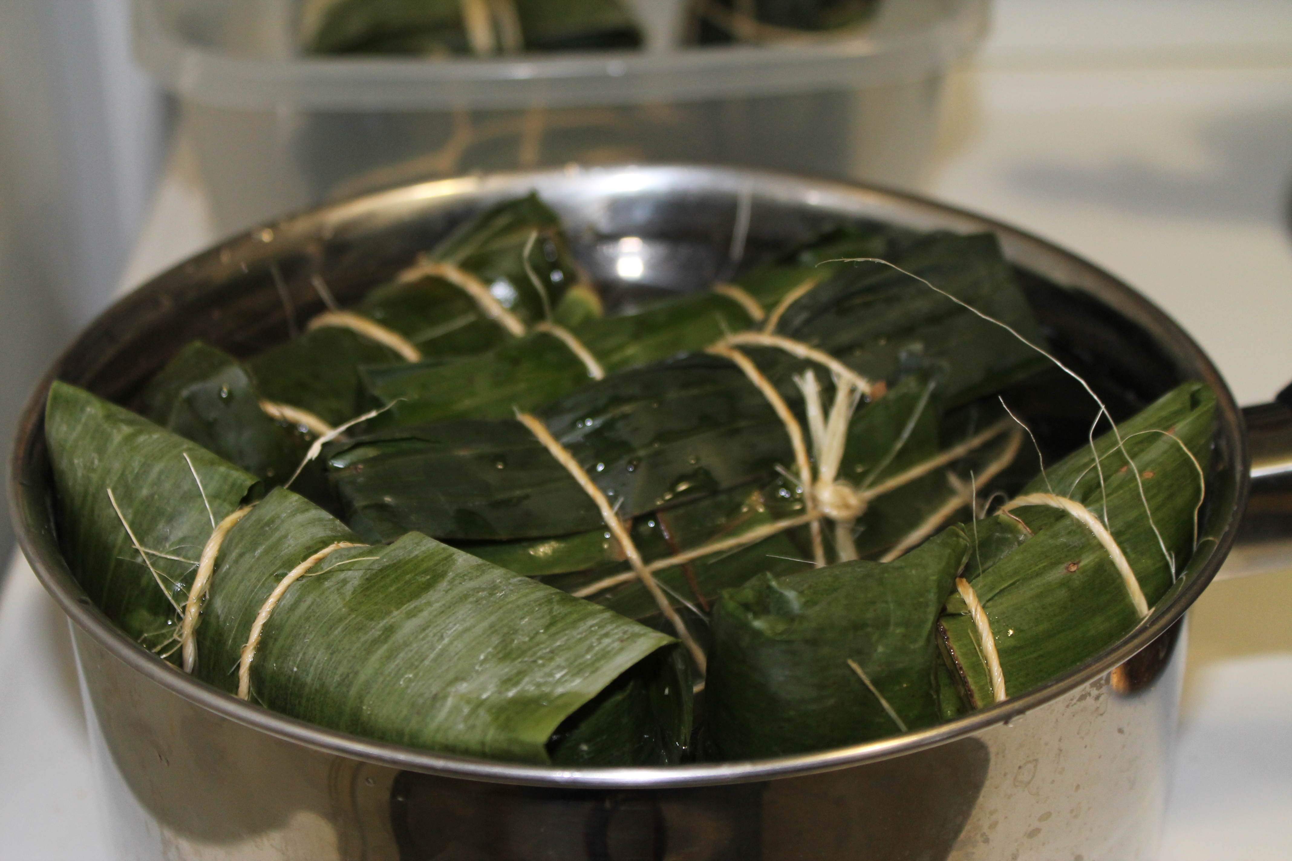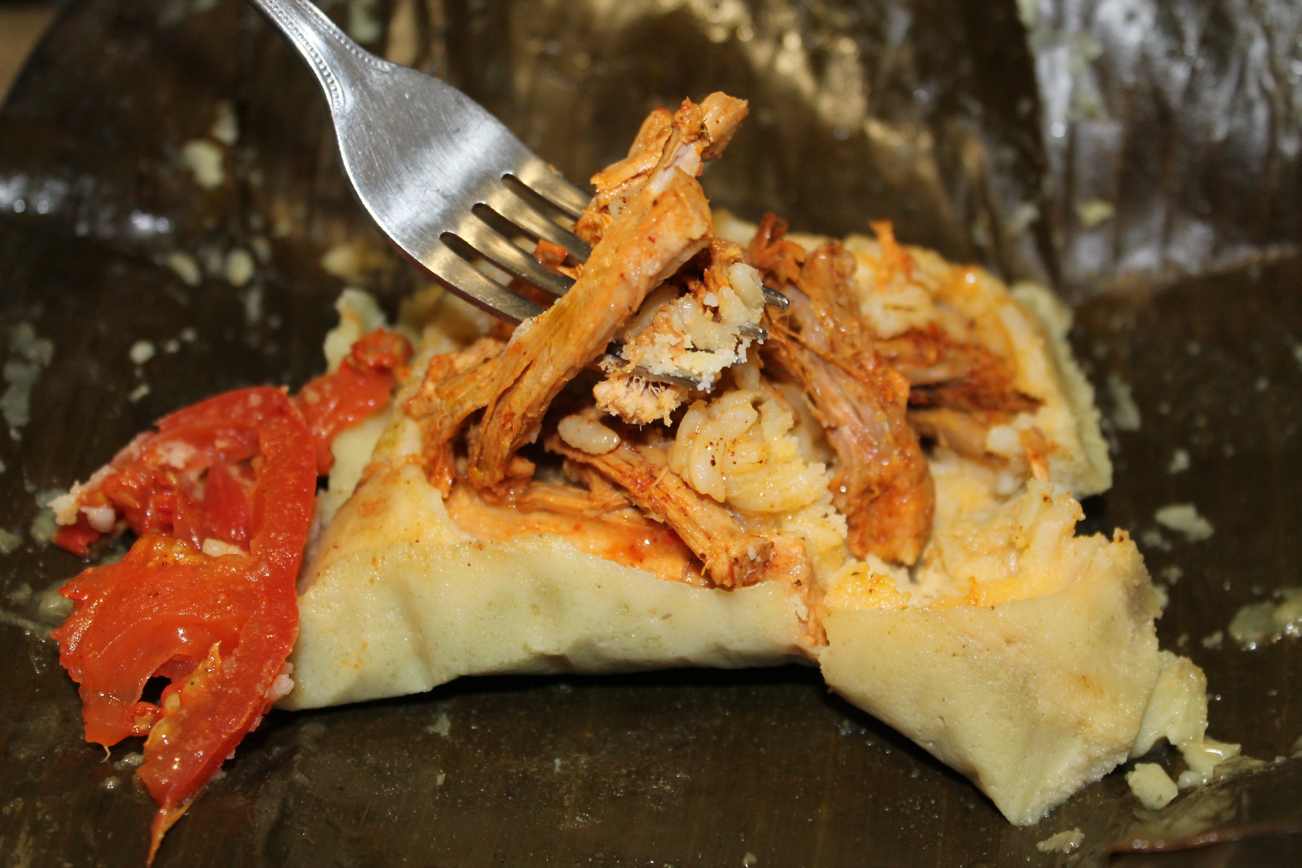 Naturally I deviated from the authentic recipe because a) I do not eat onions and b) I do not eat peppers. And guess what? You need both these ingredients. Not gonna happen. So these are the ingredients I settled on instead: rice, potatoes, tomatoes and pulled pork. And you know what? It really was not as difficult as I thought it would be, except for the fact that I forgot to add the most basic and important ingredient as far as I am concerned when it comes to cooking savory dishes. Yep, SALT! How in the h@#$ could I forget SALT?! One excuse is that I was so focused on getting what I read were the most difficult parts of the assembly down, that I completely disregarded the importance of proper seasoning. So now I have 10 bland nacatamales. Yes,I know I can still add the salt after the fact, but it is not the same! Arghh! I am so annoyed. It’s like baking a cake with no sugar!