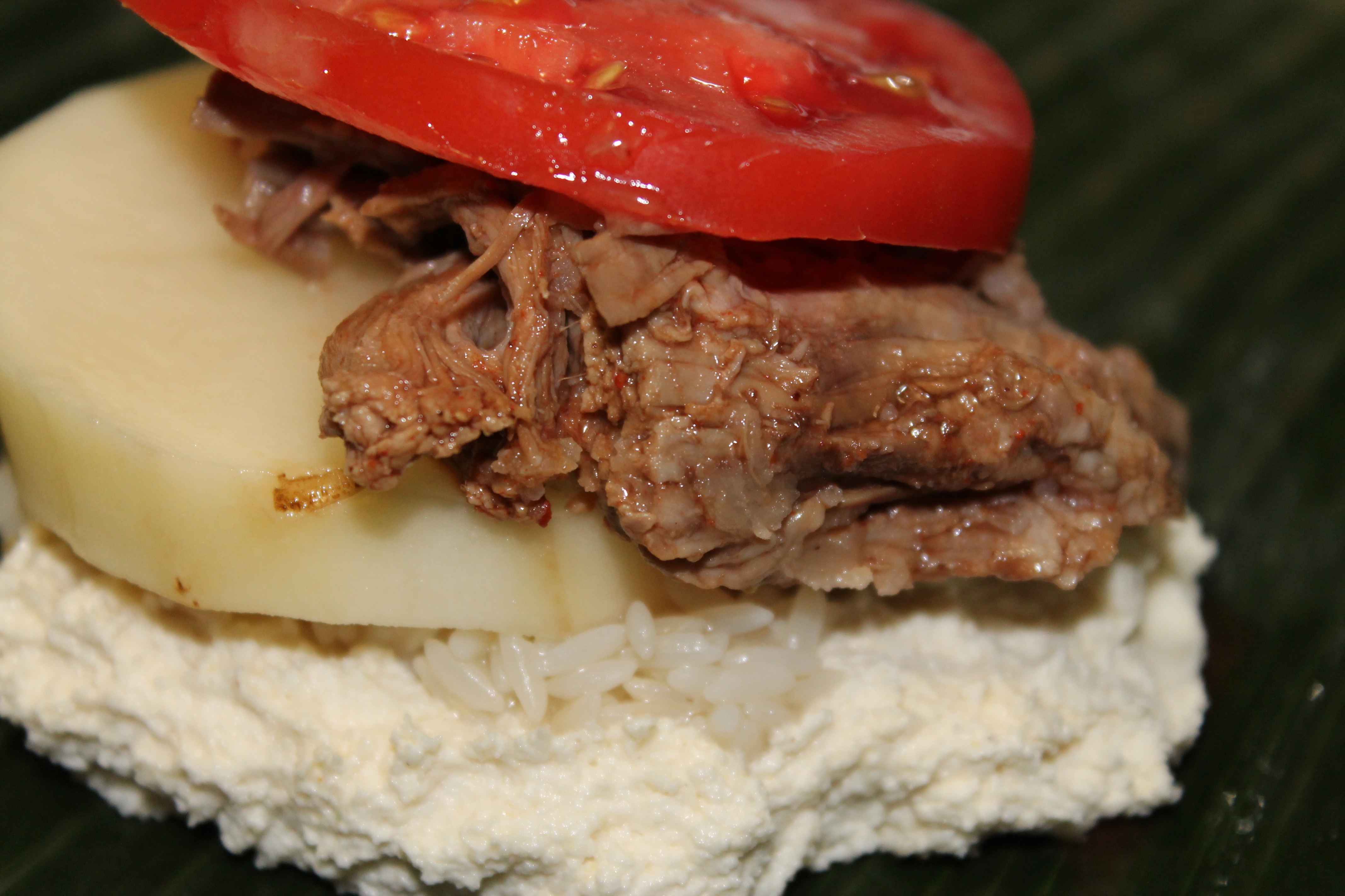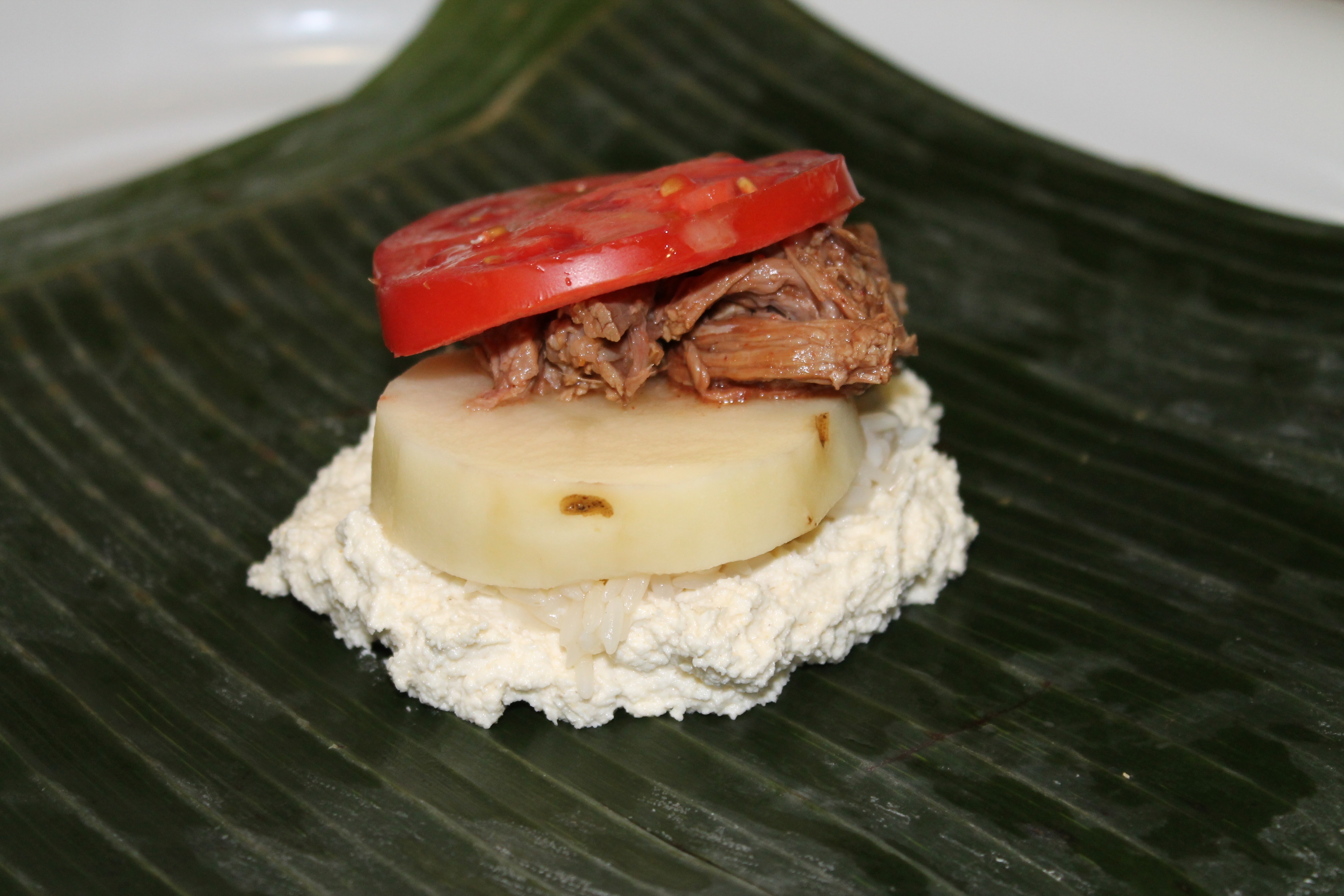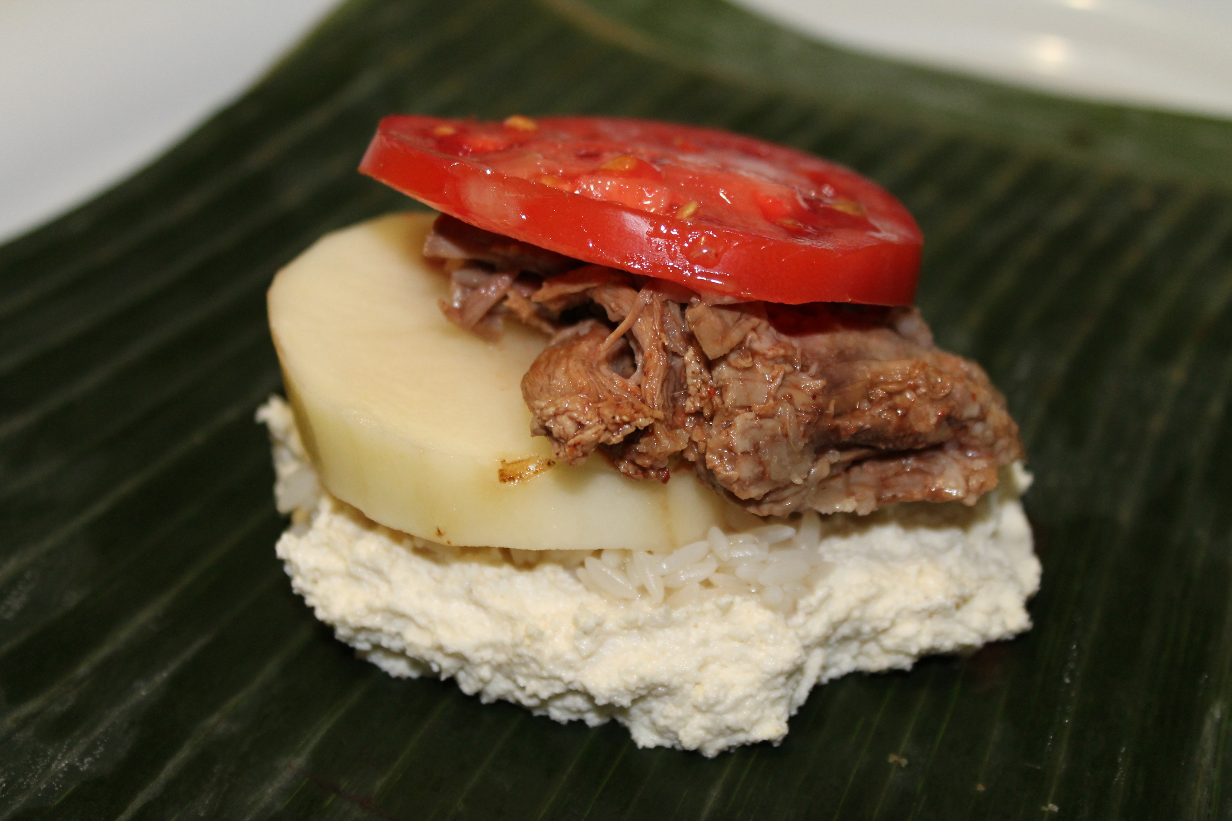 Naturally I deviated from the authentic recipe because a) I do not eat onions and b) I do not eat peppers. And guess what? You need both these ingredients. Not gonna happen. So these are the ingredients I settled on instead: rice, potatoes, tomatoes and pulled pork. And you know what? It really was not as difficult as I thought it would be, except for the fact that I forgot to add the most basic and important ingredient as far as I am concerned when it comes to cooking savory dishes. Yep, SALT! How in the h@#$ could I forget SALT?! One excuse is that I was so focused on getting what I read were the most difficult parts of the assembly down, that I completely disregarded the importance of proper seasoning. So now I have 10 bland nacatamales. Yes,I know I can still add the salt after the fact, but it is not the same! Arghh! I am so annoyed. It’s like baking a cake with no sugar!