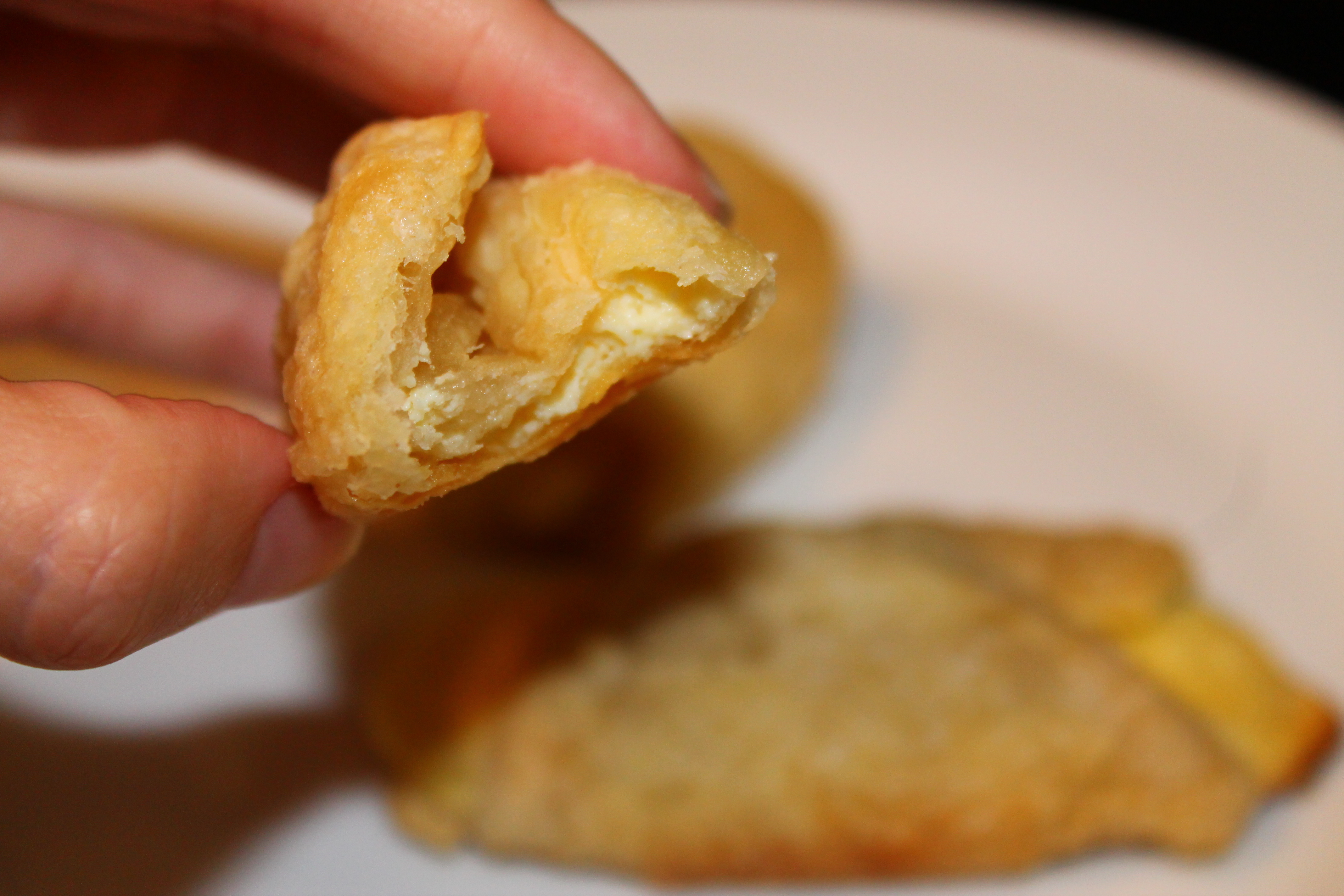 Then reality hit. I can’t buy these pastries in Toronto. I have searched and searched, but not a single pastry shop here sells them. Arghhh. So last night I made my way to the 24 hour grocery store (and I am sick with the flu!) and picked up eggs, puff pastry and cream cheese. What I created semi-remind me of the sweet cheese rolls I had in Cuba. Although not the same thing, they tasted good! They were buttery, sweet and flaky. The creamy cheese center was the icing on the cake…per se.
