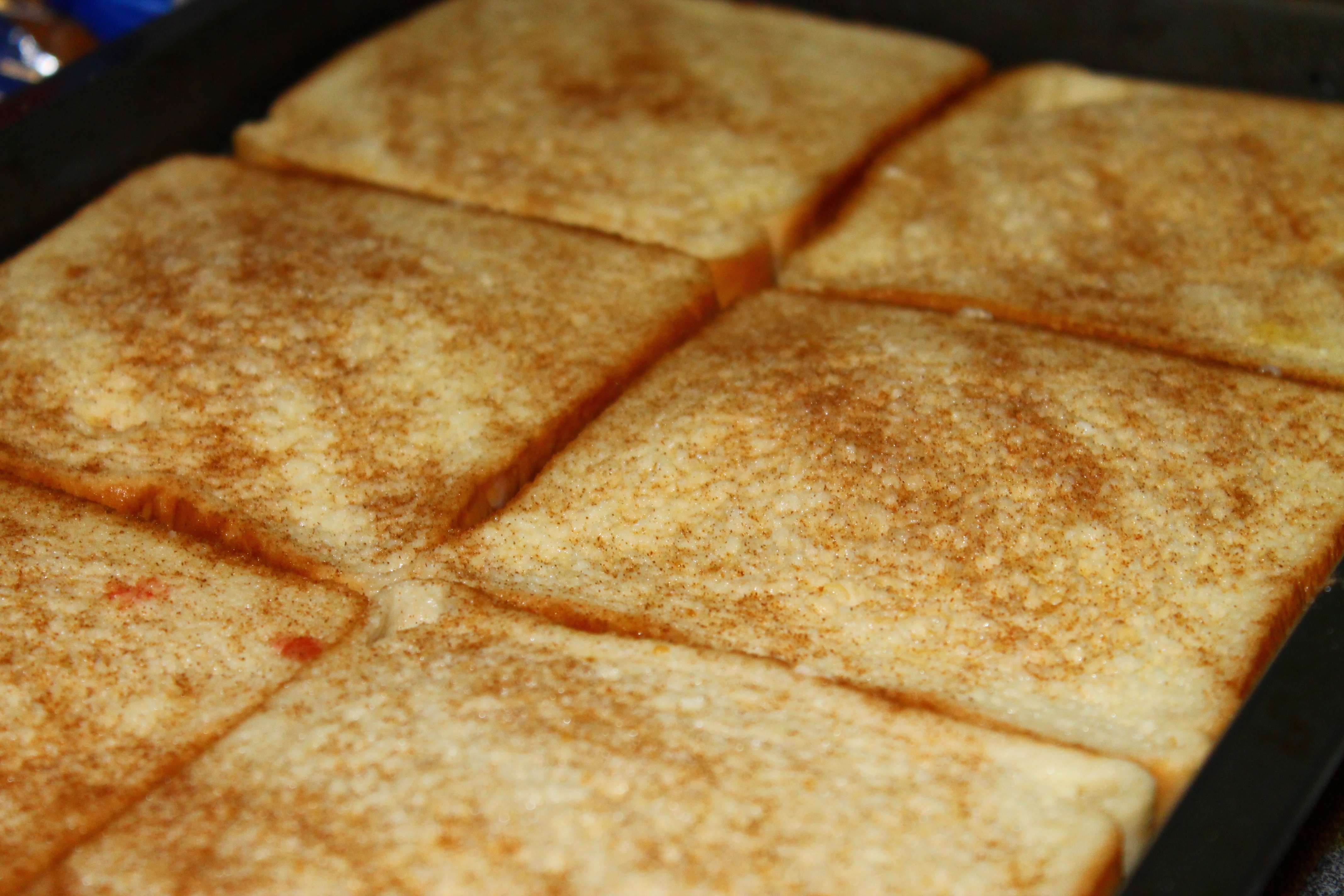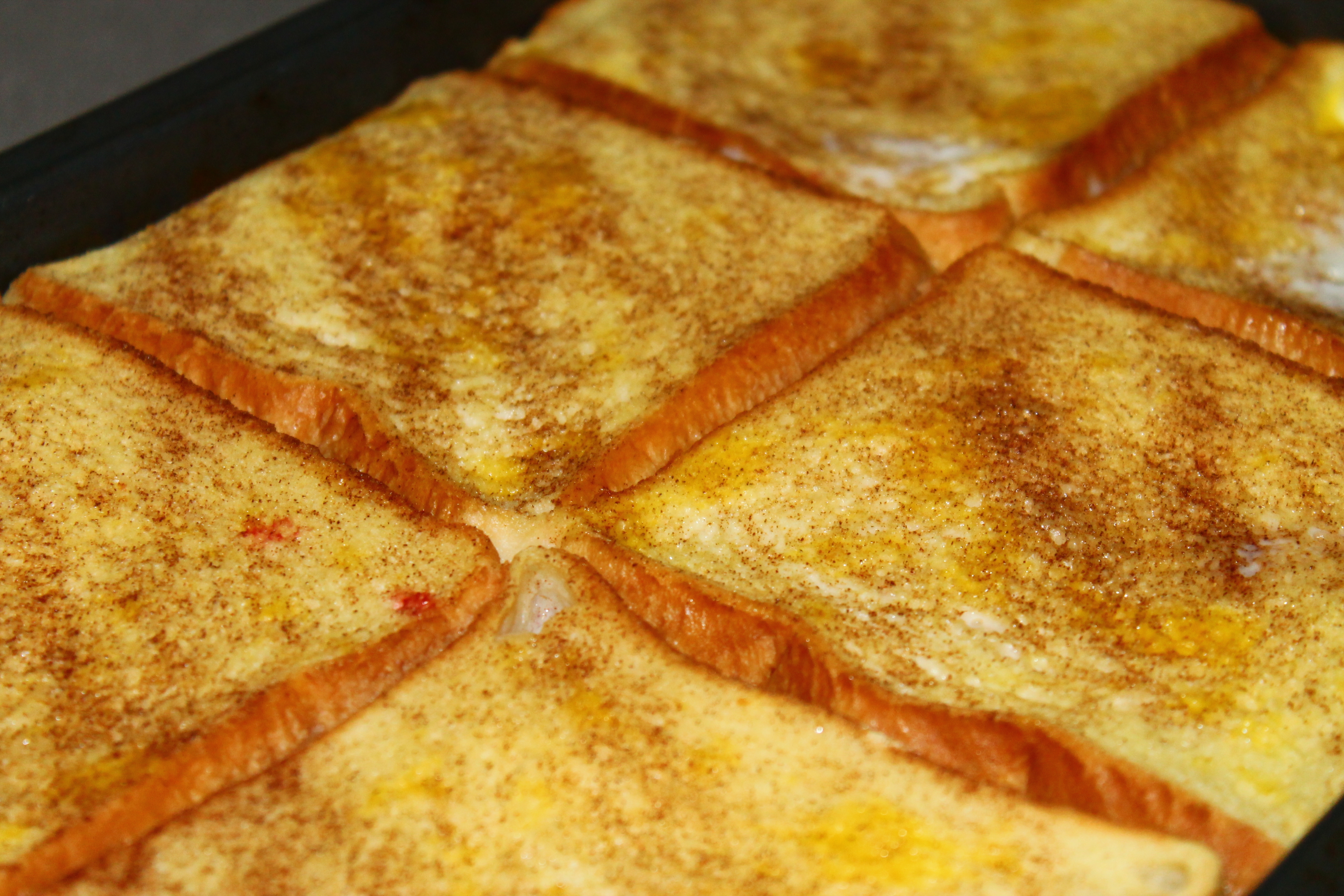 IMG_7919Once all the slices are coated, add a sprinkling of cinnamon sugar to your liking on top of each sandwich (optional).  Then put dish in the oven for about 20 to 30 minutes.