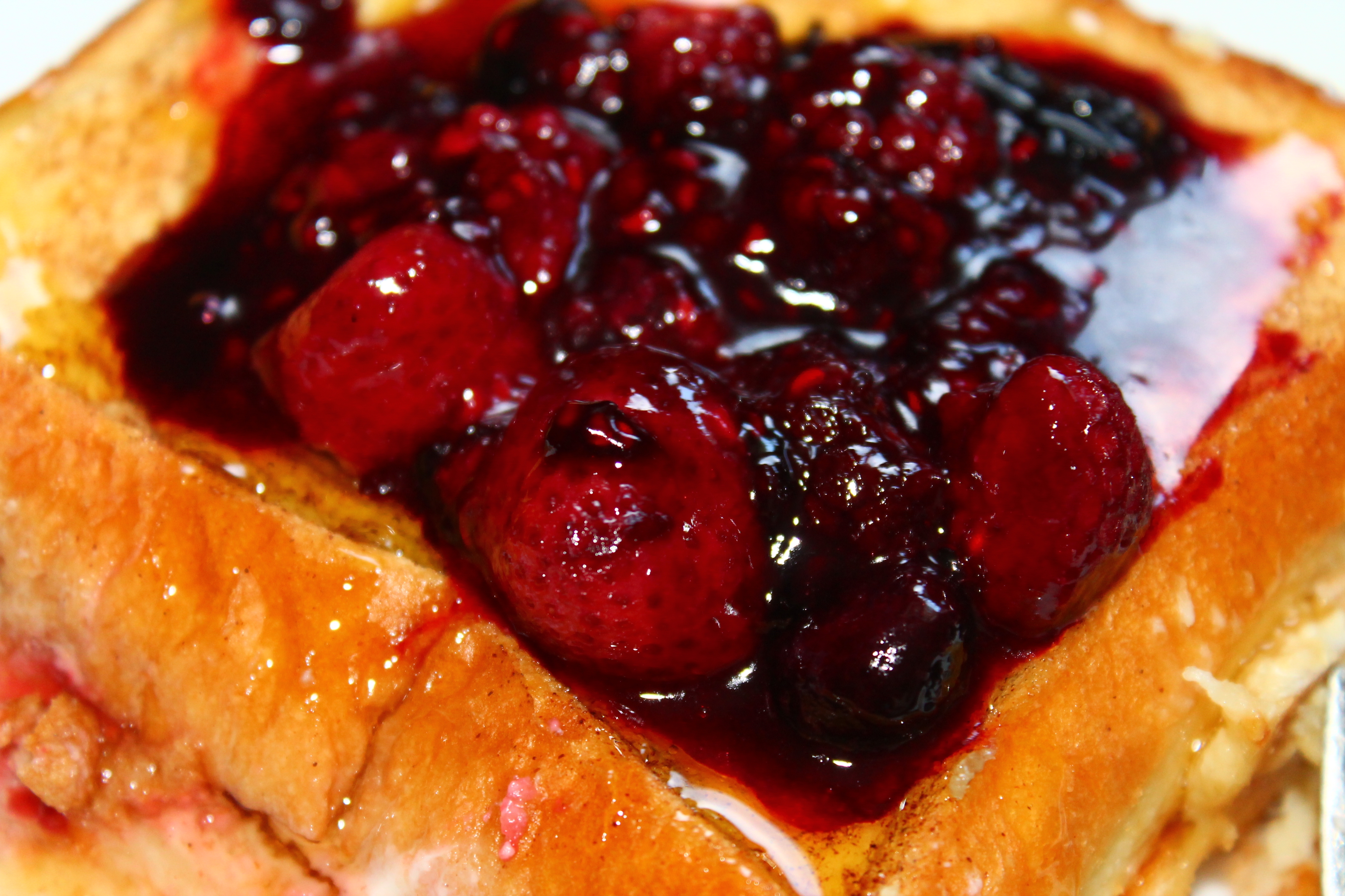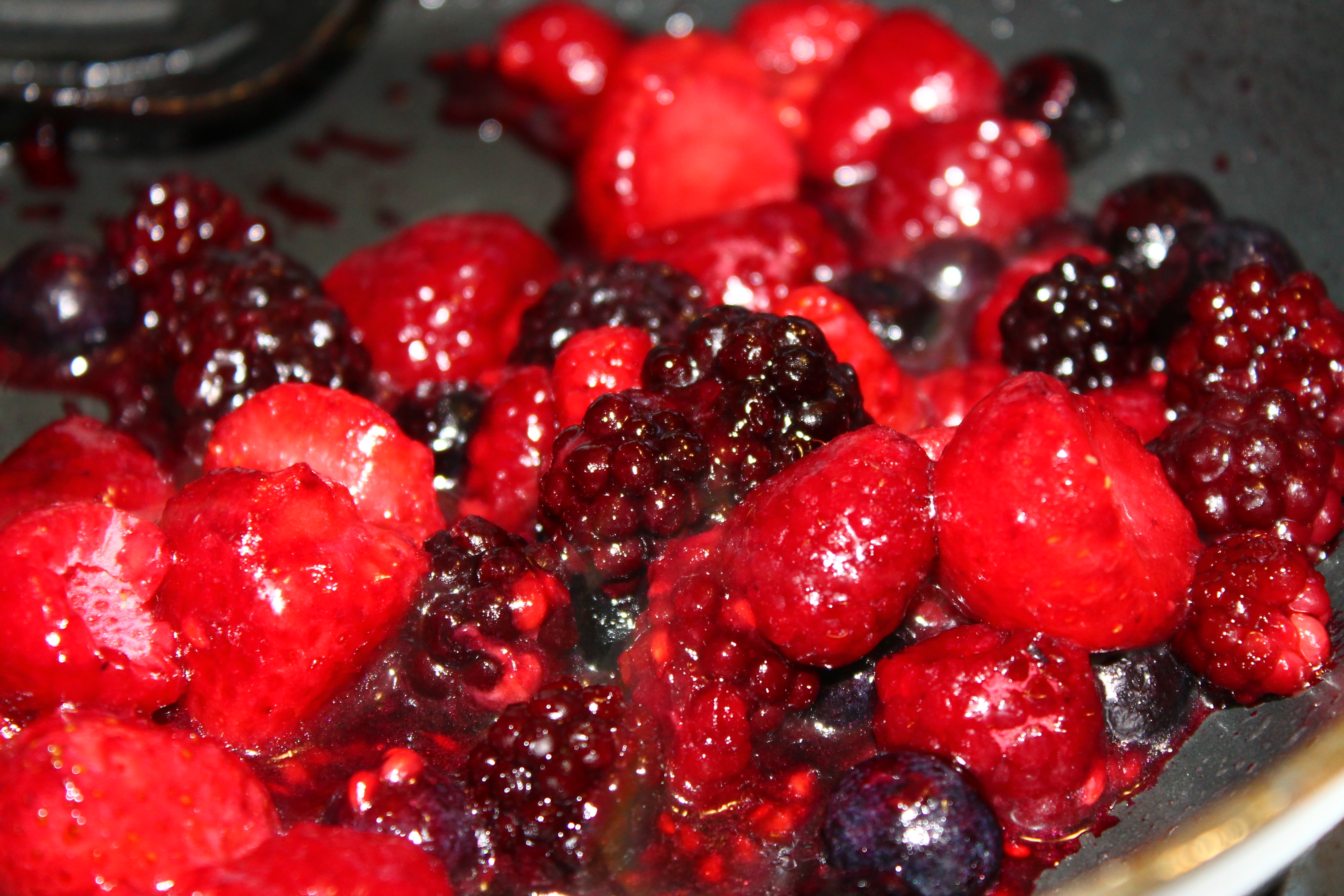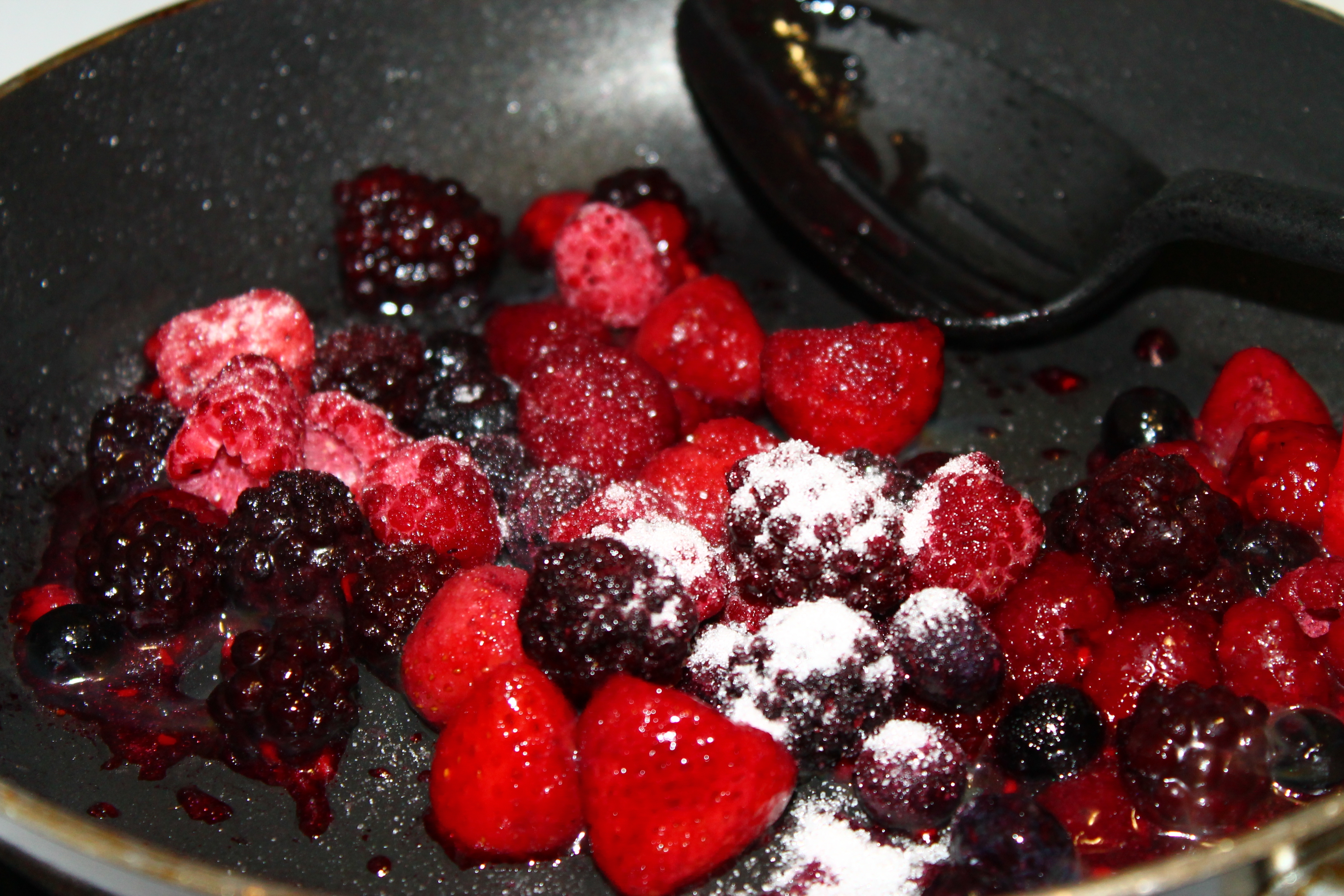 While the bread is baking, it is time to make the berry topping. I put a pan on medium heat and added about a tablespoon of oil. Once the pan was hot I threw in the berries and about 2 tablespoons of sugar. Then I mixed the sugar and berries until the mixture became thick and glossy and the sugar was fully dissolved.