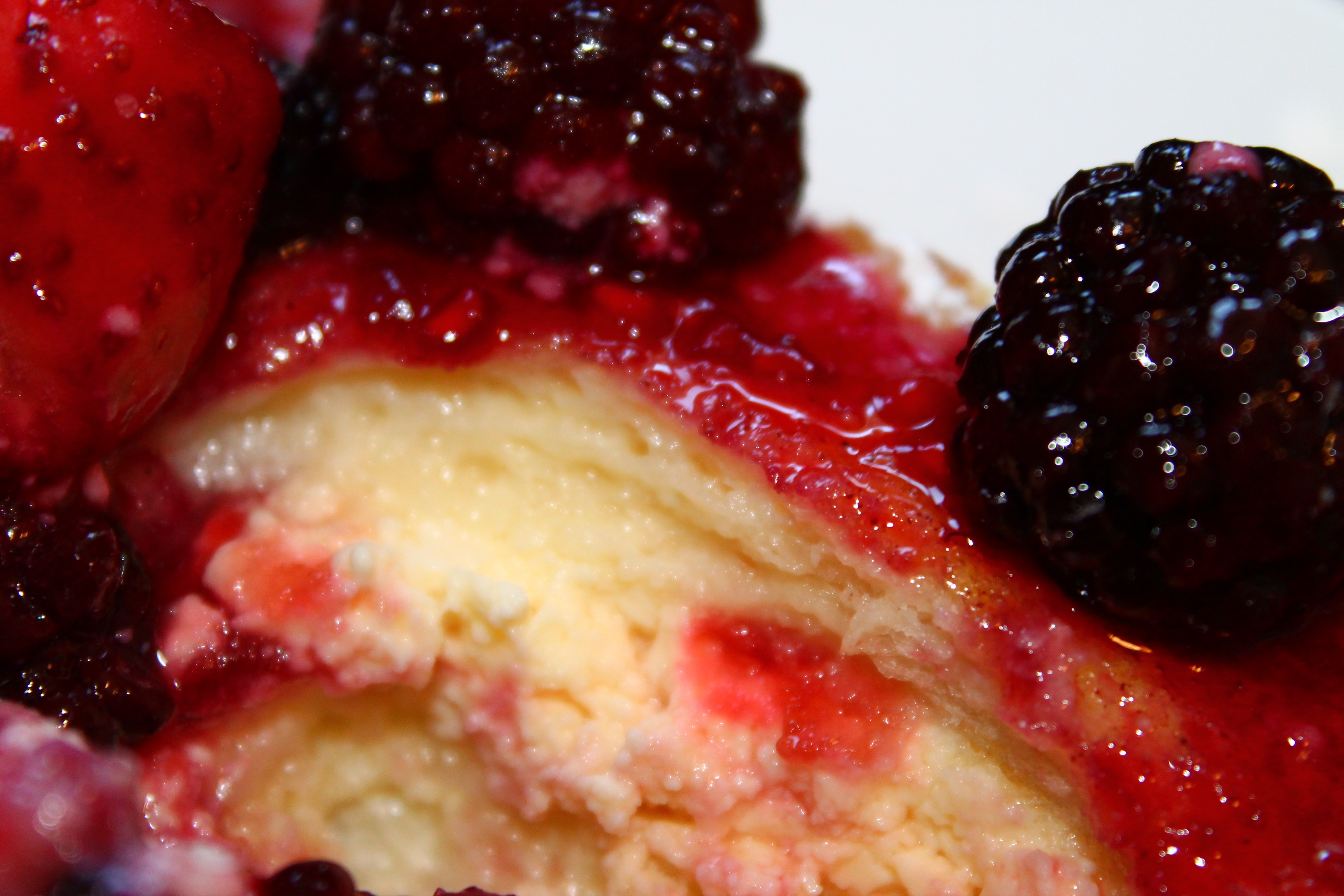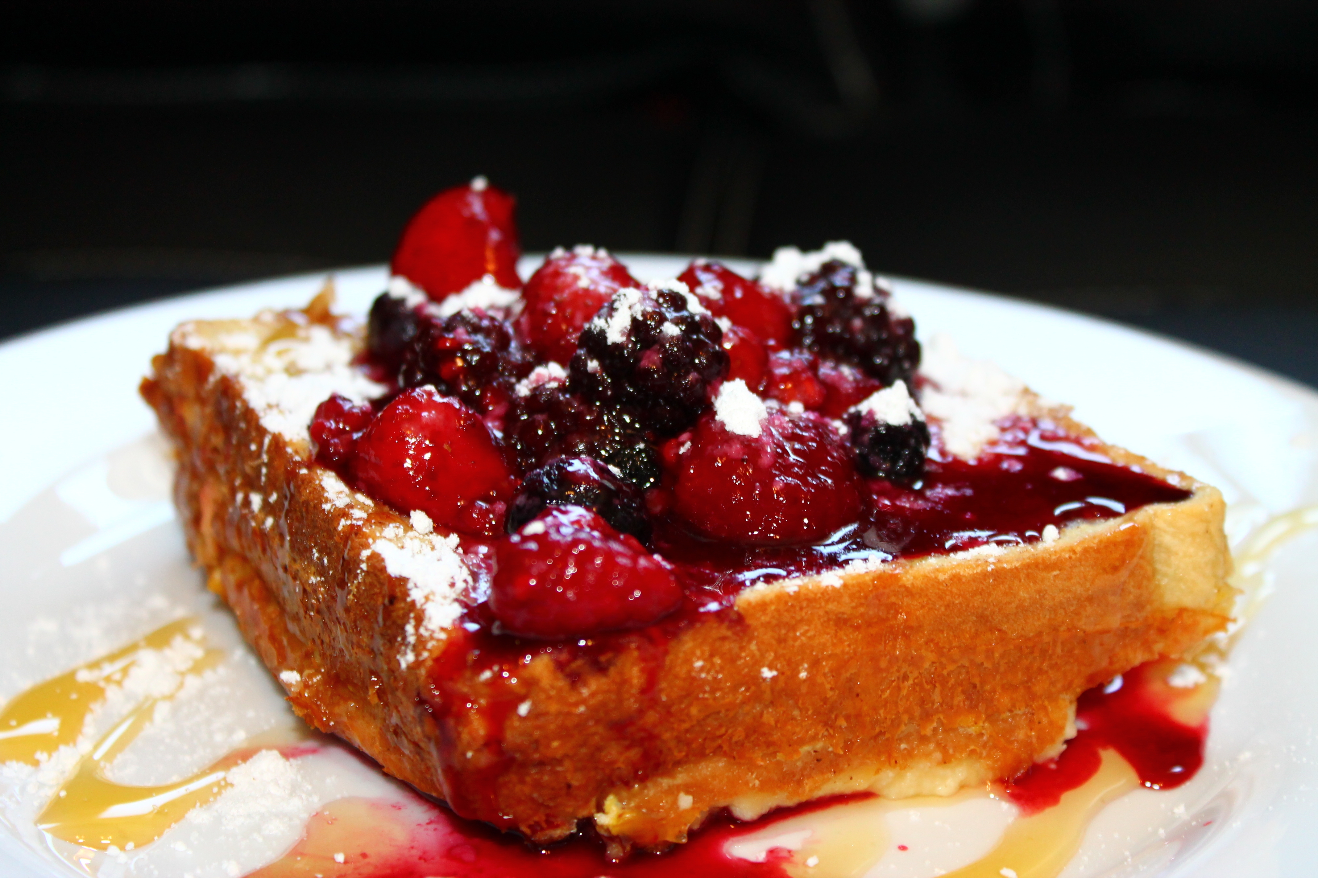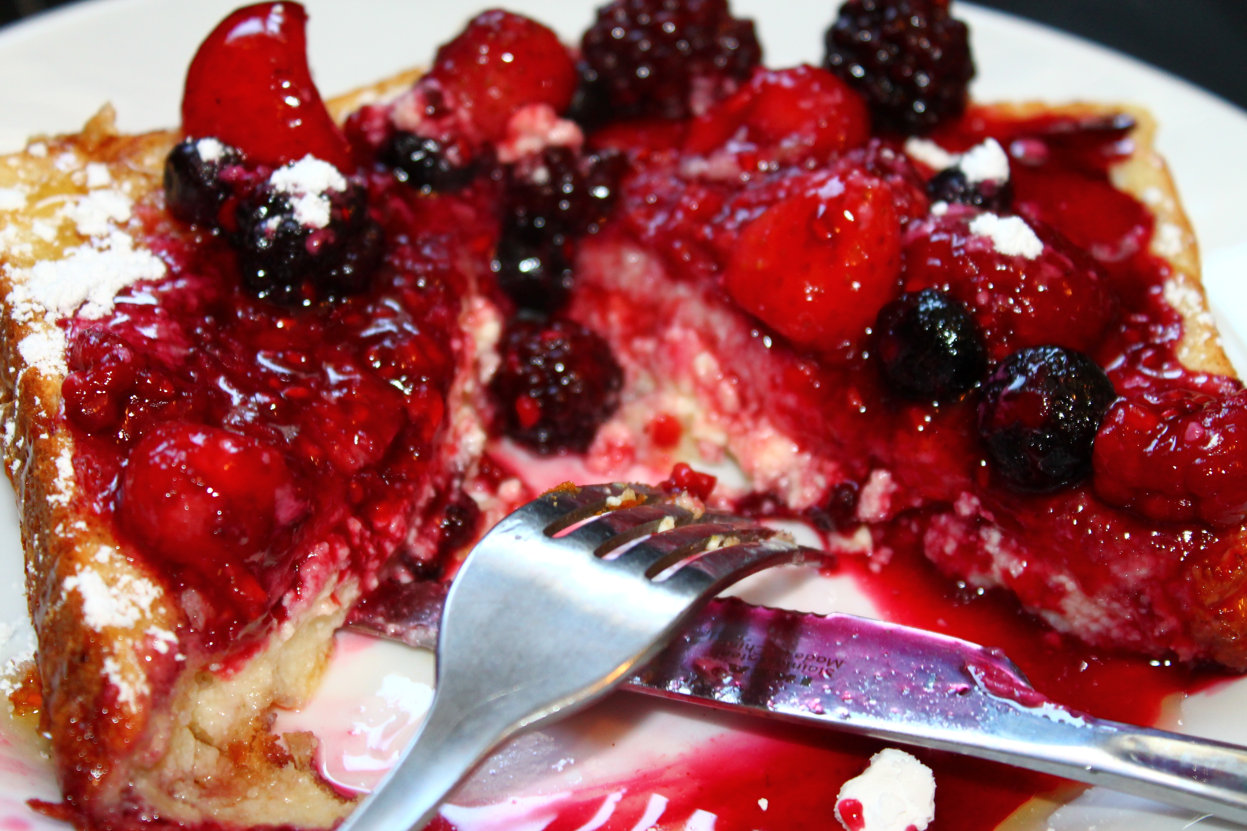 While the bread is baking, it is time to make the berry topping. I put a pan on medium heat and added about a tablespoon of oil. Once the pan was hot I threw in the berries and about 2 tablespoons of sugar. Then I mixed the sugar and berries until the mixture became thick and glossy and the sugar was fully dissolved.
