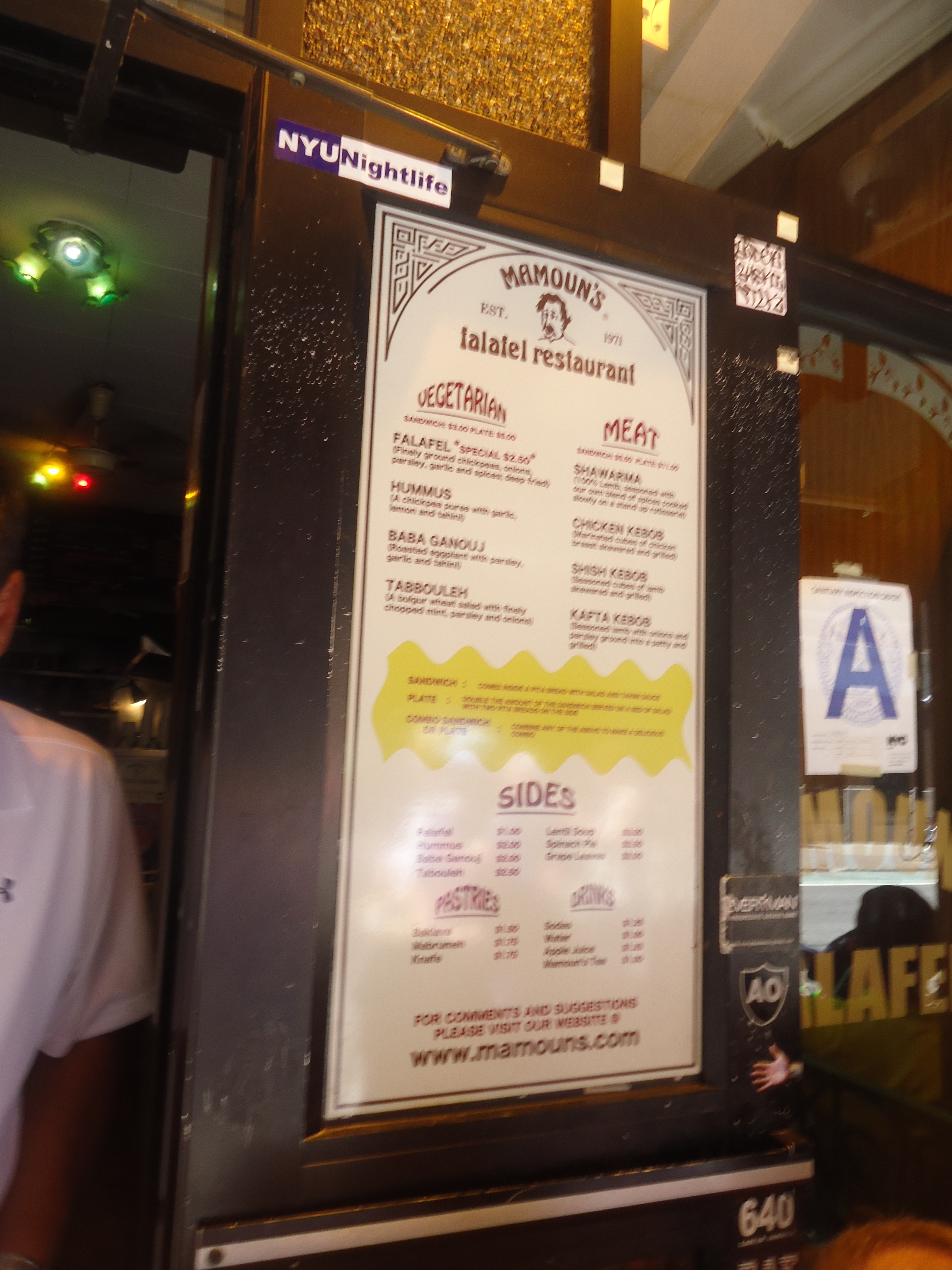 Sad attempt to get a picture of the menu. Here is the link to their menu: http://mamouns.com/menu-2. So annoying that they do not have prices. I hate when establishments do not put the prices online.