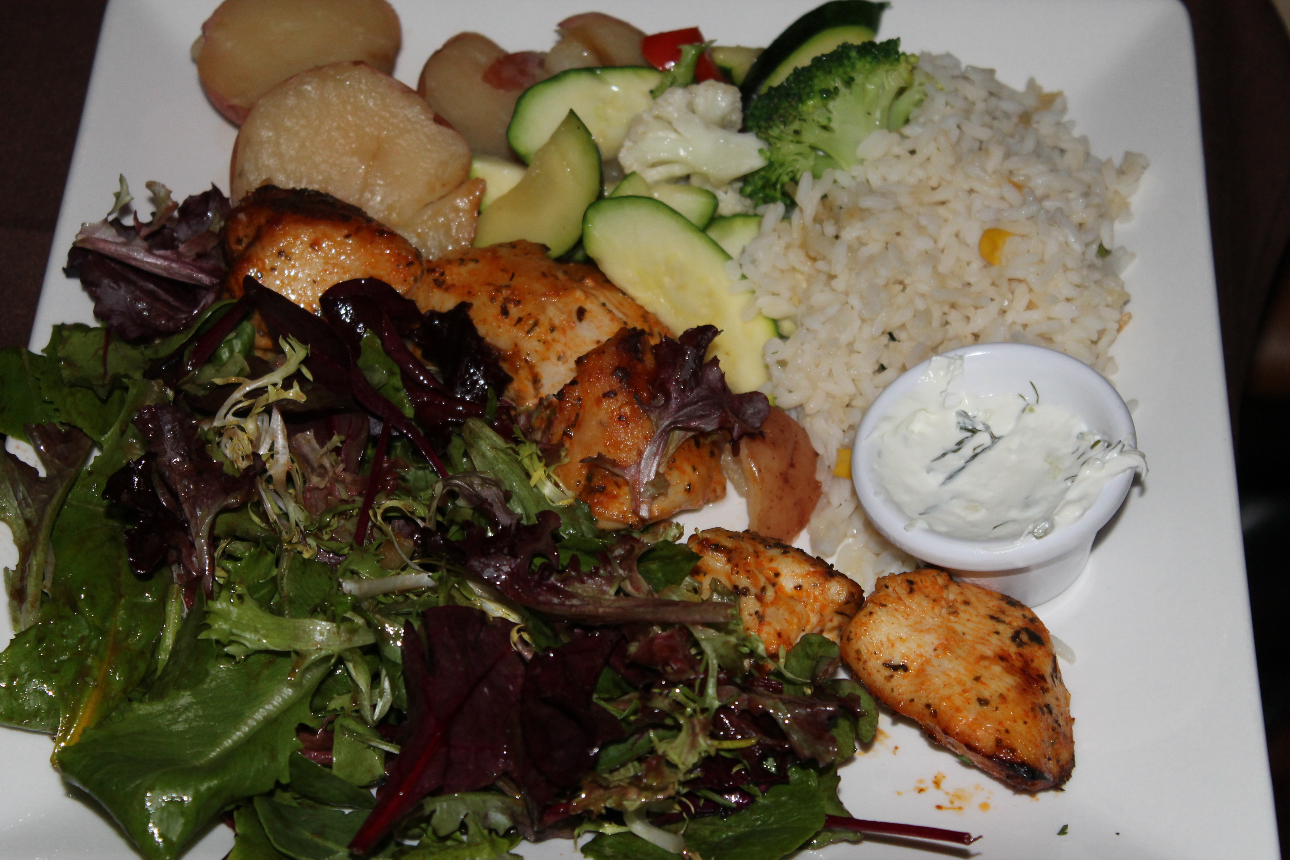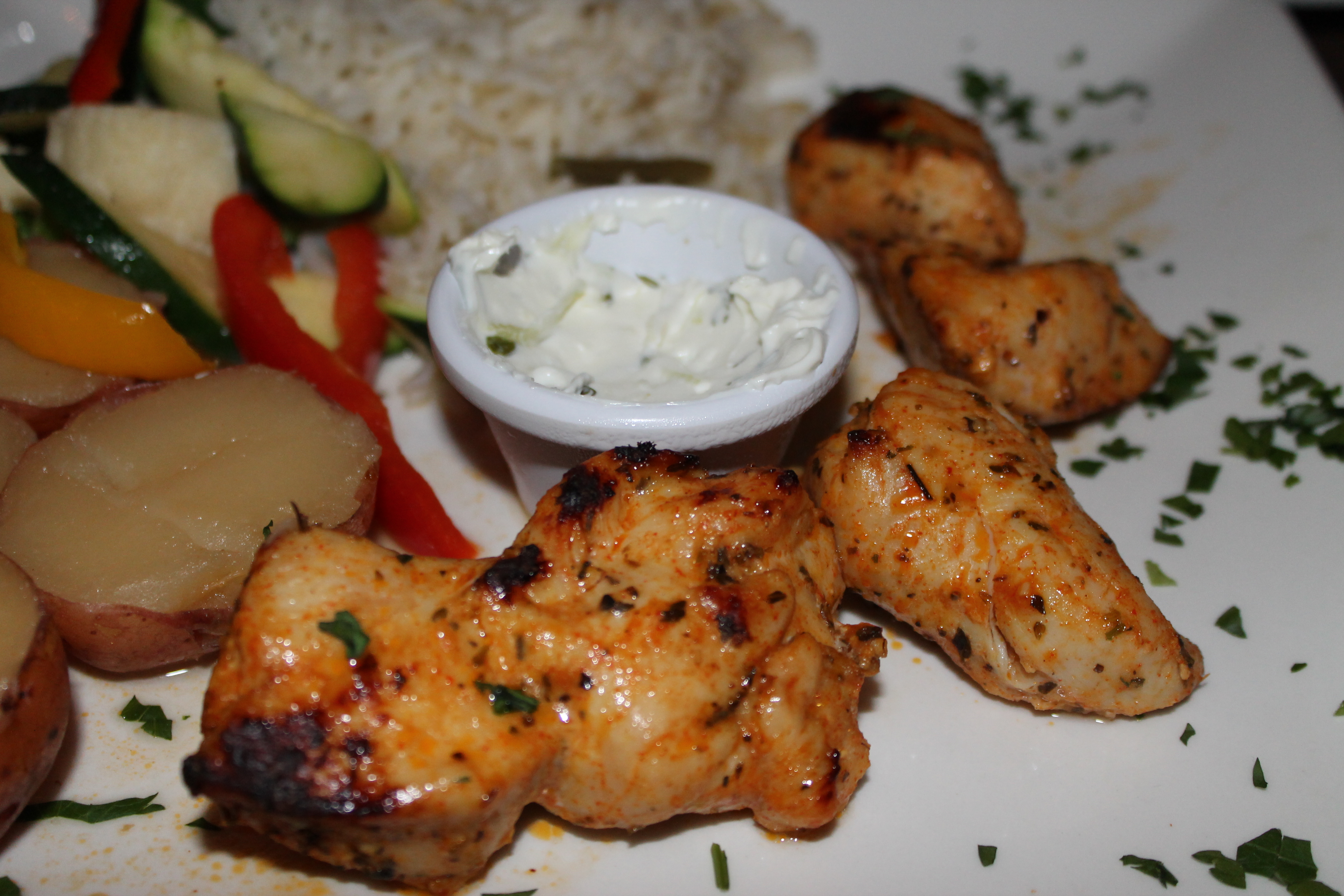 Pan Chicken Souvlaki: Cuts of chicken breast grilled and served with new mini potatoes, rice,
