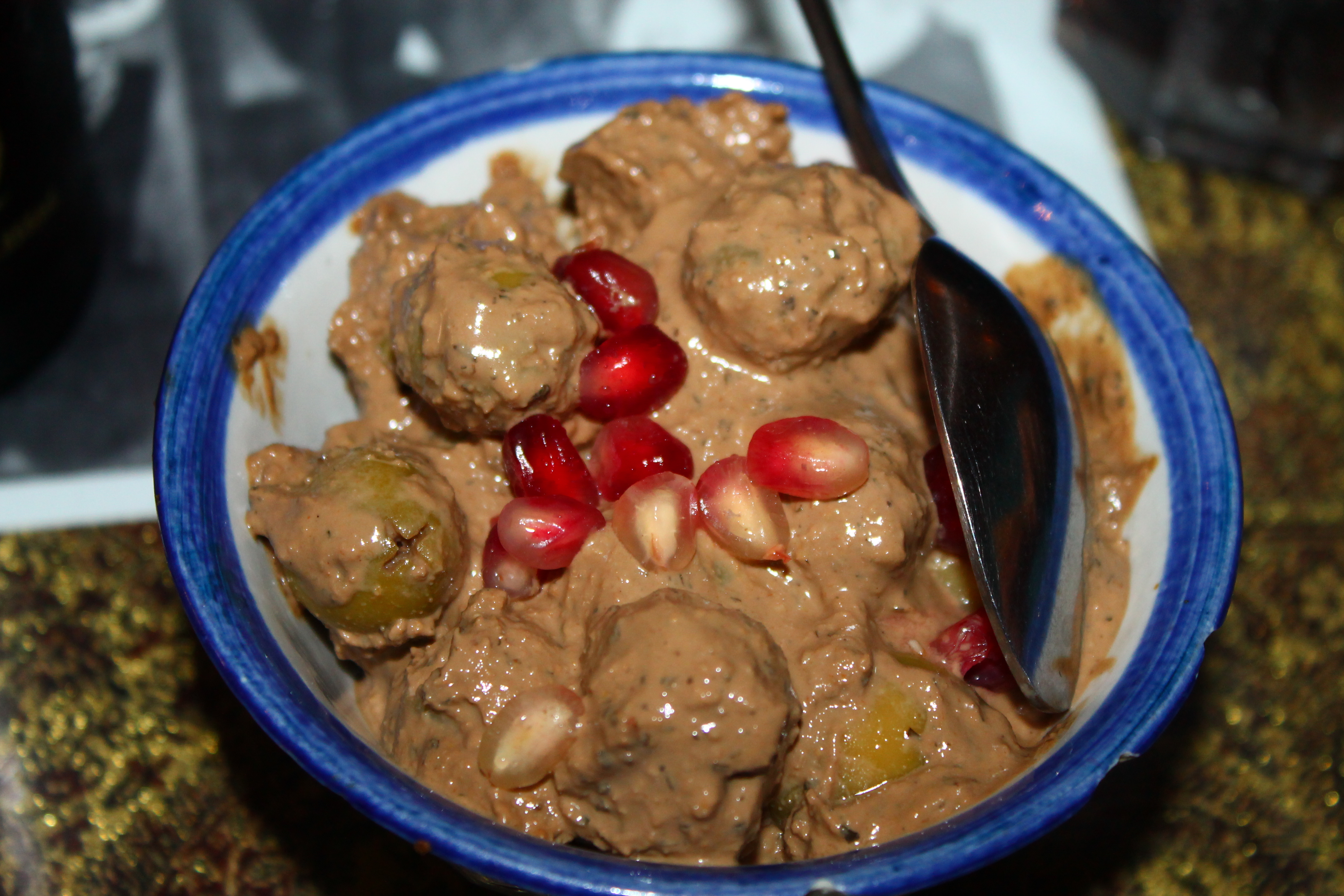 The Rudbar-style (the northern village) zeitoon parvardeh, with whole green pitted olives, ground walnuts, crushed garlic, pomegranate paste, sprinkled with mint