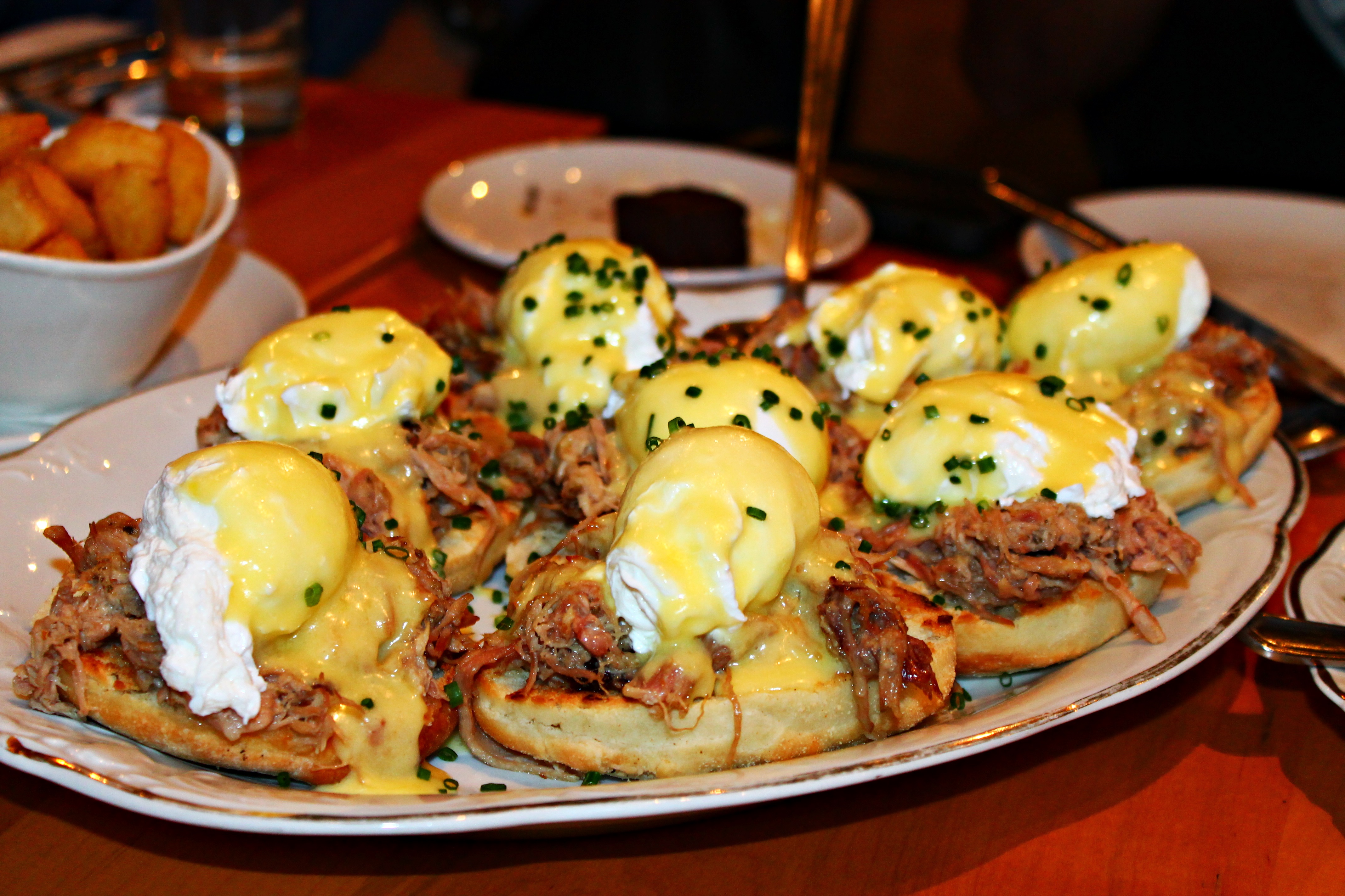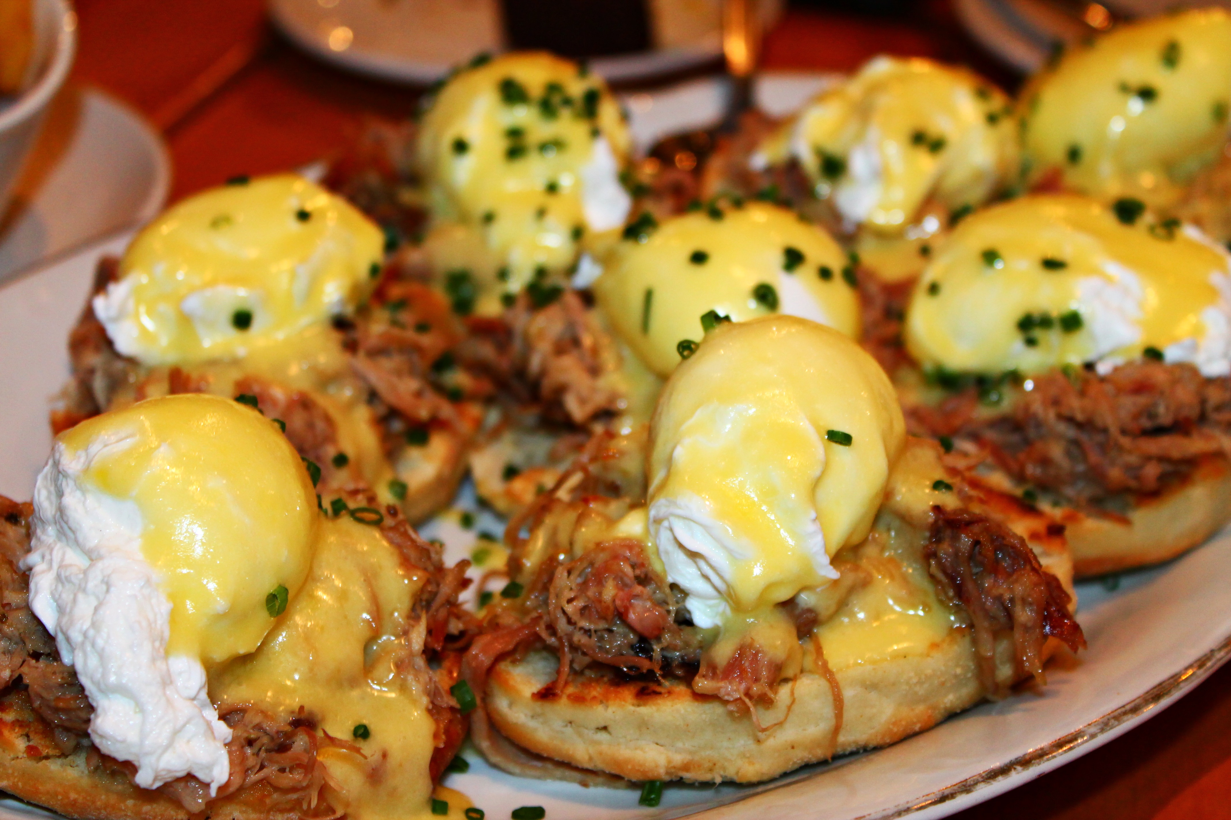 Pulled Porchetta Benedict (poached eggs, hollandaise, housemade English muffin)