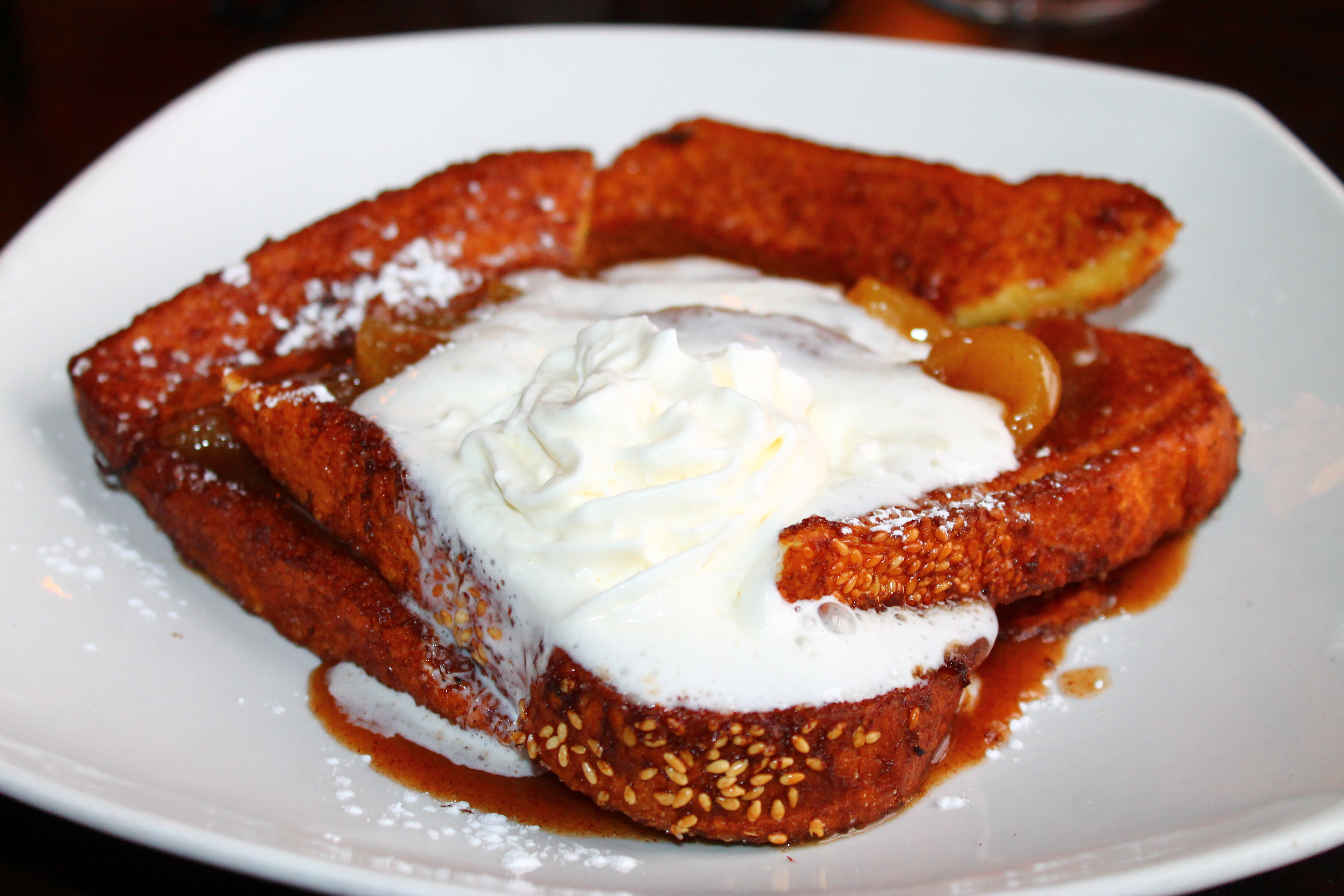 My friend and I loved the French toast. In fact, I knew better than to let my friend free range at it—I was getting my share dammit! The only thing that I did not understand was why the bread was so thin, when I knew for a fact that it was challah bread. What happened? Well, apparently the bread was deep-fried and this resulted in the bread losing air and well, having the “pancake” look. Mmm, I do wonder what the result would have been if the bread was not tampered with? And by tampered, I mean deep fried.