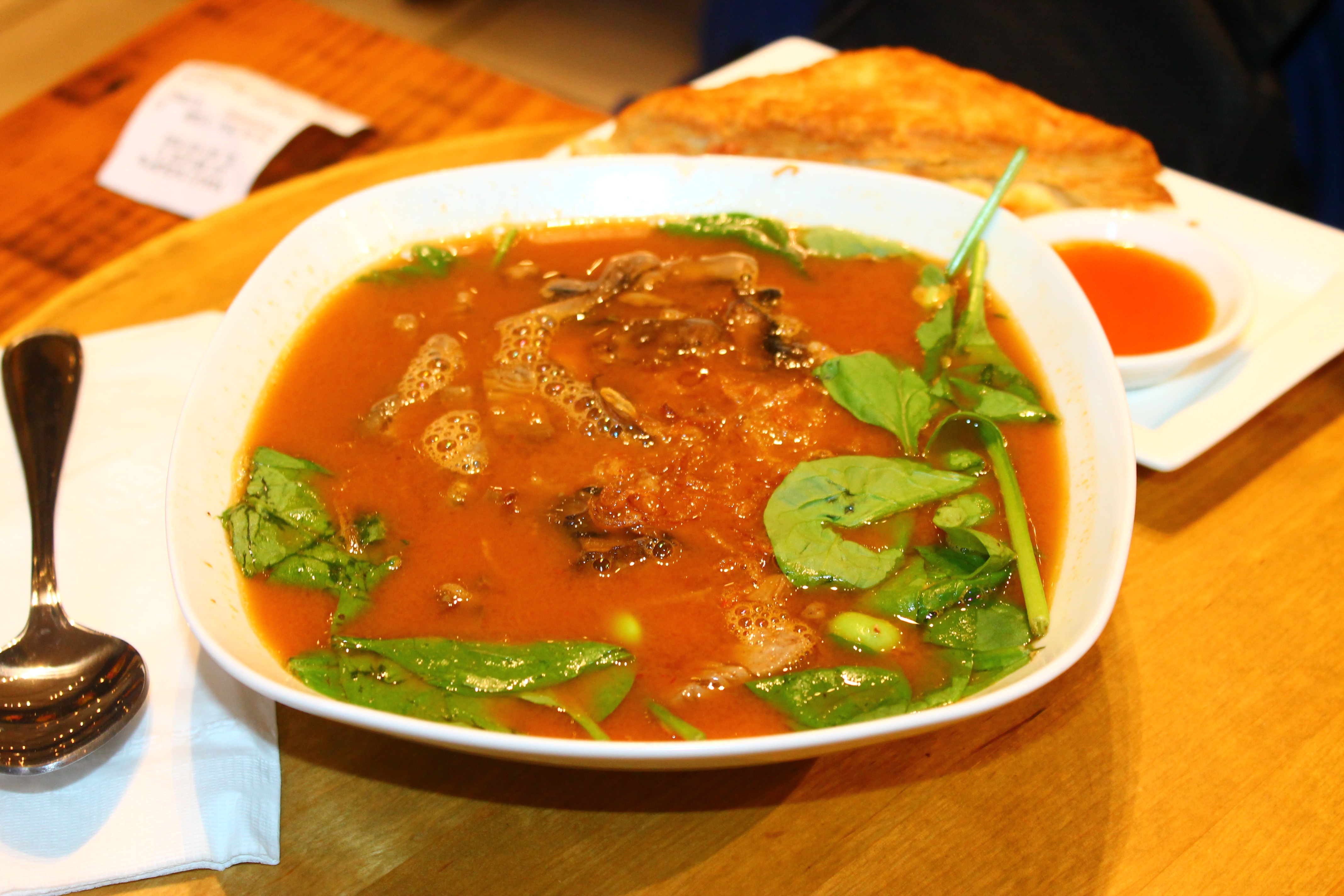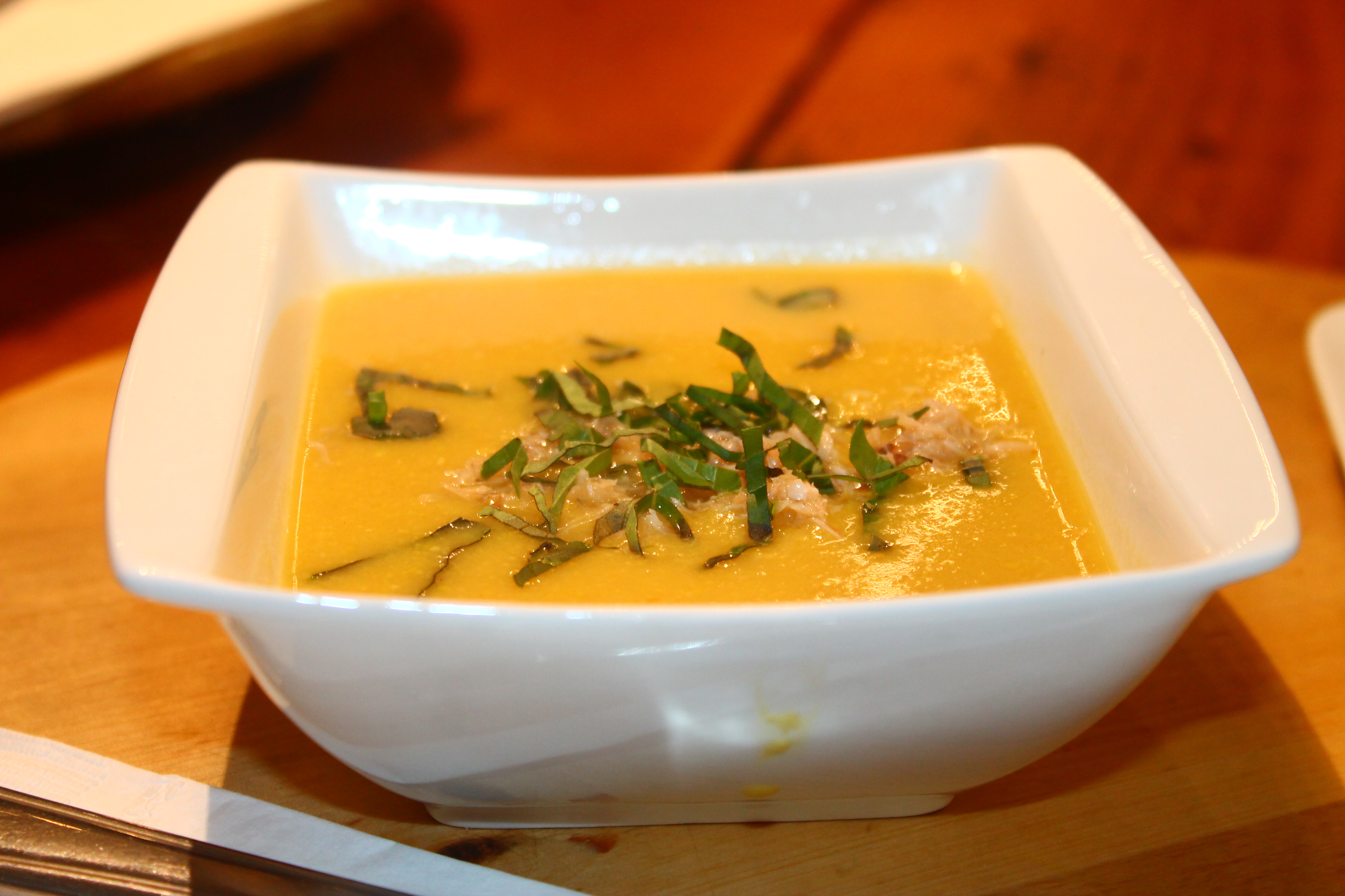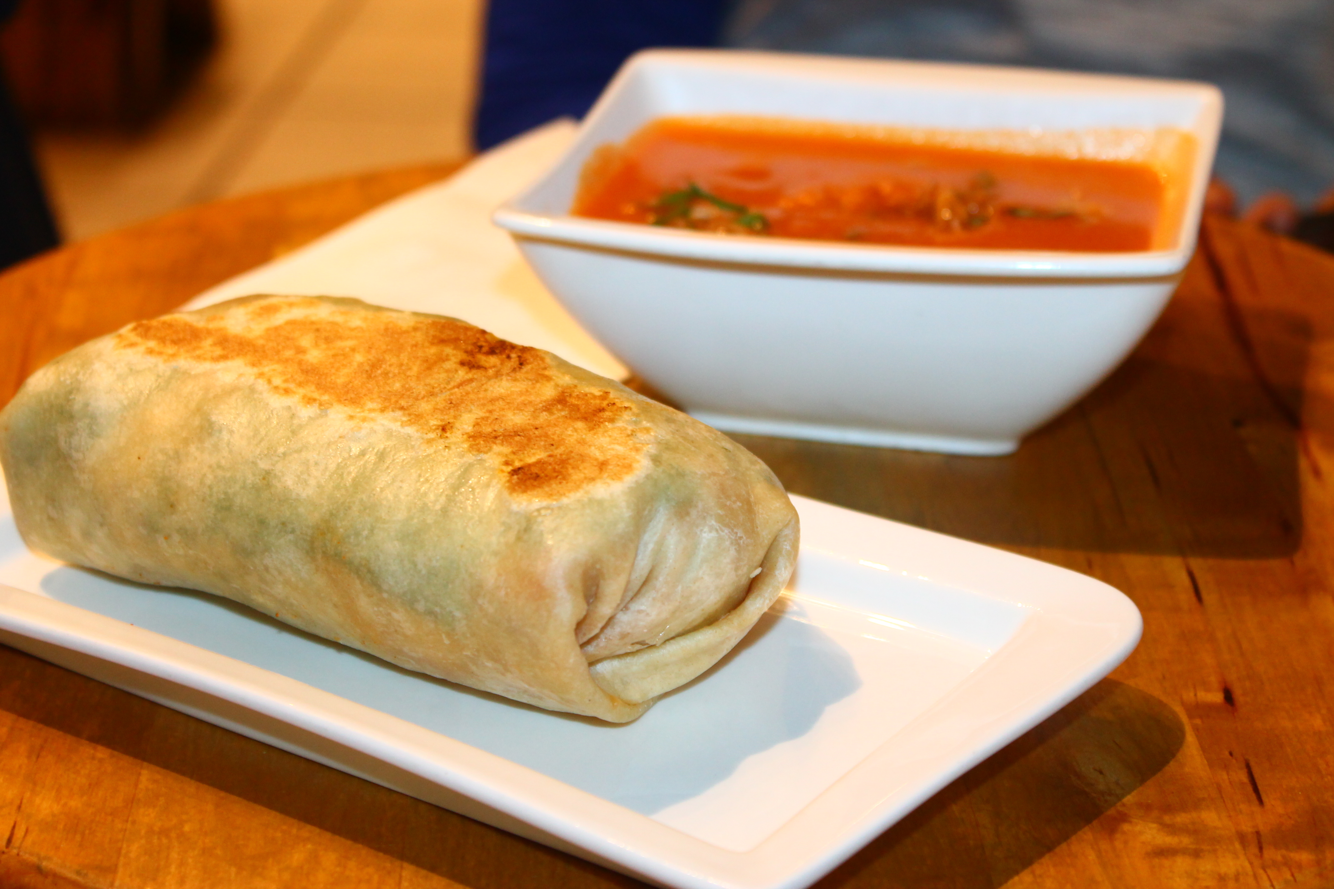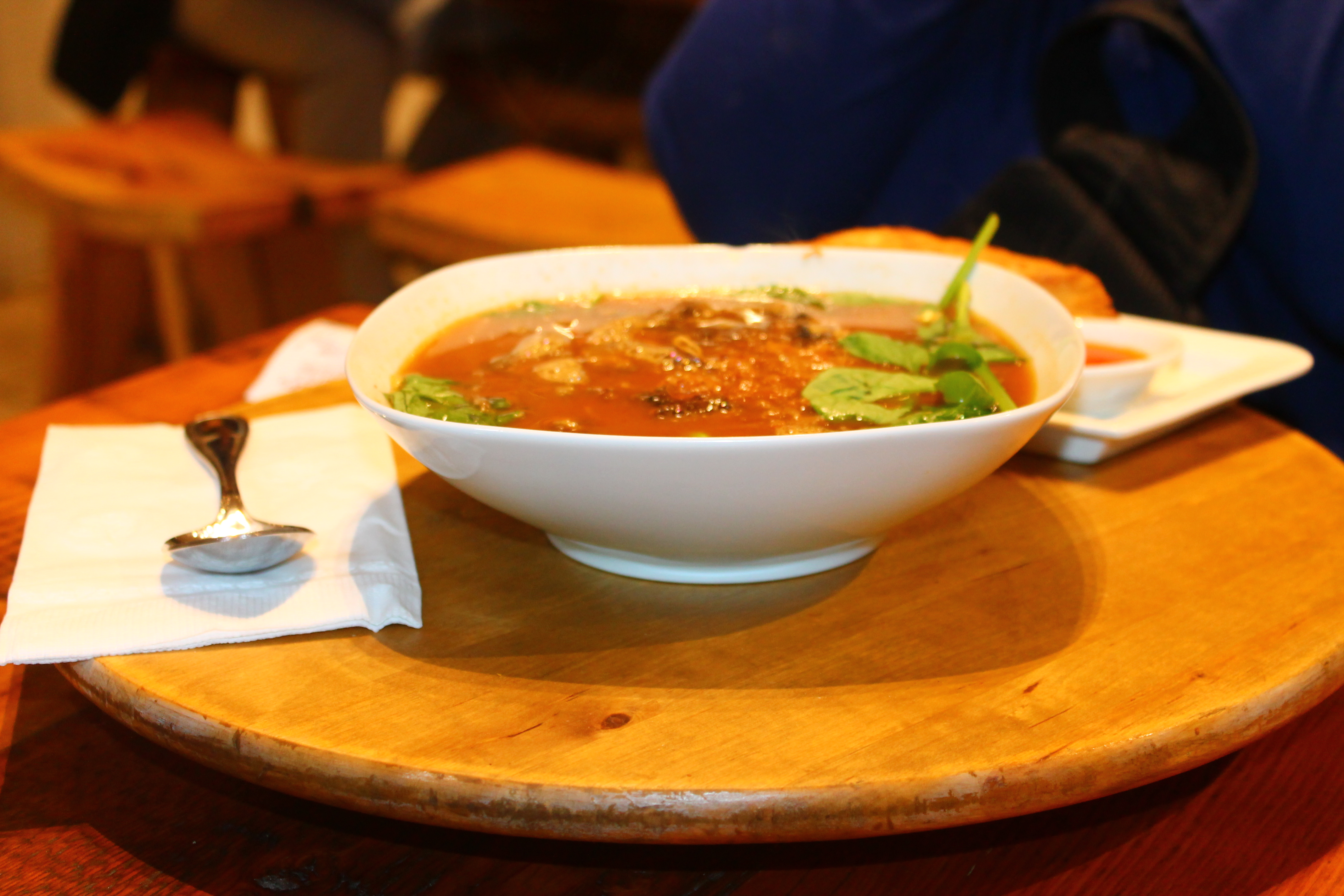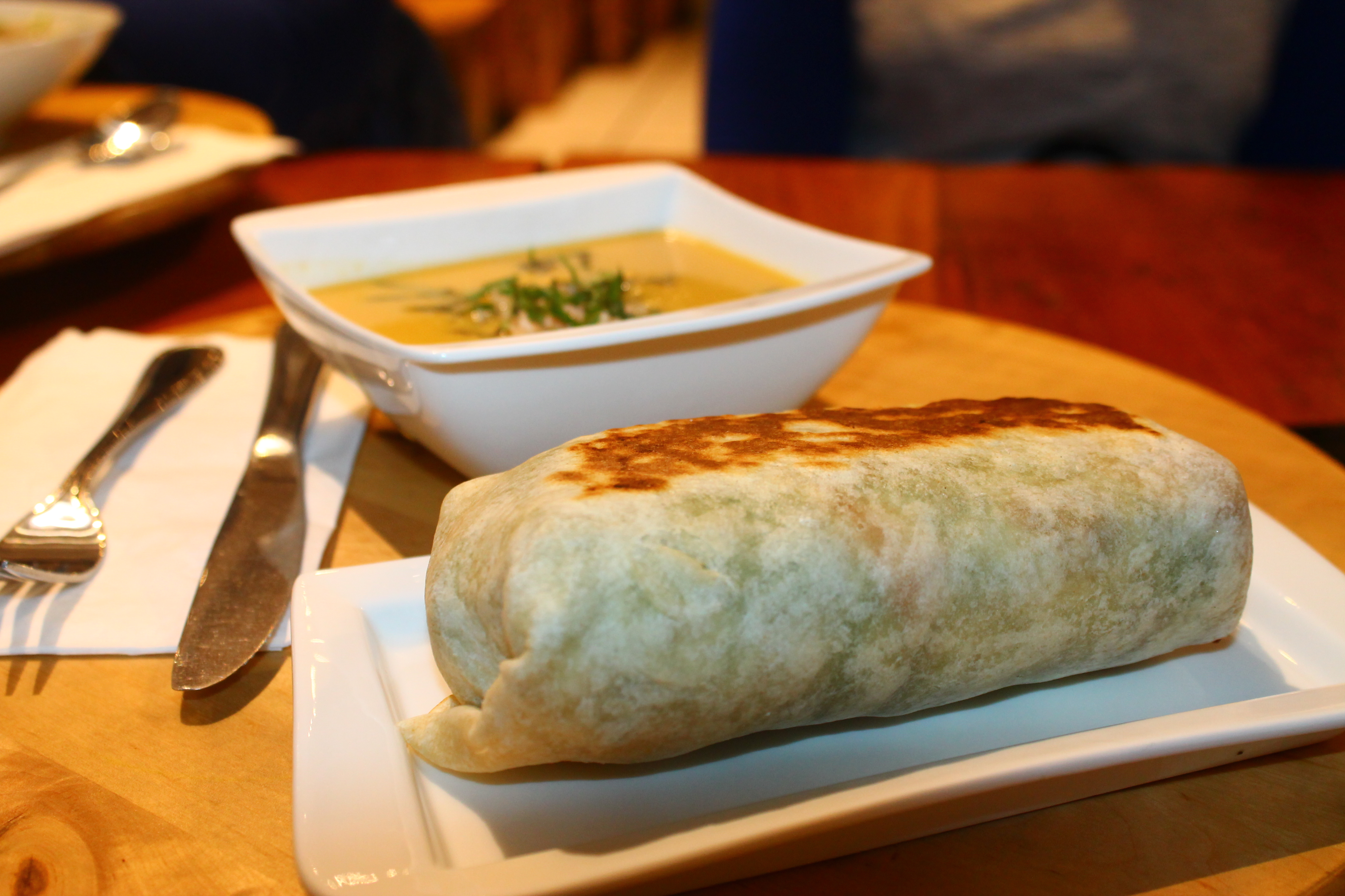 I love soups, and did a lot of research to find the best soups in Toronto. I read many reviews, and Ravi Soups consistently received rave reviews from diners. So I got three friends together and we visited the Adelaide location (they also have locations on Queen Street West and Charles and Yonge). The space was rustic with plenty of seating indoors, and they also had a patio. My friends and I found seats and we eat took turns going to the front to order. The three of us decided to get a combo (soup and wrap). I had spent a lot of time reading through the menu, and recommendations from other diners, and decided to go with the very popular Corn Chowder made with blue crab, thai basil and crispy shallots.