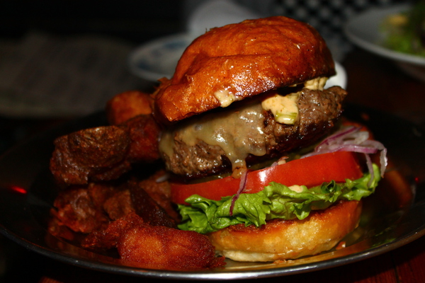 THE WHIPPOORWILL BURGER: ground prime beef, cheddar cheese lettuce, tomato, onion, Russian dressing, buttered bun & potato wedges $14