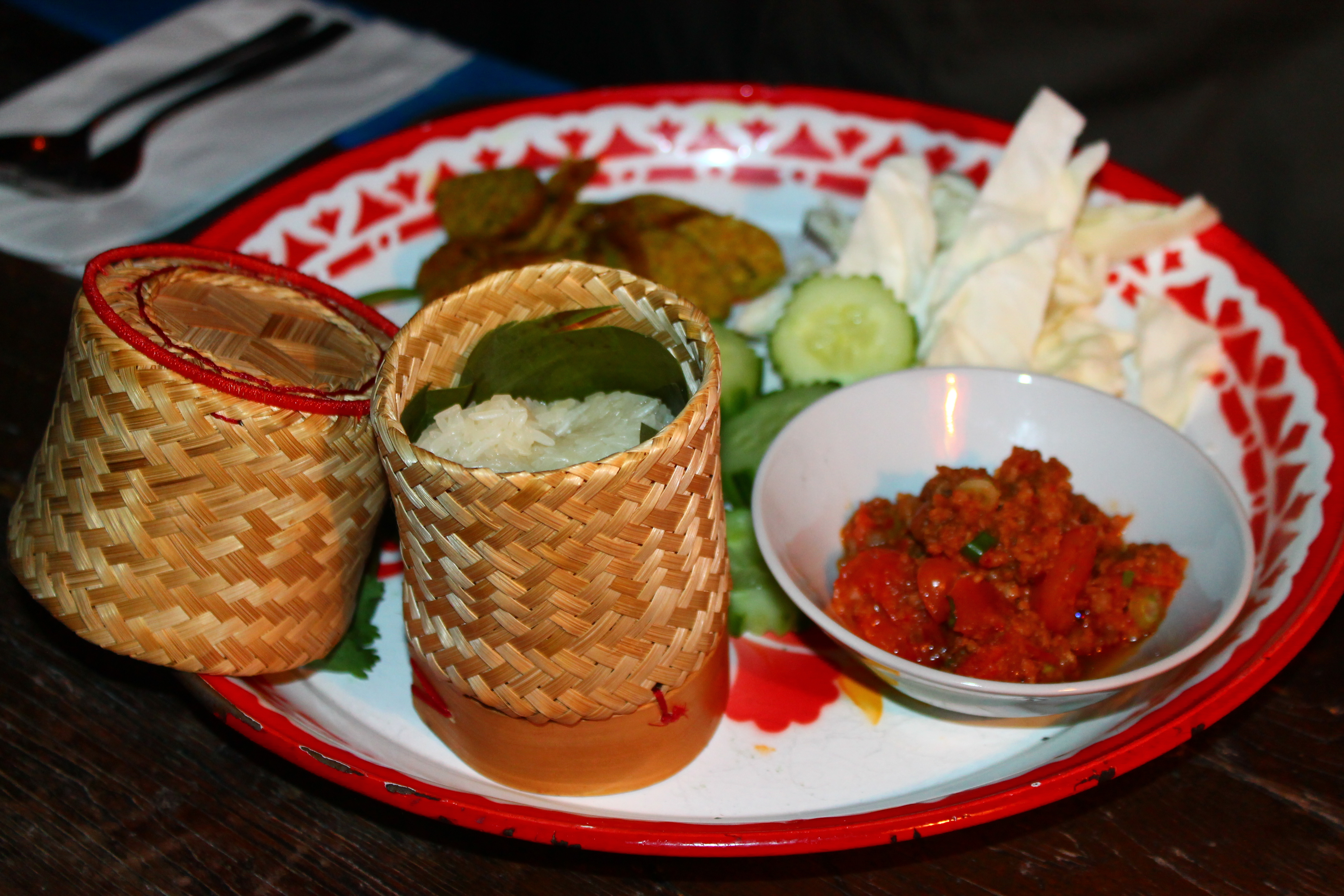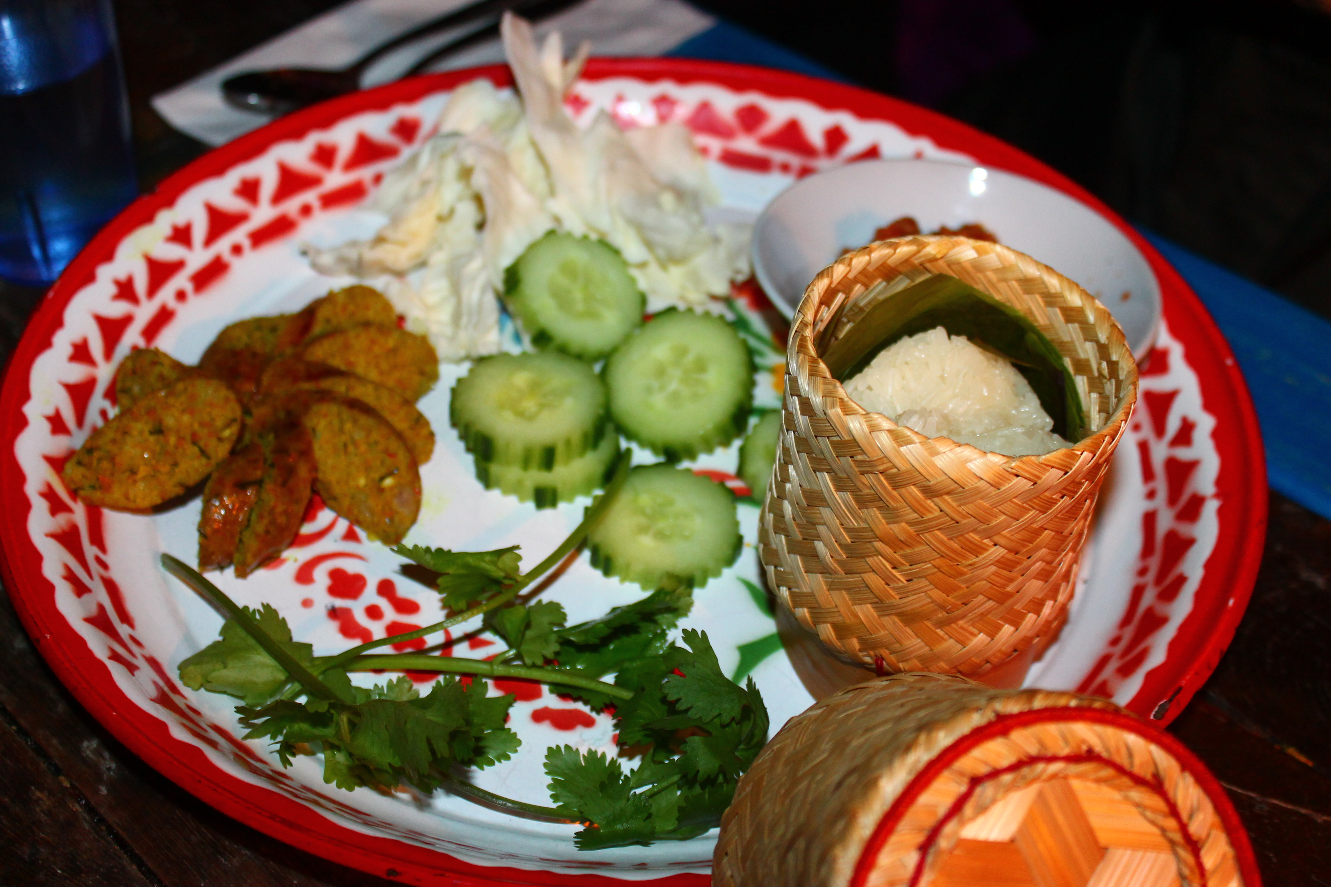 Grilled pork belly sausages with fresh tumeric, kafir lime leaves, lemongrass, garlic and shallots served with sticky rice and a northern Thai relish