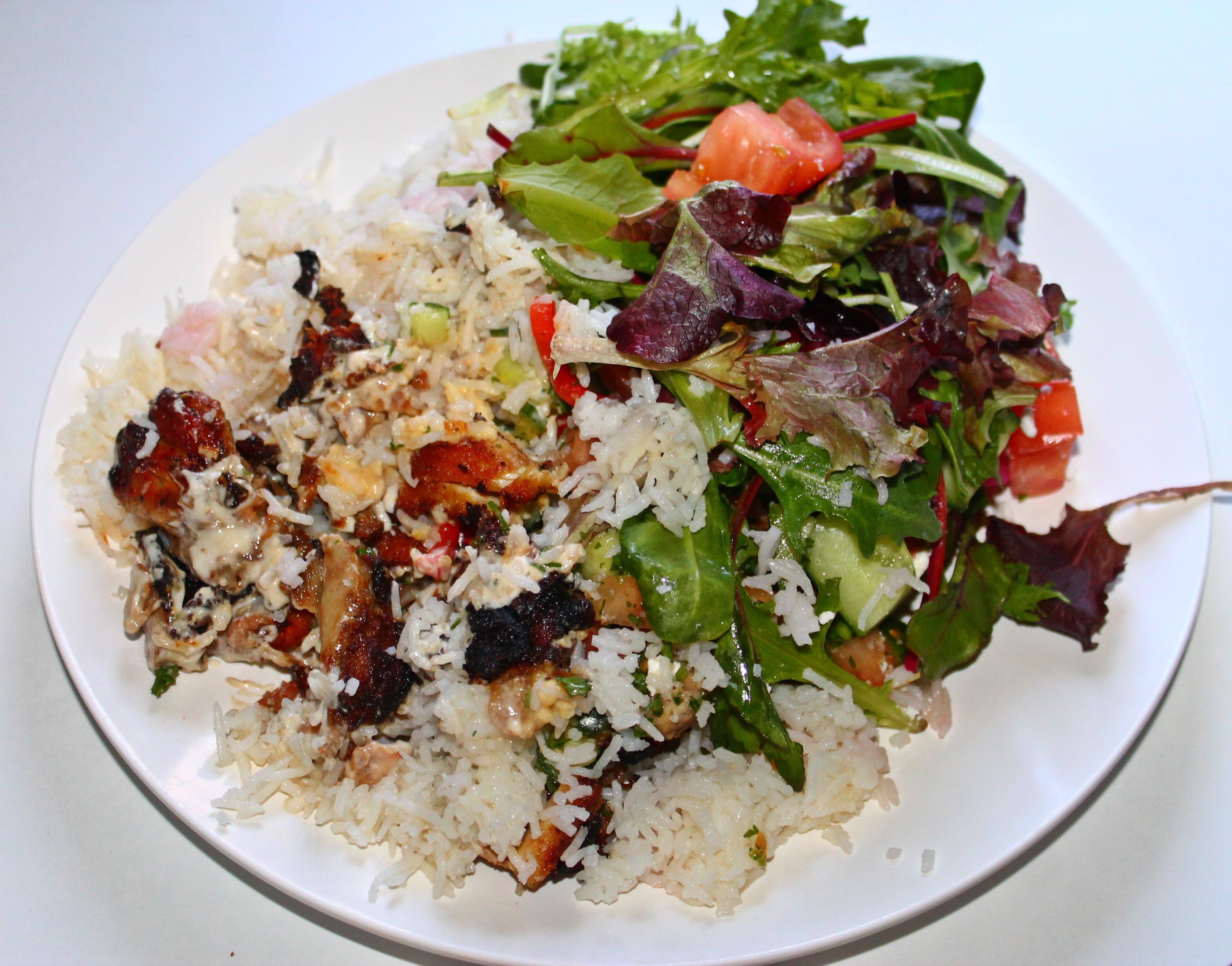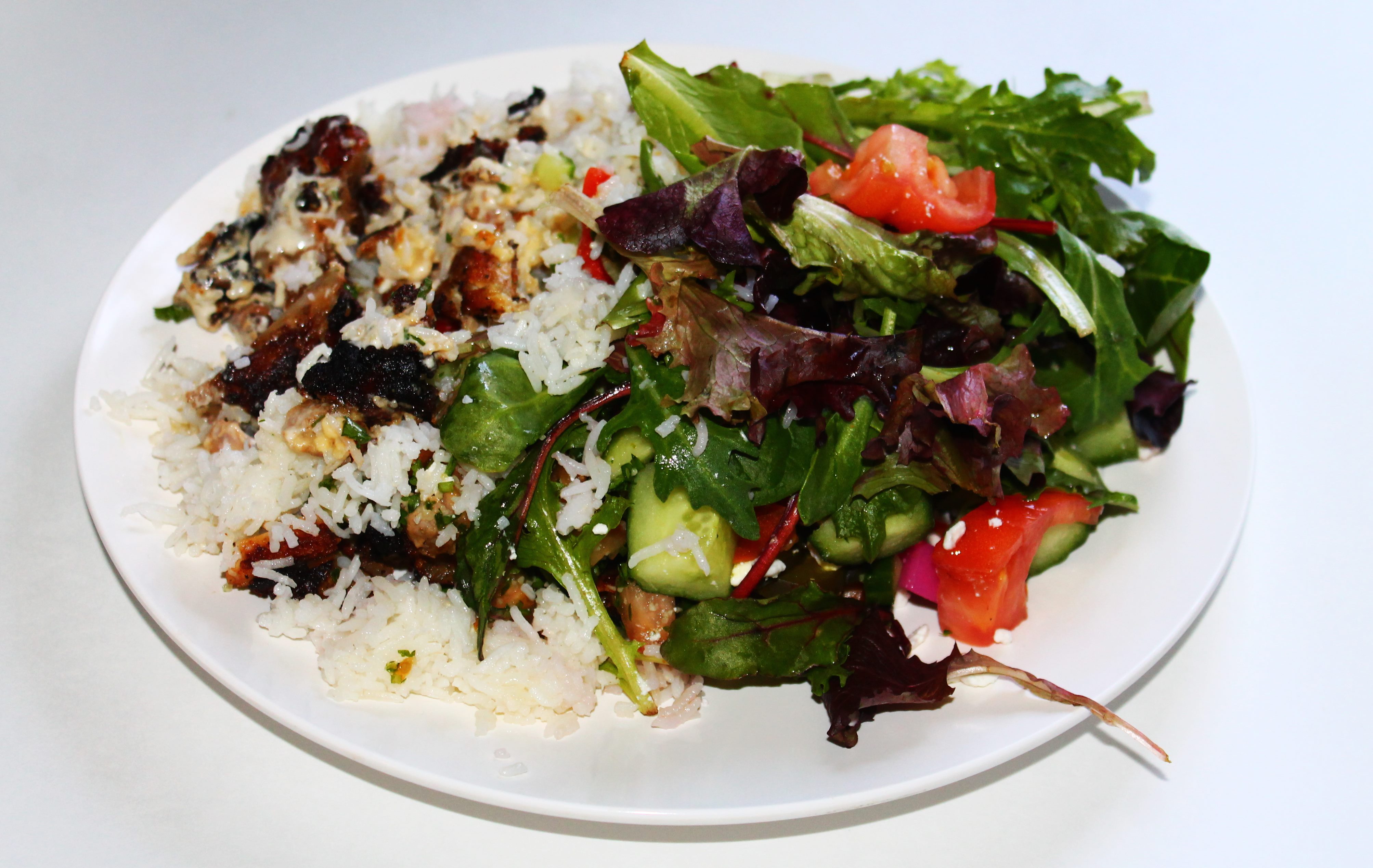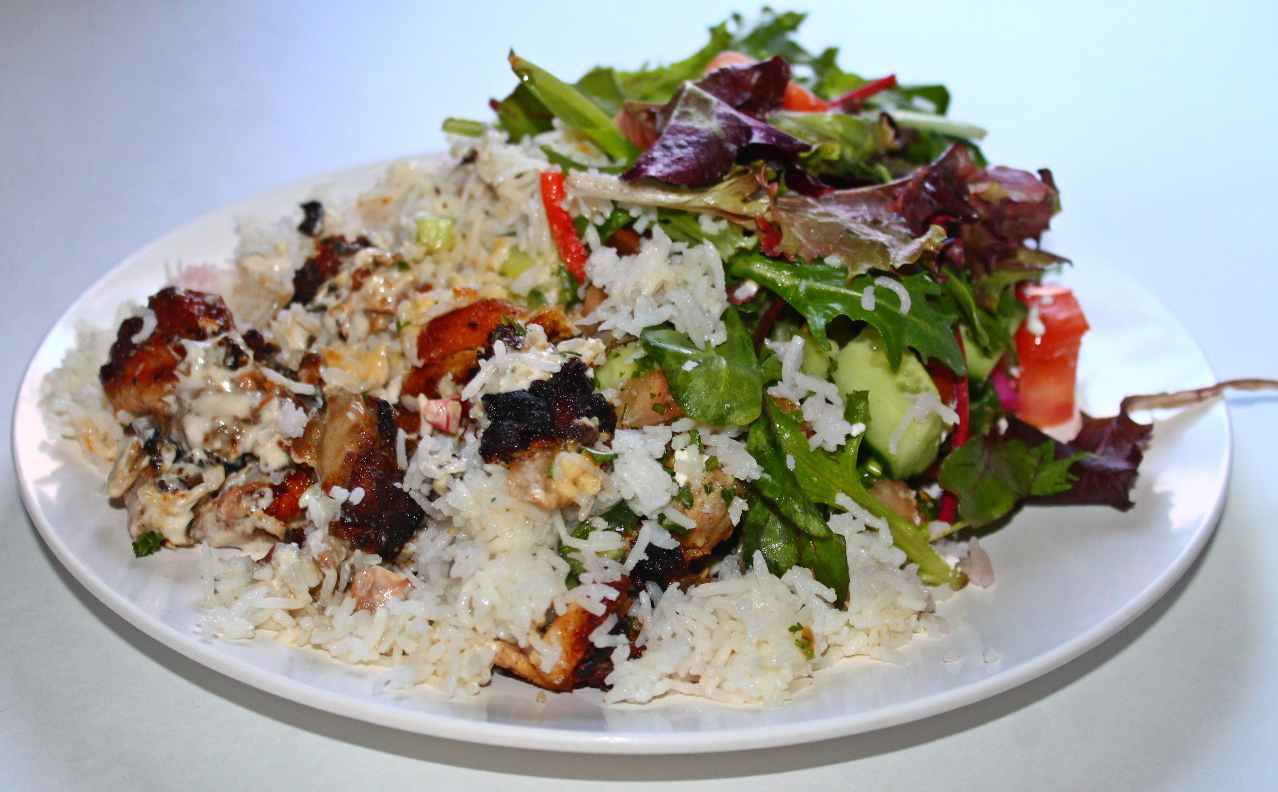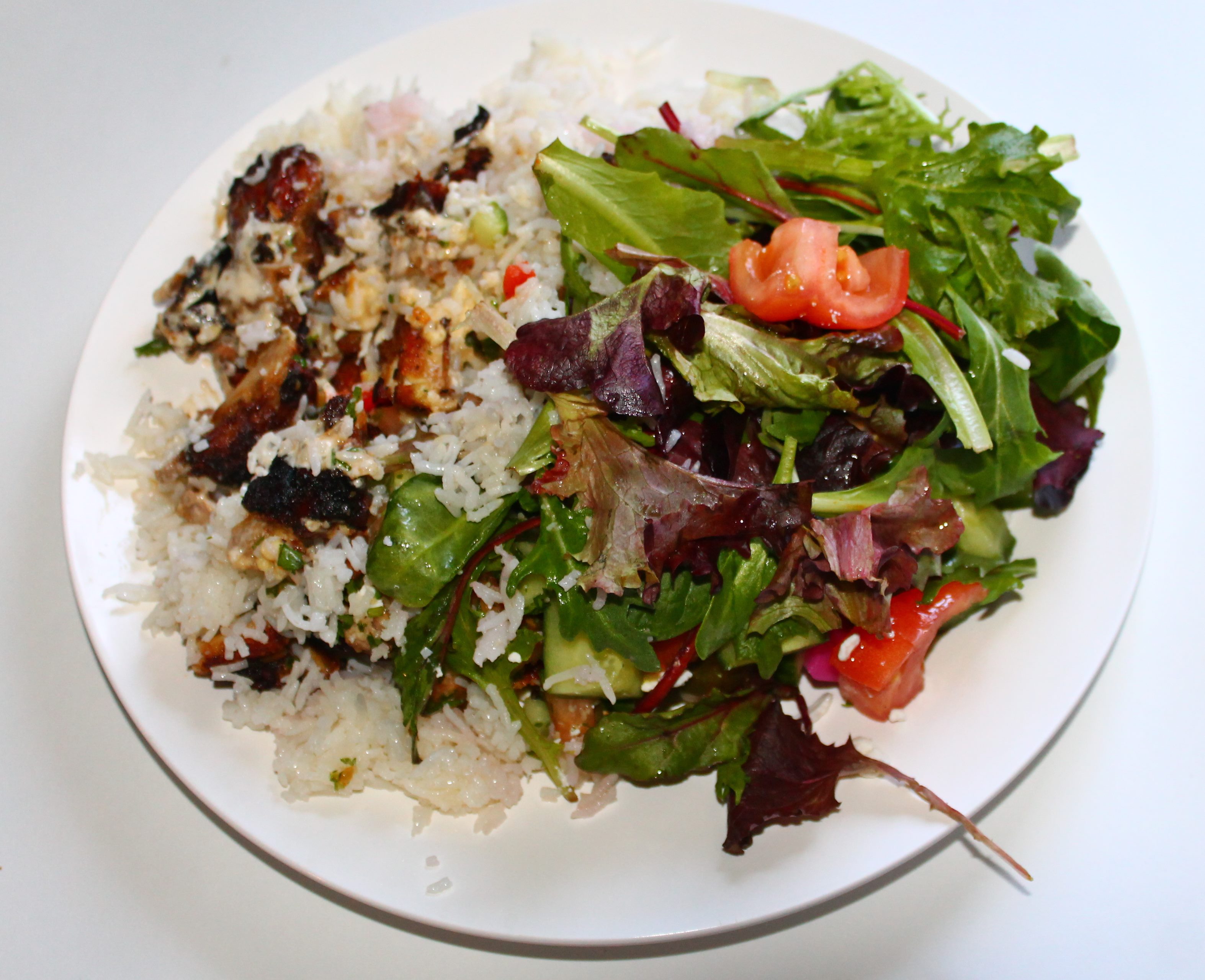 When I got home I opened the container and it was overflowing! In a good way. To show you the amount of food you get if you order a small plate, I rummaged in my cupboard looking for my biggest plate, and then flipped the container on it – that is why you see a lot of rice on top and little chicken. Believe me, there was A LOT of chicken!! In fact, there was a lot of everything! And every ingredient was fresh, the chicken was moist and well-seasoned with little fat – big points for that! Most importantly, everything tasted clean, healthy and naturally delicious. $6.99 plus tax is a bargain for the quality and portions you get at Salad House. I am already planning to pick-up lunch from here on my next day off.