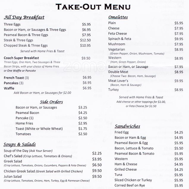 I am a regular at the Coach House, and I often come here for lunch with my colleagues. For lunch I either get their All-Day-Breakfast (three scrambled eggs, bacon, hash browns, and white toast with a one pancake), or their chicken souvlaki on a pita – both of these options are $6.95 + $2.50 for one pancake. Or you can choose to get one order of pancakes for $6.95 and you get three pieces. This is what I love about this diner: