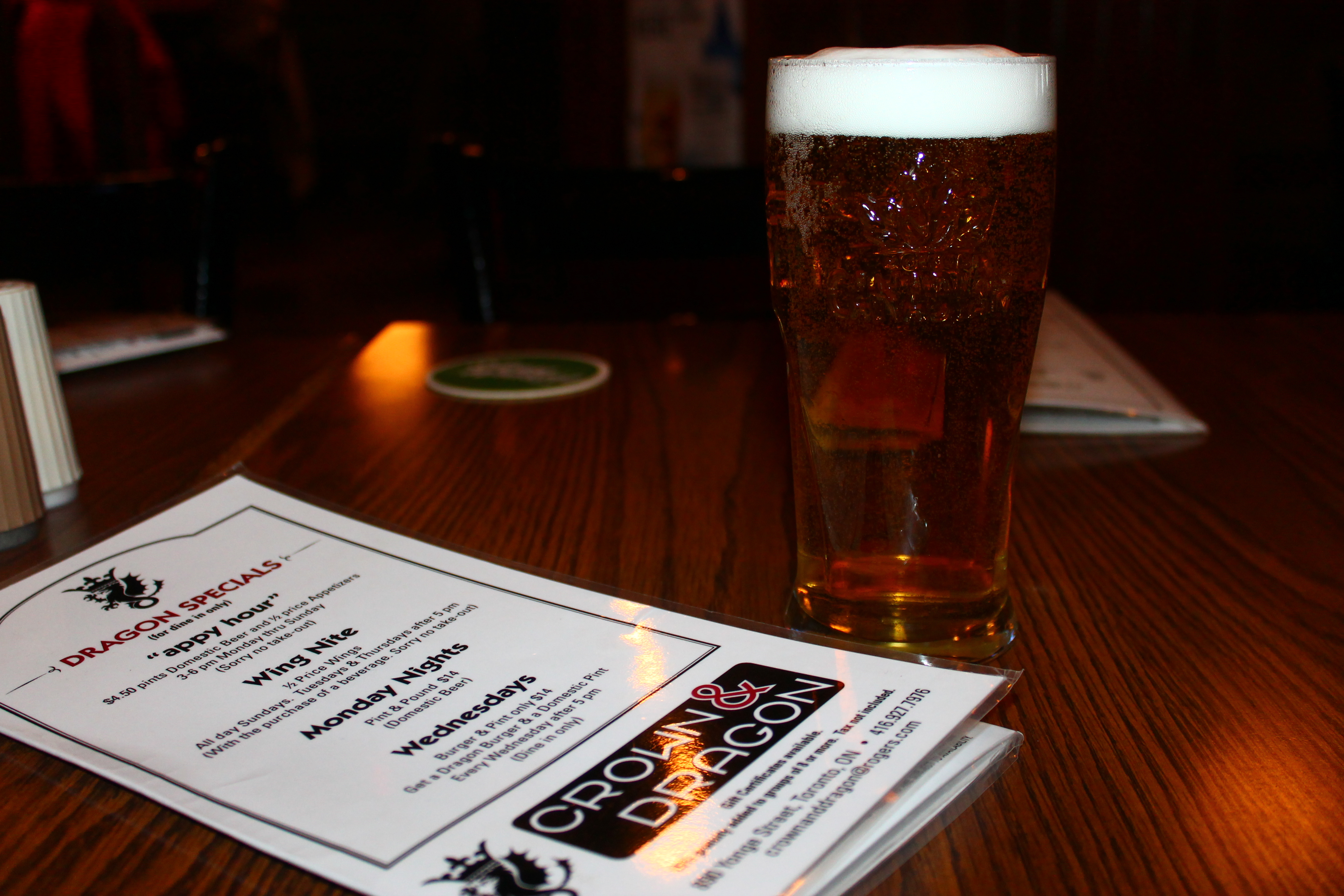 I have walked past Crown and Dragon many times, but had never gone in. So when I won a $25 gift certificate on Twitter (@CrownandDragon) it was a bit worrisome since I live a short walk away, and if I liked it, chances were that I would make excuses to return – cause I love pubs, and one that serves great wings would be a dangerous place for me to frequent (got a figure to maintain ;)). Anyway, I contacted three of my closest friends, and suggested that we visit Crown and Dragon on an evening when wings are 50% off – so we went with a Tuesday night.