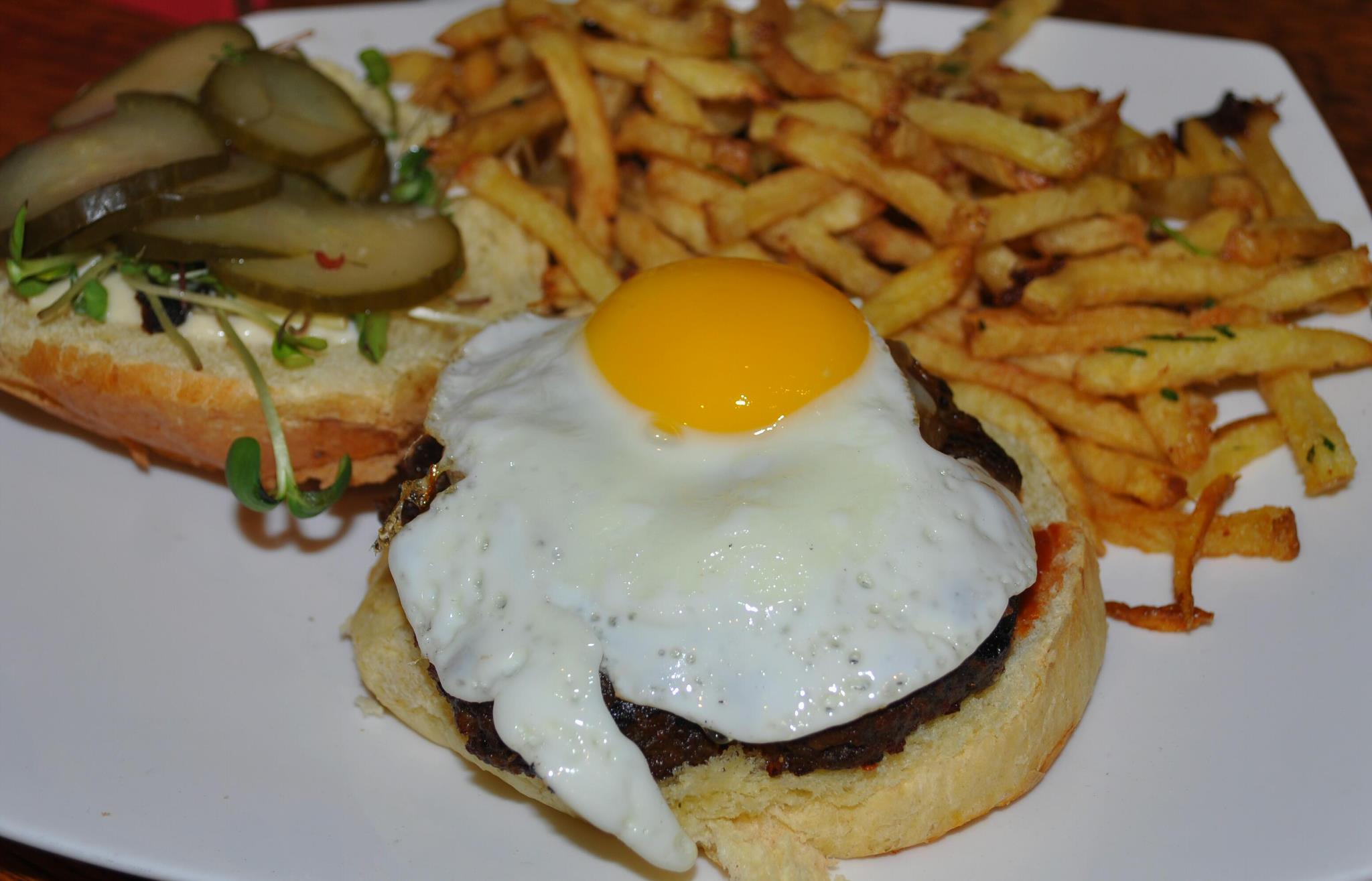 - CROQUE CHAMPIGNON (VEG) Grilled portobello mushroom, caramelized onions, arugula, triple creme brie + organic sunny egg on grilled multigrain + frites $14.5