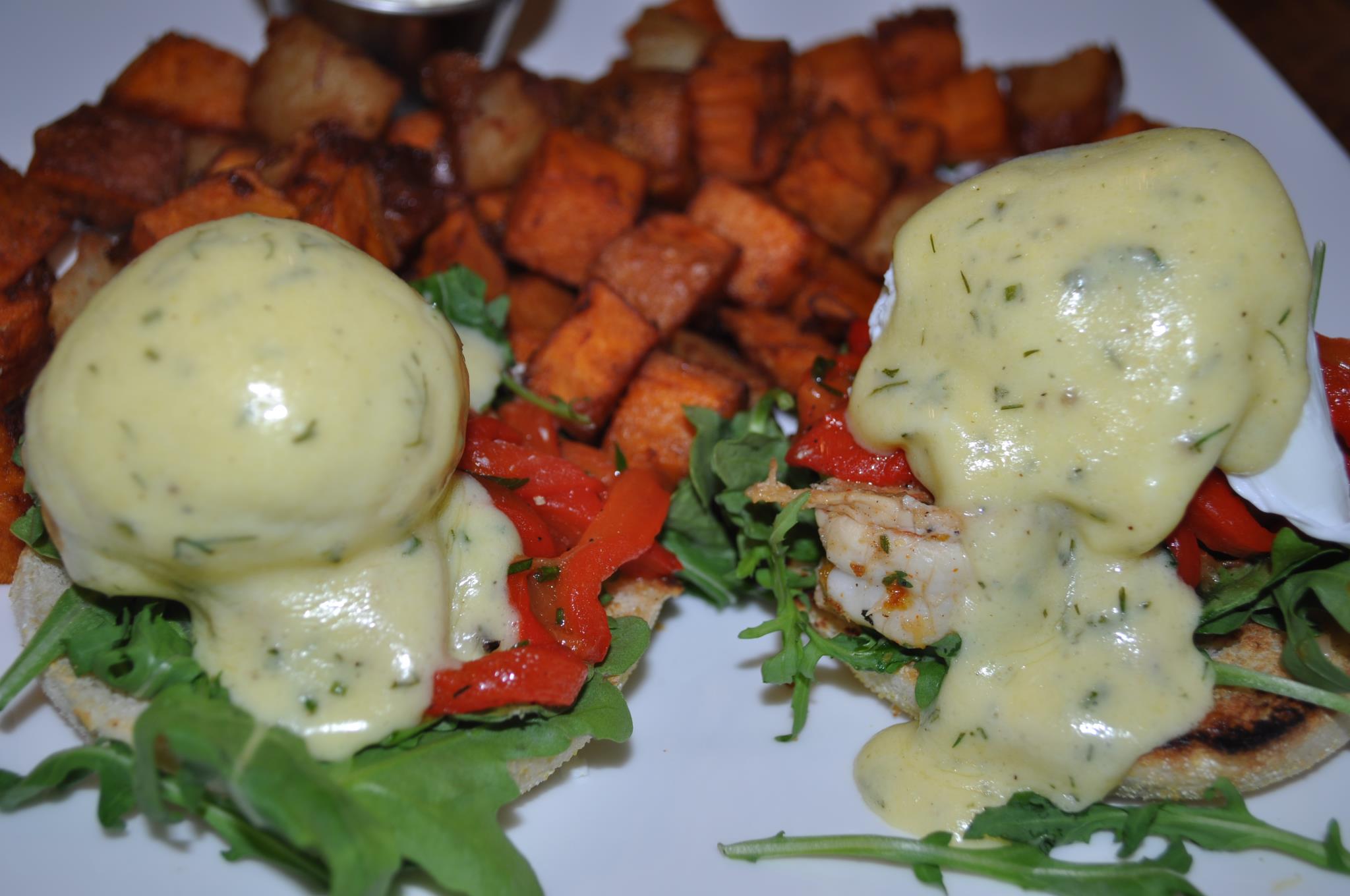 - Eggs Benny Special with roasted red peppers and poached shrimps