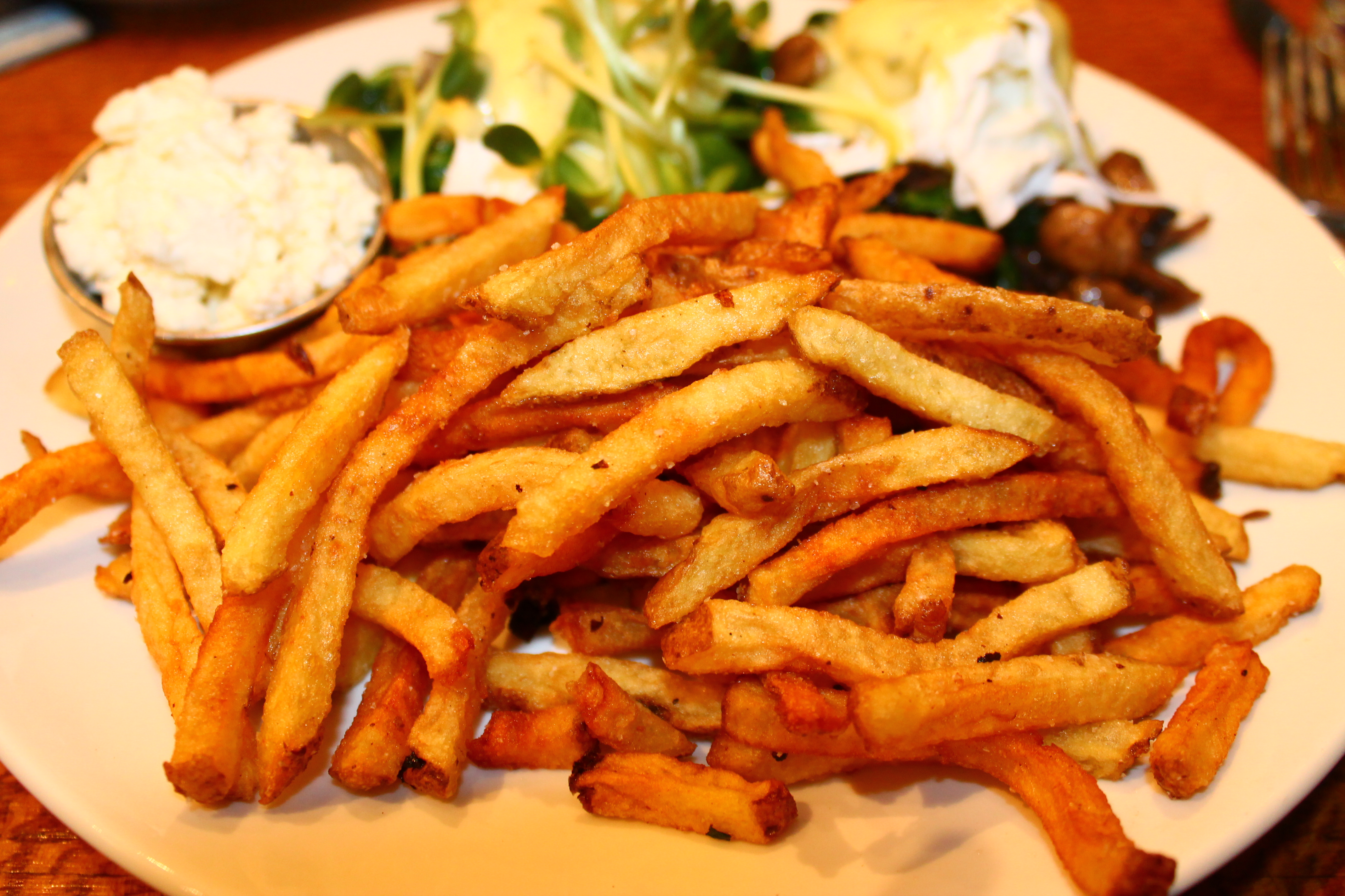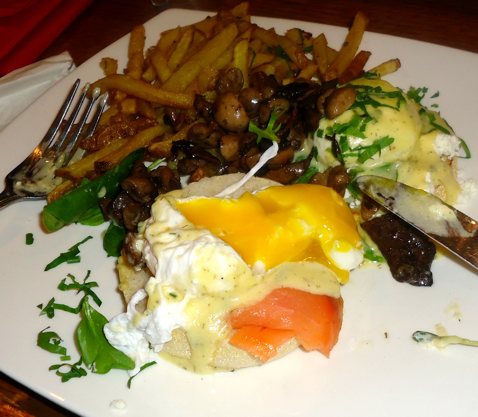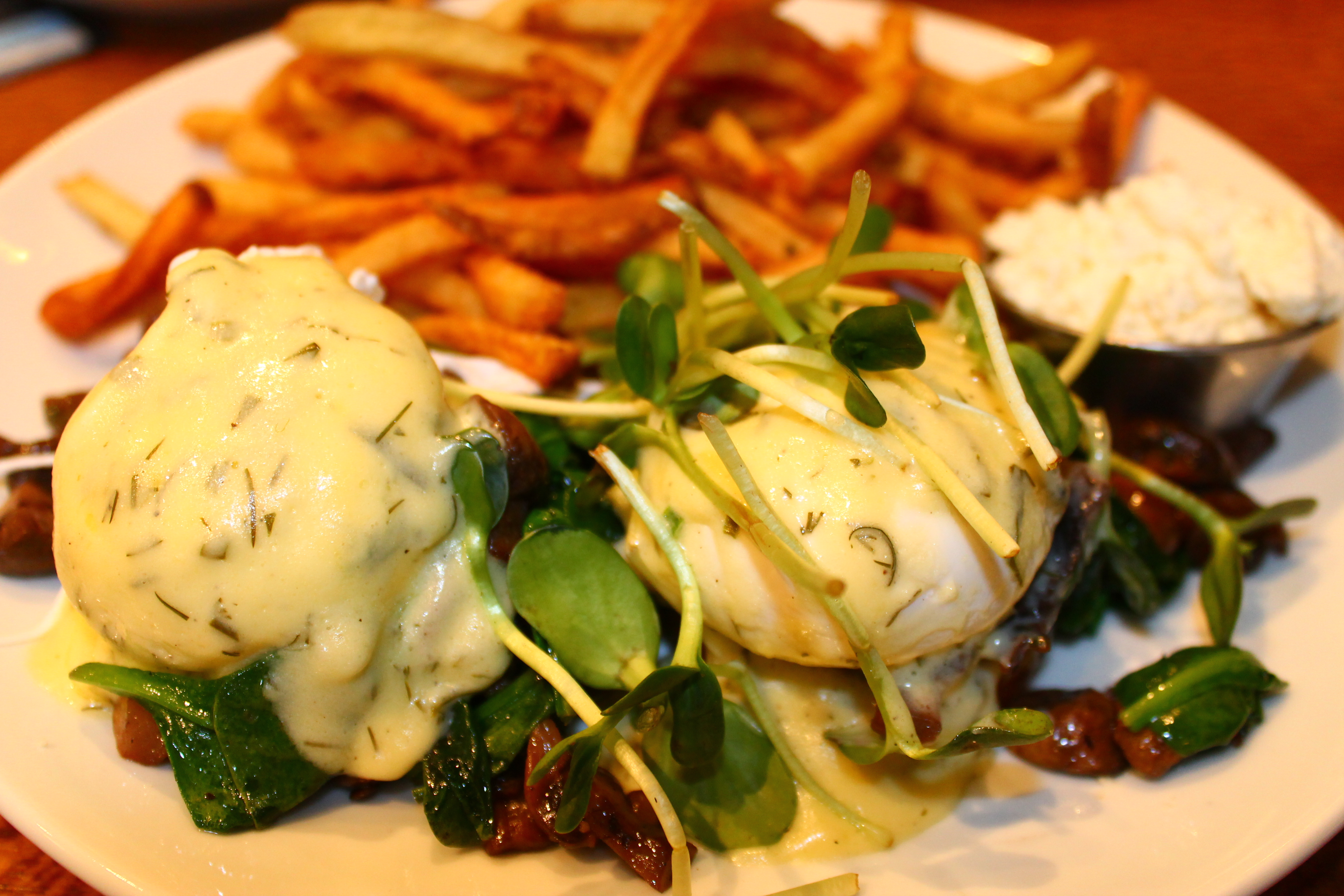 - Their Mushroom Benny owns my heart, and I am not even a vegetarian! (English muffin, caramelized onions, baby spinach, roasted mushrooms, poached organic eggs, house made hollandaise + choice of salad, frites, or Lola’s home fries $13)