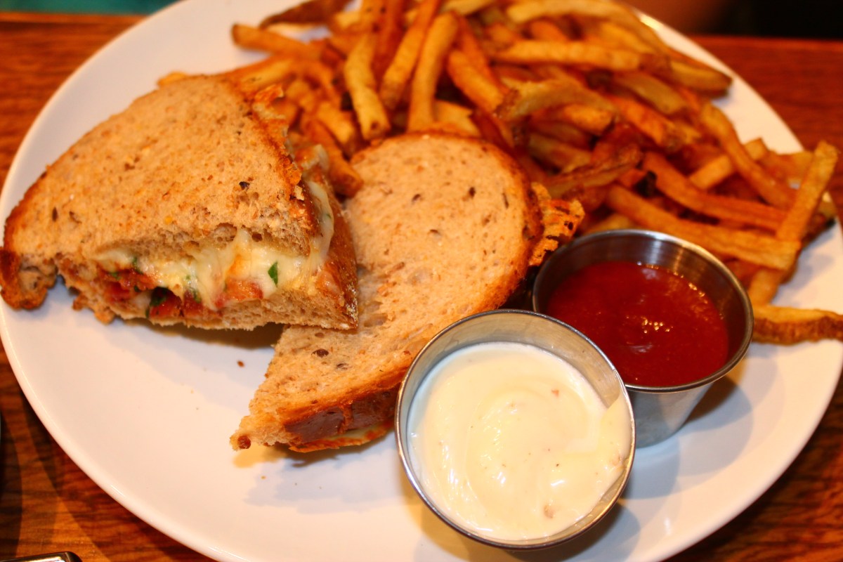 CROQUE CHAMPIGNON (VEG) Grilled portobello mushroom, caramelized onions, arugula, triple creme brie + organic sunny egg on grilled multigrain + frites $14.5