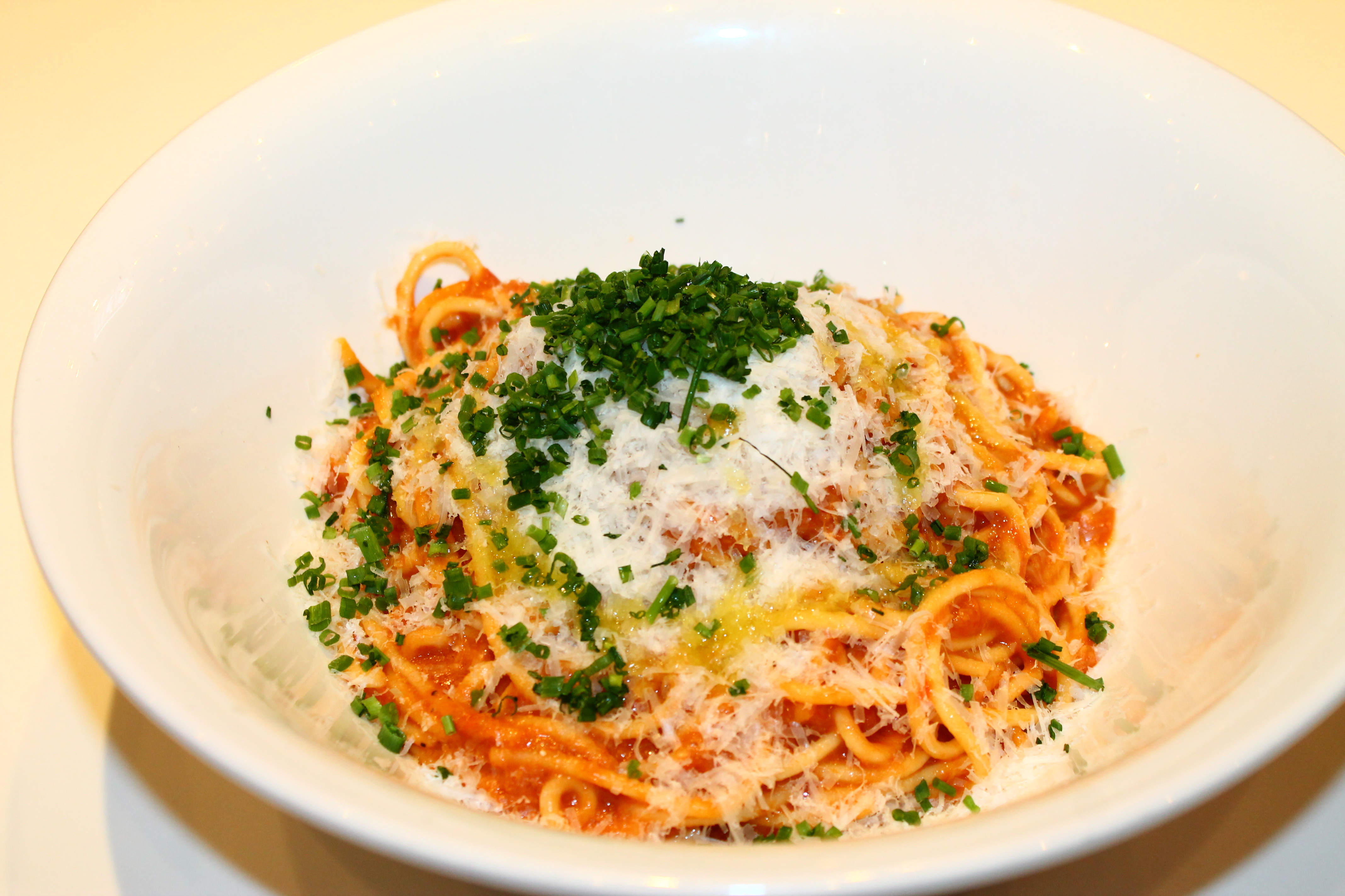 - Gluten free pasta with slow-braised beef ragu, grana padano, chives
