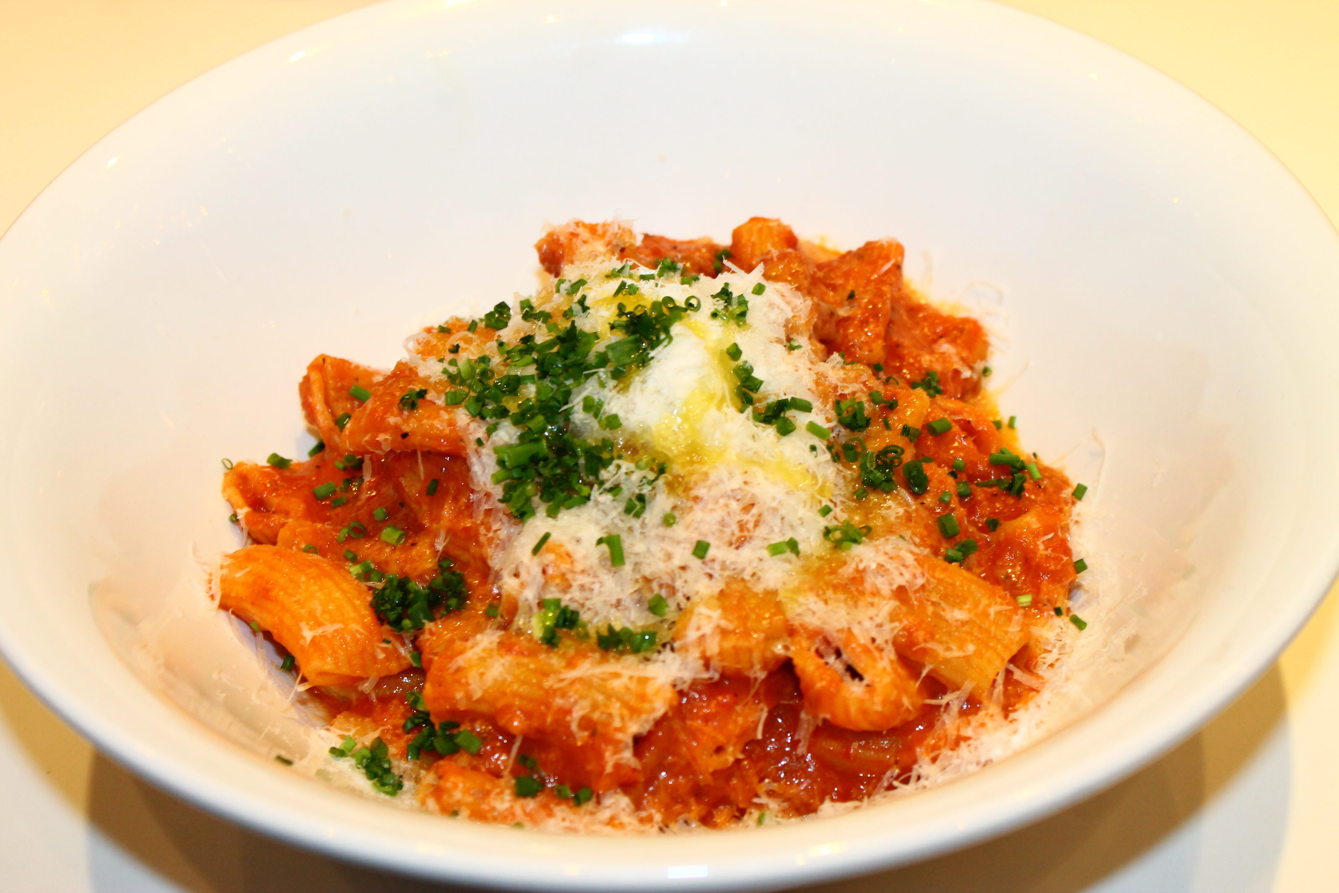 - Rigatoni made with slow-braised beef ragu, grana padano, chives