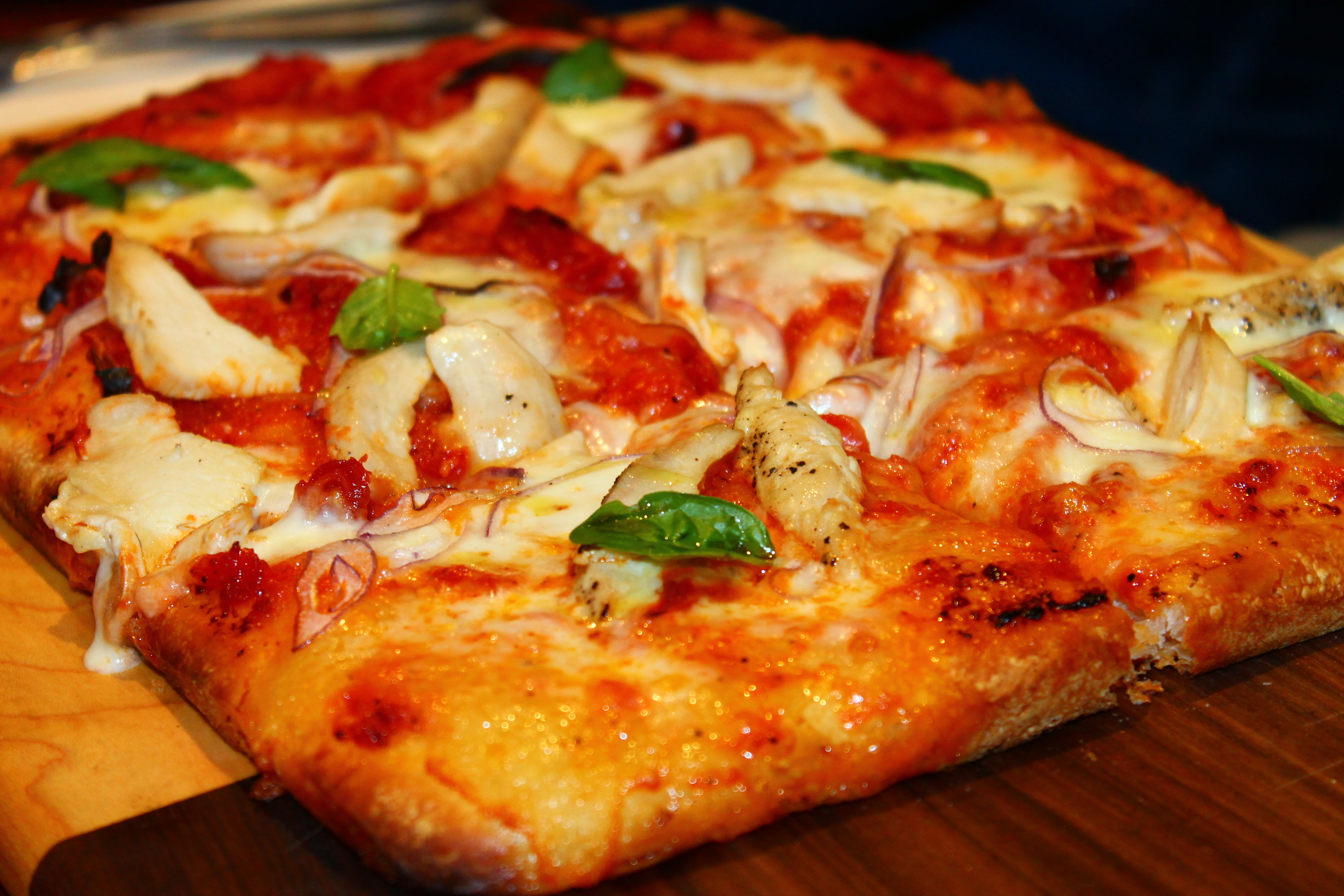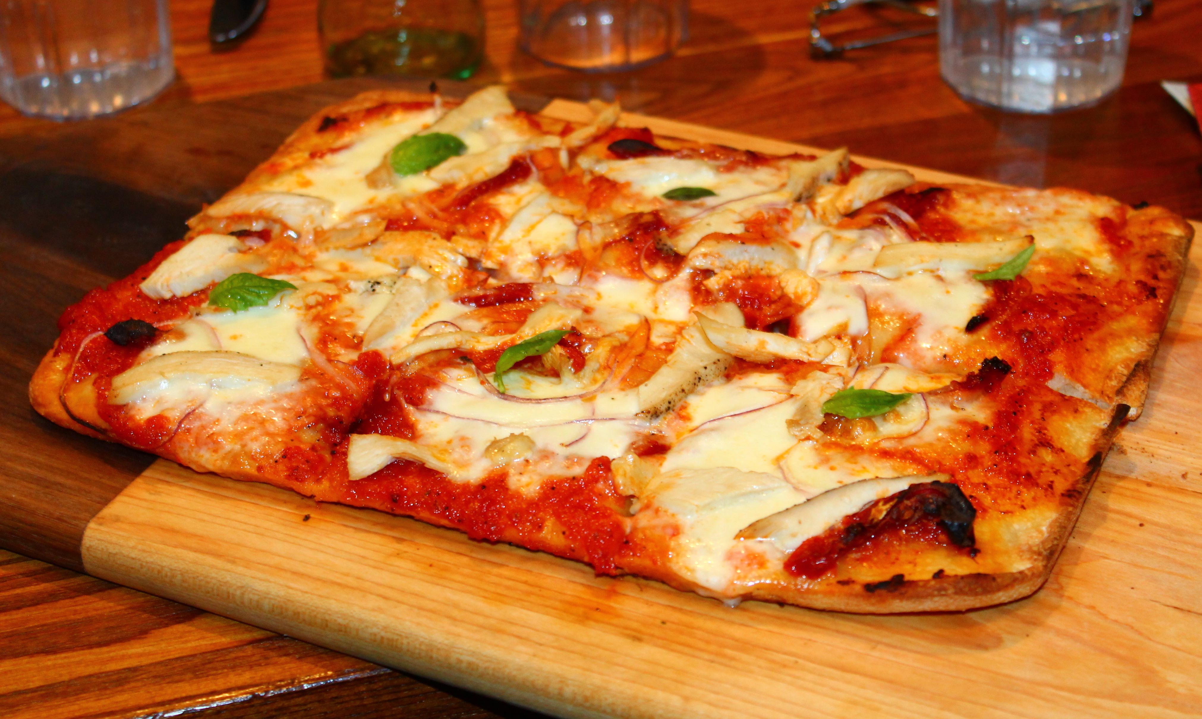 - Pollo Toscano made with all natural seasoned chicken breast, tomato pesto, Fior di Latte, red onion, sundried tomato, fresh basil