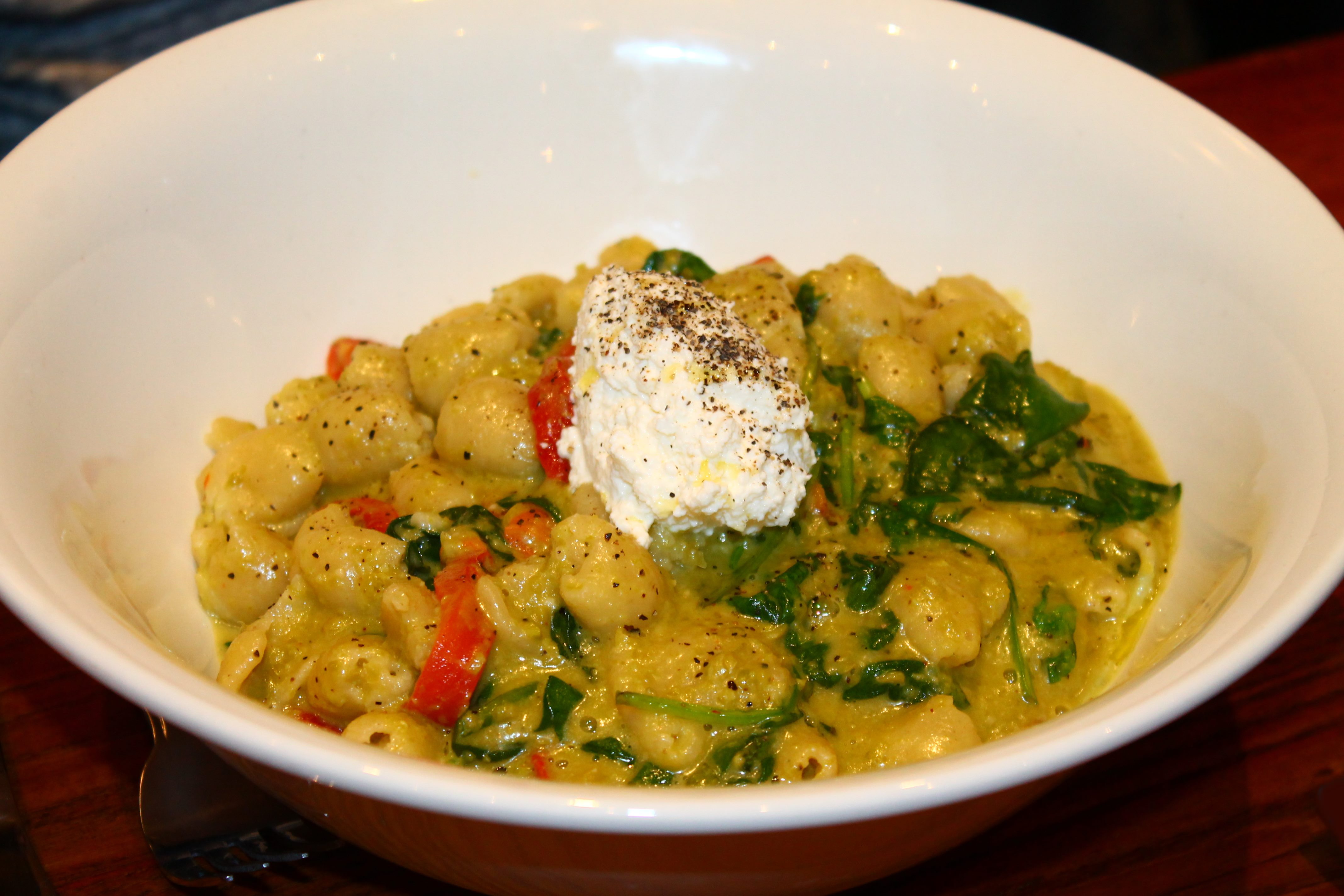 - Cavatelli made with pea pesto, roasted red pepper, baby spinach, white truffle oil, ricotta