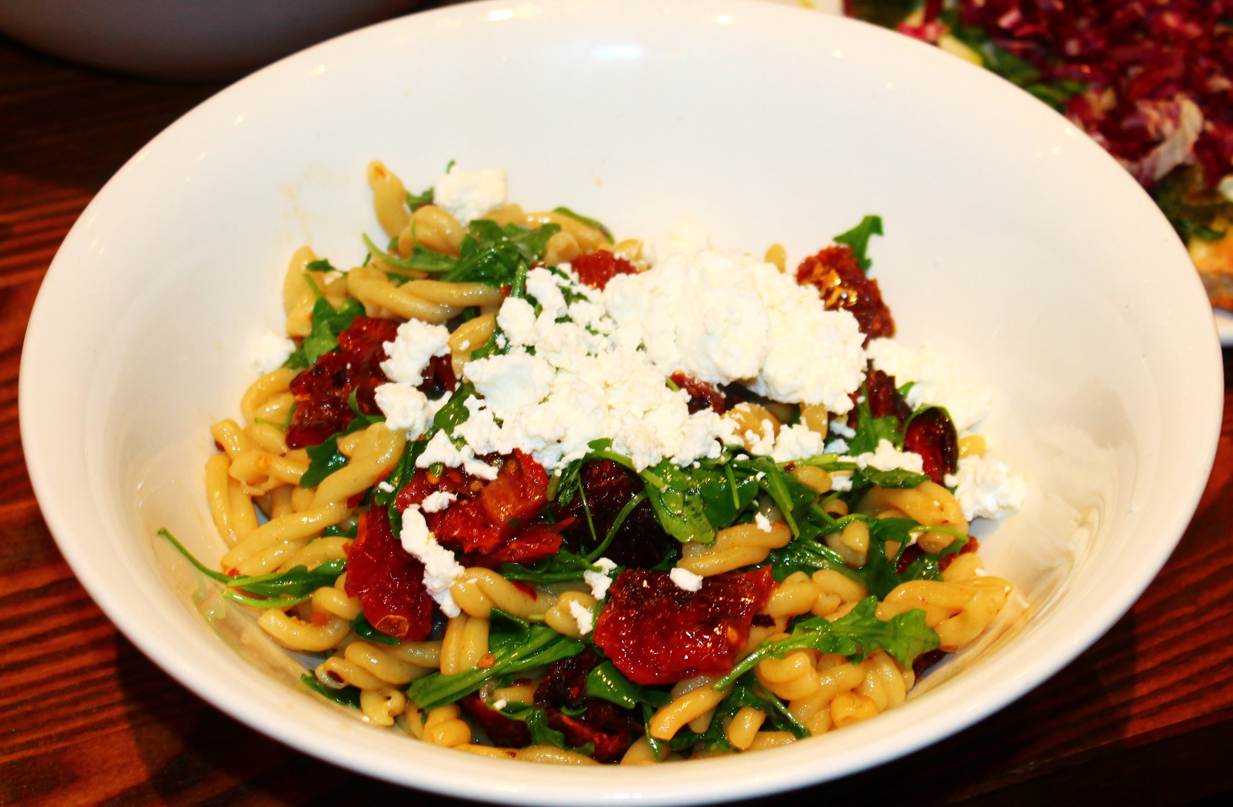 - Trecce made with garlic infused olive oil, chili flake, sundried tomato, goat’s cheese, arugula