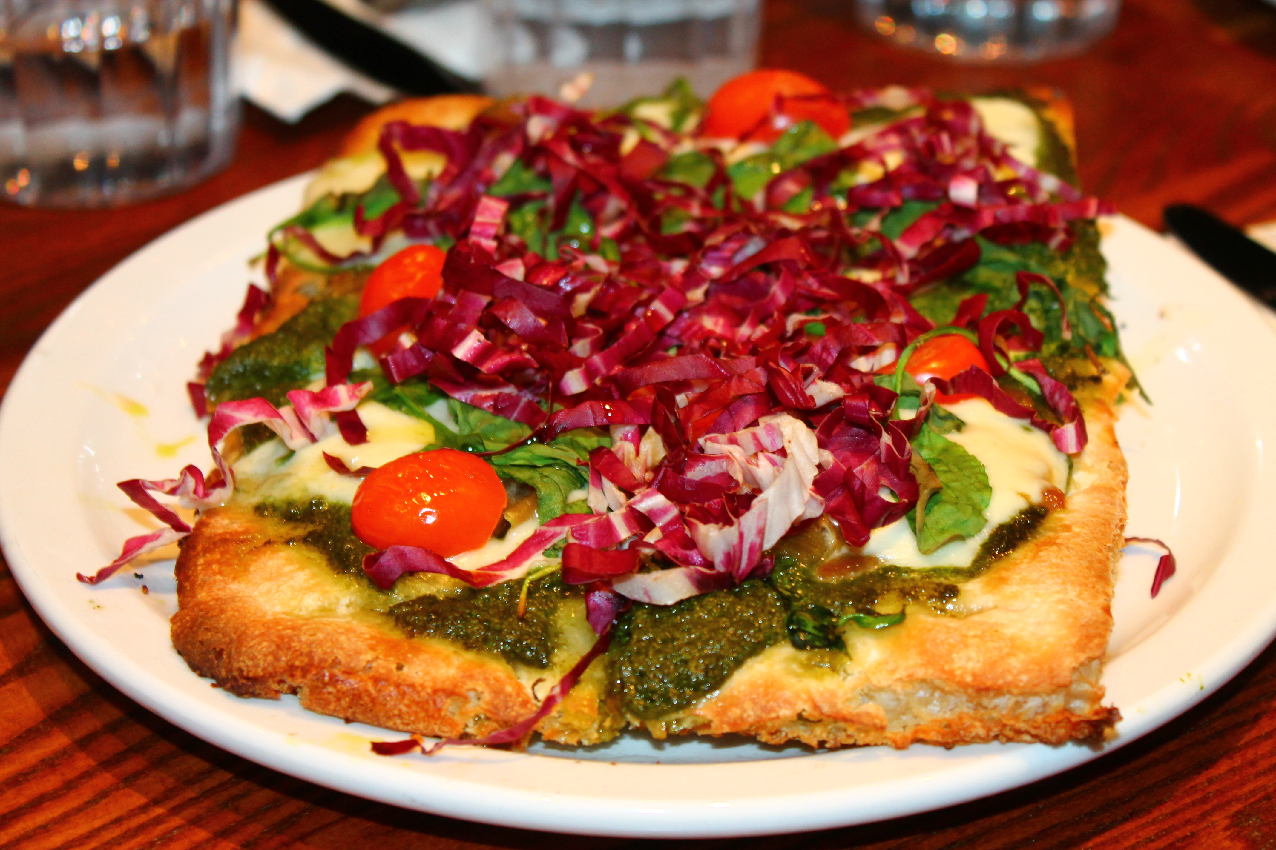 - Verde, made with basil pesto, cherry tomato, caramelized onions, baby spinach, radicchio, Fior di Latte