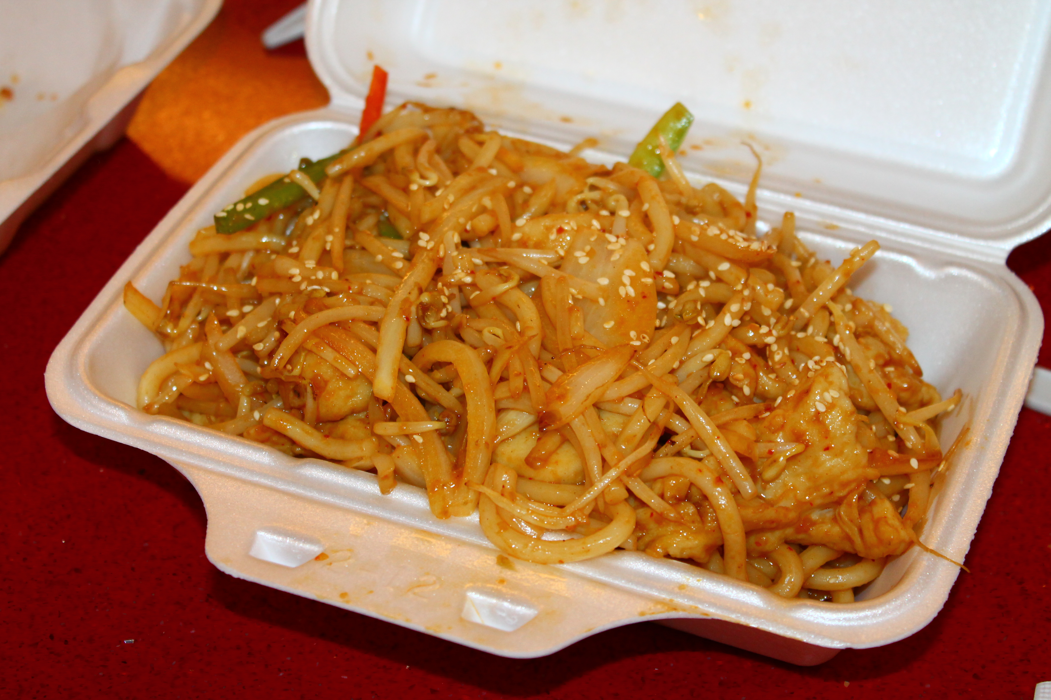- don noodles stir-fried with homemade sambal sauce, onion, fish balls, and chicken) $